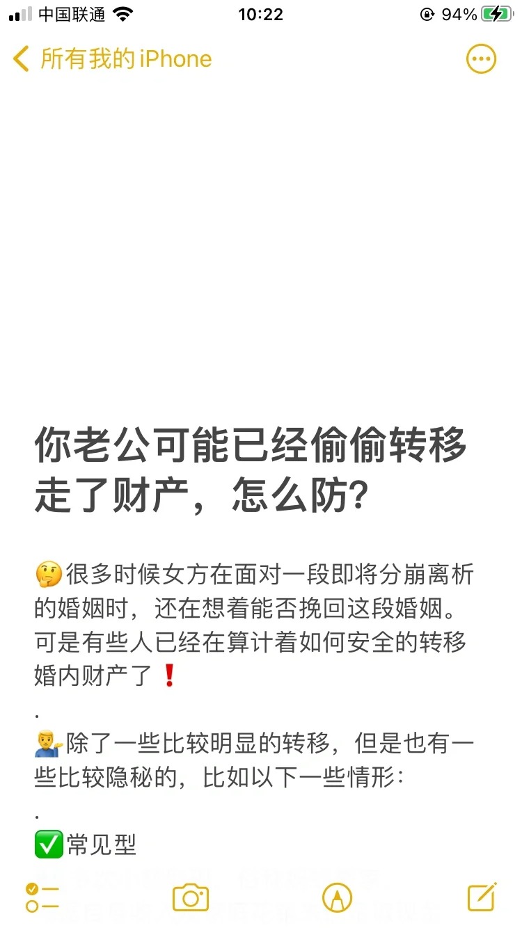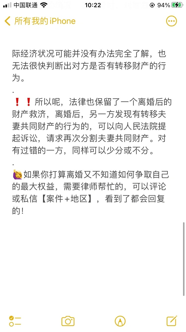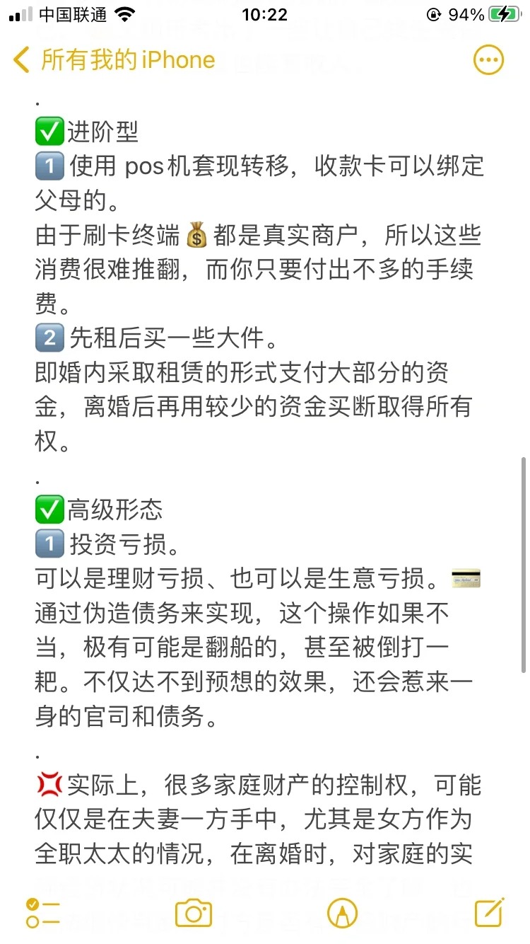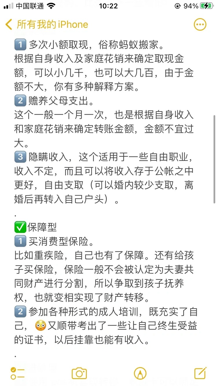 很多時(shí)候女方在面對一段即將分崩離析的婚姻時(shí),還在想著能否挽回這段婚姻??墒怯行┤艘呀?jīng)在算計(jì)著如何安全的轉(zhuǎn)移婚內(nèi)財(cái)產(chǎn)了 . 除了一些比較明顯的轉(zhuǎn)移,但是也有一些比較隱秘的,比如以下一些情形: . 常見型 1、多次小額取現(xiàn),俗稱螞蟻搬家。 根據(jù)自身收入及家庭花銷來確定取現(xiàn)金額,可以小幾千,也可以大幾百,由于金額不大,你有多種解釋方案。 2、贍養(yǎng)父母支出。 這個(gè)一般一個(gè)月一次,也是根據(jù)自身收入和家庭花銷來確定轉(zhuǎn)賬金額,金額不宜過大。 3、隱瞞收入,這個(gè)適用于一些自由職業(yè),收入不定,而且可以將收入存于公帳之中更好,自由支?。梢曰閮?nèi)較少支取,離婚后再轉(zhuǎn)入自己戶頭)。 . 保障型 1、買消費(fèi)型保險(xiǎn)。 比如重疾險(xiǎn),自己也有了保障。還有給孩子買保險(xiǎn),保險(xiǎn)一般不會被認(rèn)定為夫妻共同財(cái)產(chǎn)進(jìn)行分割,所以爭取到孩子撫養(yǎng)權(quán),也就變相實(shí)現(xiàn)了財(cái)產(chǎn)轉(zhuǎn)移。 2、參加各種形式的成人培訓(xùn),既充實(shí)了自己,又順帶考出了一些讓自己終生受益的證書,以后掛靠也能有收入。 . 進(jìn)階型 1、使用 pos機(jī)套現(xiàn)轉(zhuǎn)移,收款卡可以綁定父母的。 由于刷卡終端都是真實(shí)商戶,所以這些消費(fèi)很難推翻,而你只要付出不多的手續(xù)費(fèi)。 2、先租后買一些大件。 即婚內(nèi)采取租賃的形式支付大部分的資金,離婚后再用較少的資金買斷取得所有權(quán)。 . 高級形態(tài) 1、投資虧損。 可以是理財(cái)虧損、也可以是生意虧損。通過偽造債務(wù)來實(shí)現(xiàn),這個(gè)操作如果不當(dāng),極有可能是翻船的,甚至被倒打一耙。不僅達(dá)不到預(yù)想的效果,還會惹來一身的官司和債務(wù)。 . 實(shí)際上,很多家庭財(cái)產(chǎn)的控制權(quán),可能僅僅是在夫妻一方手中,尤其是女方作為全職太太的情況,在離婚時(shí),對家庭的實(shí)際經(jīng)濟(jì)狀況可能并沒有辦法完全了解,也無法很快判斷出對方是否有轉(zhuǎn)移財(cái)產(chǎn)的行為。 . 所以呢,法律也保留了一個(gè)離婚后的財(cái)產(chǎn)救濟(jì),離婚后,另一方發(fā)現(xiàn)有轉(zhuǎn)移夫妻共同財(cái)產(chǎn)的行為的,可以向人民法院提起訴訟,請求再次分割夫妻共同財(cái)產(chǎn)。對有過錯(cuò)的一方,同樣可以少分或不分。 如果你打算離婚又不知道如何爭取自己的最大權(quán)益,需要律師幫忙的,可以聯(lián)系平臺客服。