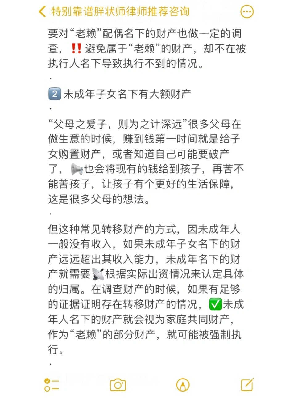 很多人說,我明知道他沒有錢,起訴了也得不到錢,還要再花訴訟成本,干脆不起訴了。其實(shí)這個(gè)想法是錯(cuò)誤的,起訴是必須要起訴的,不但要起訴,還要及時(shí)起訴確定債權(quán),拿到生效的法律文書,然后向法院申請(qǐng)強(qiáng)制執(zhí)行。 老賴家屬也可以用上強(qiáng)制執(zhí)行 1、夫妻共同財(cái)產(chǎn)登記在配偶名下 已經(jīng)生效的法律文書在申請(qǐng)強(qiáng)制執(zhí)行時(shí),執(zhí)行的是被執(zhí)行人名下的財(cái)產(chǎn)。而實(shí)踐中,存在有些家庭婚后在用夫妻共同財(cái)產(chǎn)購(gòu)置財(cái)產(chǎn)時(shí),只登記一方名字,若夫妻共同財(cái)產(chǎn)登記在“老賴”配偶名下,直接看“老賴”名下確實(shí)看不到財(cái)產(chǎn),那就需要對(duì)“老賴”配偶名下的財(cái)產(chǎn)也做一定的調(diào)查,避免屬于“老賴”的財(cái)產(chǎn),卻不在被執(zhí)行人名下導(dǎo)致執(zhí)行不到的情況。 2、未成年子女名下有大額財(cái)產(chǎn) “父母之愛子,則為之計(jì)深遠(yuǎn)”很多父母在做生意的時(shí)候,賺到錢第一時(shí)間就是給子女購(gòu)置財(cái)產(chǎn),或者知道自己可能要破產(chǎn)了,也會(huì)將現(xiàn)有的錢給到孩子,再苦不能苦孩子,讓孩子有個(gè)更好的生活保障,這是很多父母的想法。 但這種常見轉(zhuǎn)移財(cái)產(chǎn)的方式,因未成年人一般沒有收入,如果未成年子女名下的財(cái)產(chǎn)遠(yuǎn)遠(yuǎn)超出其收入能力,未成年名下的財(cái)產(chǎn)就需要根據(jù)實(shí)際出資情況來認(rèn)定具體的歸屬。在調(diào)查財(cái)產(chǎn)的時(shí)候,如果有足夠的證據(jù)證明存在轉(zhuǎn)移財(cái)產(chǎn)的情況,未成年人名下的財(cái)產(chǎn)就會(huì)視為家庭共同財(cái)產(chǎn),作為“老賴”的部分財(cái)產(chǎn),就可能被強(qiáng)制執(zhí)行。 3、將財(cái)產(chǎn)惡意轉(zhuǎn)給他人 被執(zhí)行人將財(cái)產(chǎn)無(wú)償贈(zèng)與他人,或者將財(cái)產(chǎn)低價(jià)賣給他人,?或者放棄到期債權(quán),這是實(shí)踐中比較常見的轉(zhuǎn)移財(cái)產(chǎn)的方式。在調(diào)查財(cái)產(chǎn)時(shí)發(fā)現(xiàn)這種情況,對(duì)于被執(zhí)行人怠于行使對(duì)第三人享有的到期債權(quán),執(zhí)行人可以以自己的名義代為行使被執(zhí)行人對(duì)第三人對(duì)債權(quán)的權(quán)利。 4、借的錢用于家庭共同生活 夫妻兩人婚姻存續(xù)期間所欠的債務(wù),如果借款后用于家庭共同生活,即使只是以個(gè)人名義所借的款,也屬于夫妻共同債務(wù),需要夫妻雙方共同償還 在這里也提醒下各位朋友,出借資金時(shí),若知道借款人已經(jīng)結(jié)婚,最好讓夫妻雙方都簽字。如果有這方面需求可以聯(lián)系平臺(tái)客服。