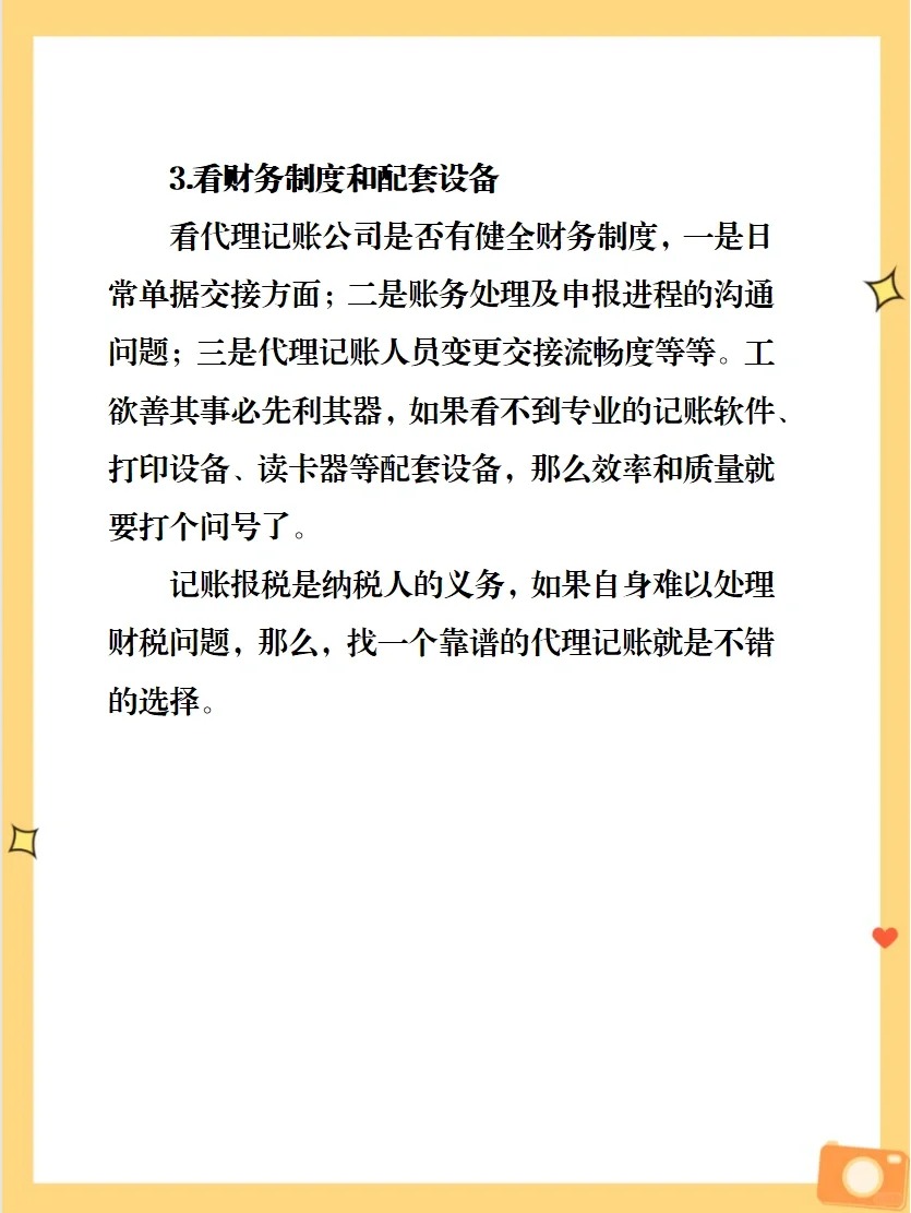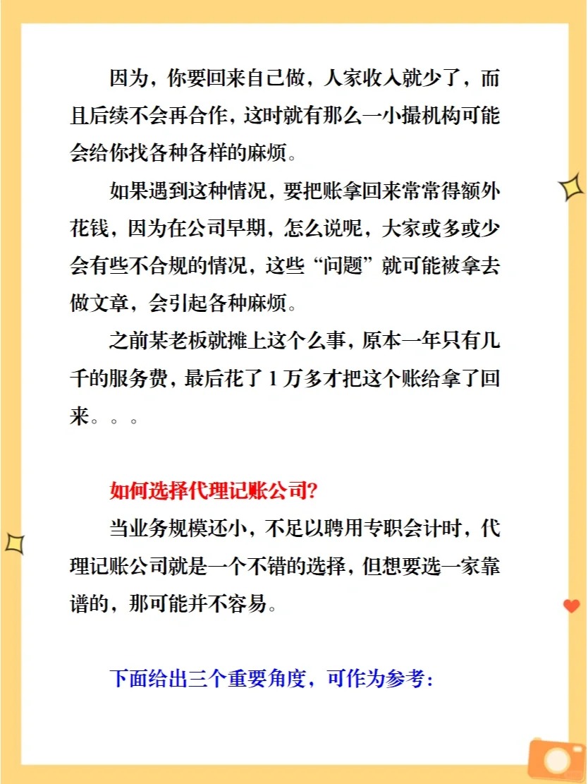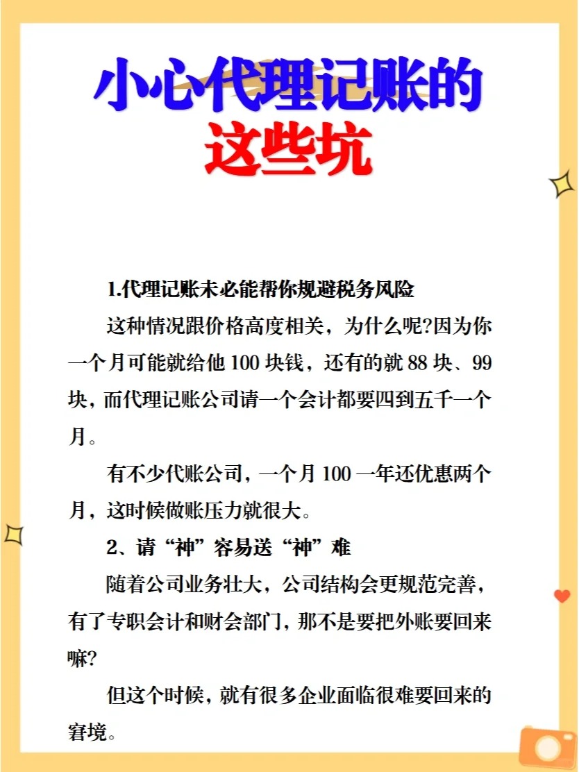 1.代理記賬未必能幫你規(guī)避稅務(wù)風險 這種情況跟價格高度相關(guān),為什么呢?因為你一個月可能就給他100塊錢,還有的就88塊、99塊,而代理記賬公司請一個會計都要四到五千一個月。 有不少代賬公司,一個月100一年還優(yōu)惠兩個月,這時候做賬壓力就很大。 2、請“神”容易送“神”難 隨著公司業(yè)務(wù)壯大,公司結(jié)構(gòu)會更規(guī)范完善,有了專職會計和財會部門,那不是要把外賬要回來嘛? 但這個時候,就有很多企業(yè)面臨很難要回來的窘境。 因為,你要回來自己做,人家收入就少了,而且后續(xù)不會再合作,這時就有那么一小撮機構(gòu)可能會給你找各種各樣的麻煩。 如果遇到這種情況,要把賬拿回來常常得額外花錢,因為在公司早期,怎么說呢,大家或多或少會有些不合規(guī)的情況,這些“問題”就可能被拿去做文章,會引起各種麻煩。 如何選擇代理記賬公司? 當業(yè)務(wù)規(guī)模還小,不足以聘用專職會計時,代理記賬公司就是一個不錯的選擇,但想要選一家靠譜的,那可能并不容易。 下面給出三個重要角度,可作為參考: 1.看價格,但不要貪圖便宜z 選擇代理記賬公司時,價格是個很重要的因素,但不能一味貪圖便宜。過于便宜,代理記賬公司為了壓縮成本,必然會找一些剛畢業(yè)的大學(xué)生或沒有經(jīng)驗的會計,于是在賬務(wù)處理及納稅申報上很可能會不專業(yè)且不負責,萬一出了問題最后坑得還是自己。 選擇代理記賬機構(gòu),不花冤枉錢就可以了,沒必要一味追求便宜,最后貪小便宜吃大虧。 2.相比于規(guī)模,“硬實力”更重要 規(guī)模大,裝潢好等看似“高大上”的要素很容易忽悠人, 很多所謂高大上的代賬機構(gòu),可能看上去人很多,但如果大部分都是銷售,那么該公司提供專業(yè)財稅服務(wù)的人其實并不多,專業(yè)程度可能就不夠硬了。 3.看財務(wù)制度和配套設(shè)備 看代理記賬公司是否有健全財務(wù)制度,一是日常單據(jù)交接方面;二是賬務(wù)處理及申報進程的溝通問題;三是代理記賬人員變更交接流暢度等等。工欲善其事必先利其器,如果看不到專業(yè)的記賬軟件、打印設(shè)備、讀卡器等配套設(shè)備,那么效率和質(zhì)量就要打個問號了。 記賬報稅是納稅人的義務(wù),如果自身難以處理財稅問題,那么,找一個靠譜的代理記賬就是不錯的選擇。