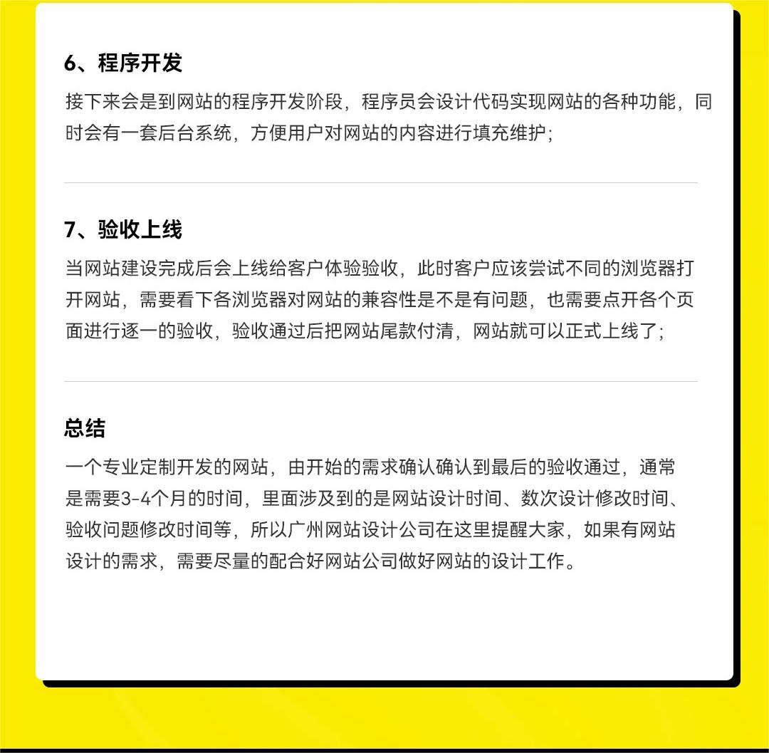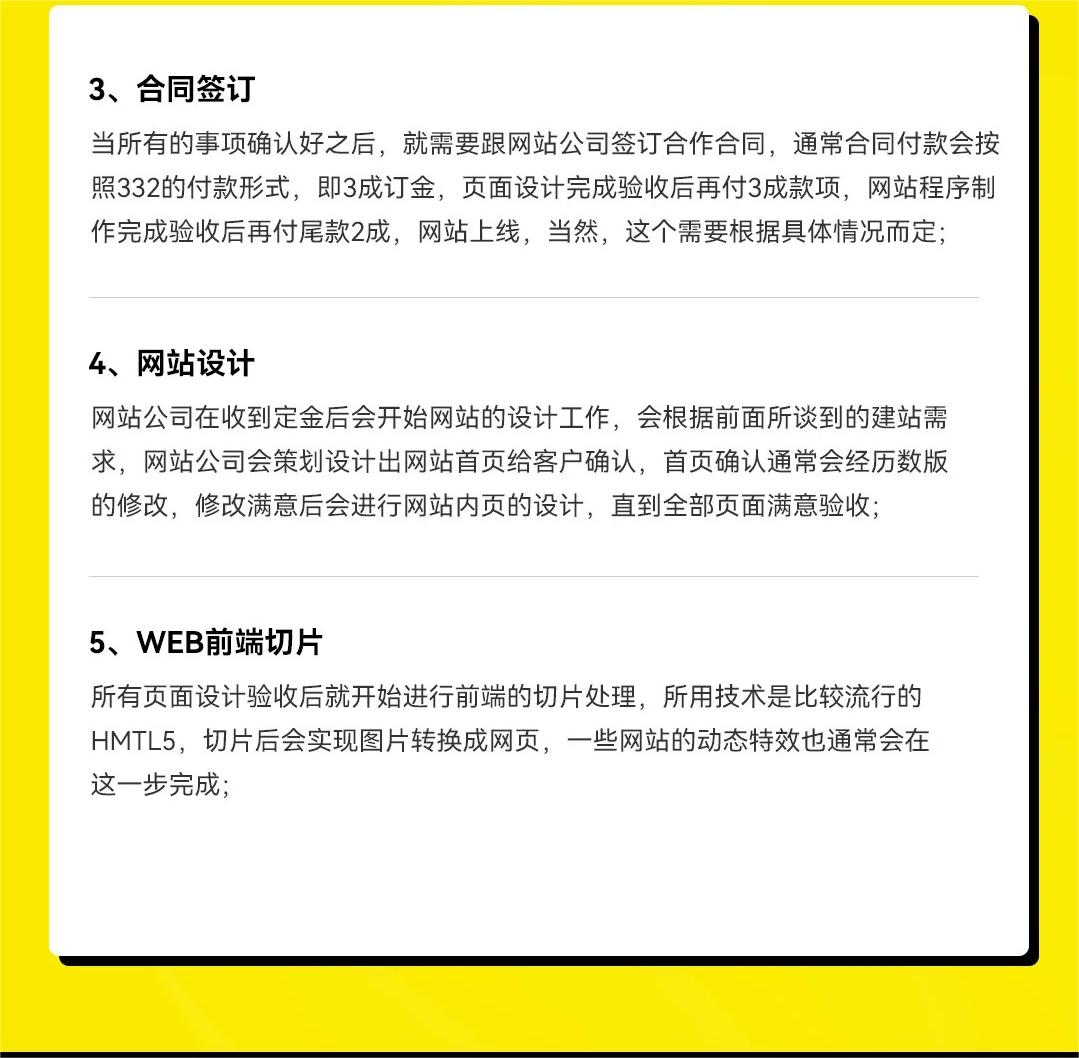 1、建站需求 在網(wǎng)站制作之前,網(wǎng)站設(shè)計(jì)公司跟企業(yè)溝通交流網(wǎng)站的需求是必不可少的部分,因?yàn)橐话闫髽I(yè)在需要制作網(wǎng)站之前都會(huì)有想法,網(wǎng)站建設(shè)公司只需跟企業(yè)溝通梳理,并給出建議即可,通常這部分在一天內(nèi)完成; 2、網(wǎng)站報(bào)價(jià)與制作周期 當(dāng)網(wǎng)站建設(shè)公司確認(rèn)好企業(yè)需求以后,網(wǎng)站建設(shè)公司會(huì)根據(jù)企業(yè)的需求,核算出網(wǎng)站制作所需要的工作量和費(fèi)用,然后會(huì)給企業(yè)出一個(gè)制作周期與制作的費(fèi)用報(bào)價(jià); 3、合同簽訂 當(dāng)所有的事項(xiàng)確認(rèn)好之后,就需要跟網(wǎng)站公司簽訂合作合同,通常合同付款會(huì)按照332的付款形式,即3成訂金,頁面設(shè)計(jì)完成驗(yàn)收后再付3成款項(xiàng),網(wǎng)站程序制作完成驗(yàn)收后再付尾款2成,網(wǎng)站上線,當(dāng)然,這個(gè)需要根據(jù)具體情況而定; 4、網(wǎng)站設(shè)計(jì) 網(wǎng)站公司在收到定金后會(huì)開始網(wǎng)站的設(shè)計(jì)工作,會(huì)根據(jù)前面所談到的建站需求,網(wǎng)站公司會(huì)策劃設(shè)計(jì)出網(wǎng)站首頁給客戶確認(rèn),首頁確認(rèn)通常會(huì)經(jīng)歷數(shù)版的修改,修改滿意后會(huì)進(jìn)行網(wǎng)站內(nèi)頁的設(shè)計(jì),直到全部頁面滿意驗(yàn)收; 5、WEB前端切片 所有頁面設(shè)計(jì)驗(yàn)收后就開始進(jìn)行前端的切片處理,所用技術(shù)是比較流行的HMTL5,切片后會(huì)實(shí)現(xiàn)圖片轉(zhuǎn)換成網(wǎng)頁,一些網(wǎng)站的動(dòng)態(tài)特效也通常會(huì)在這一步完成; 6、程序開發(fā) 接下來會(huì)是到網(wǎng)站的程序開發(fā)階段,程序員會(huì)設(shè)計(jì)代碼實(shí)現(xiàn)網(wǎng)站的各種功能,同時(shí)會(huì)有一套后臺(tái)系統(tǒng),方便用戶對(duì)網(wǎng)站的內(nèi)容進(jìn)行填充維護(hù); 7、驗(yàn)收上線 當(dāng)網(wǎng)站建設(shè)完成后會(huì)上線給客戶體驗(yàn)驗(yàn)收,此時(shí)客戶應(yīng)該嘗試不同的瀏覽器打開網(wǎng)站,需要看下各瀏覽器對(duì)網(wǎng)站的兼容性是不是有問題,也需要點(diǎn)開各個(gè)頁面進(jìn)行逐一的驗(yàn)收,驗(yàn)收通過后把網(wǎng)站尾款付清,網(wǎng)站就可以正式上線了;