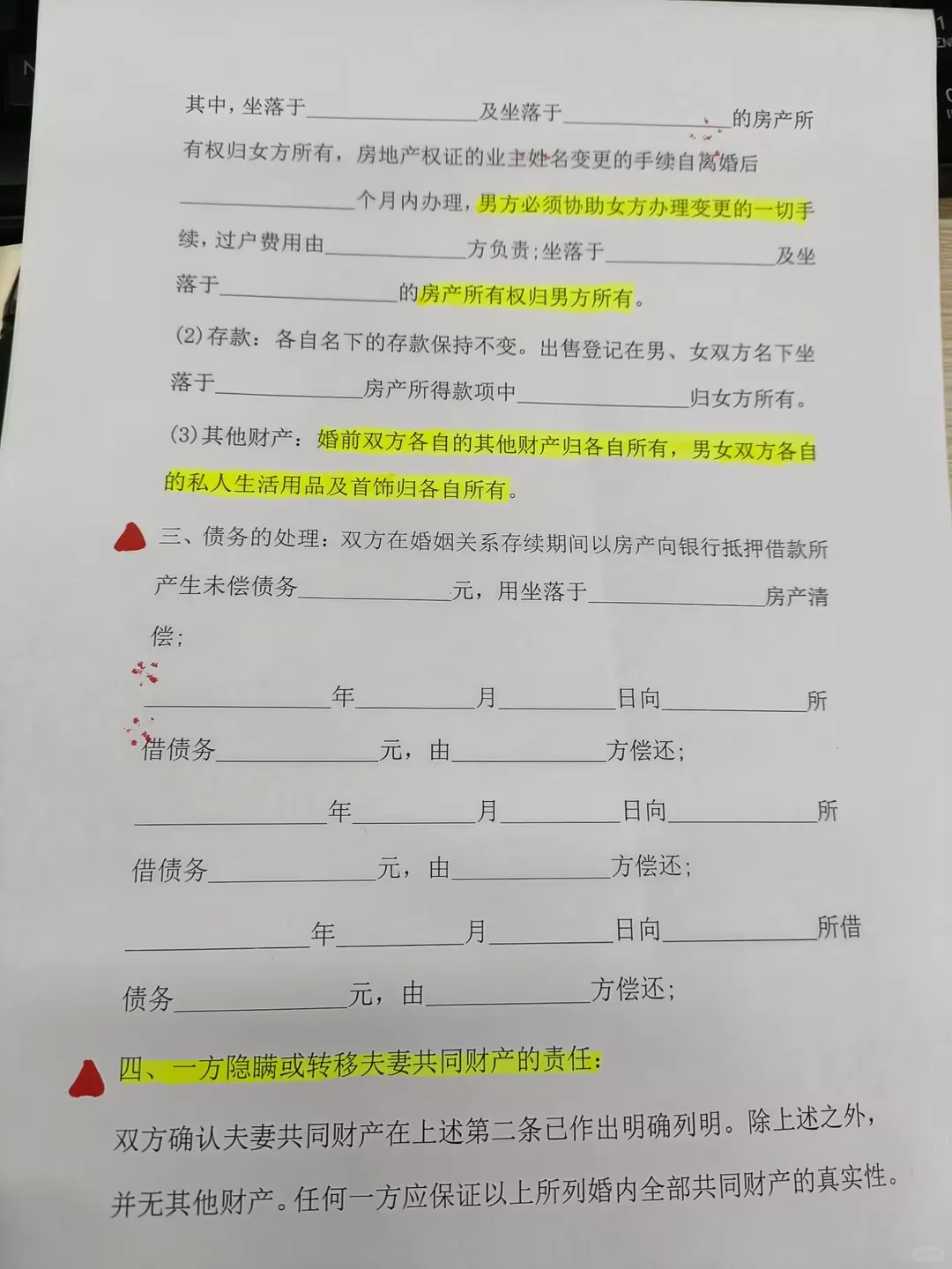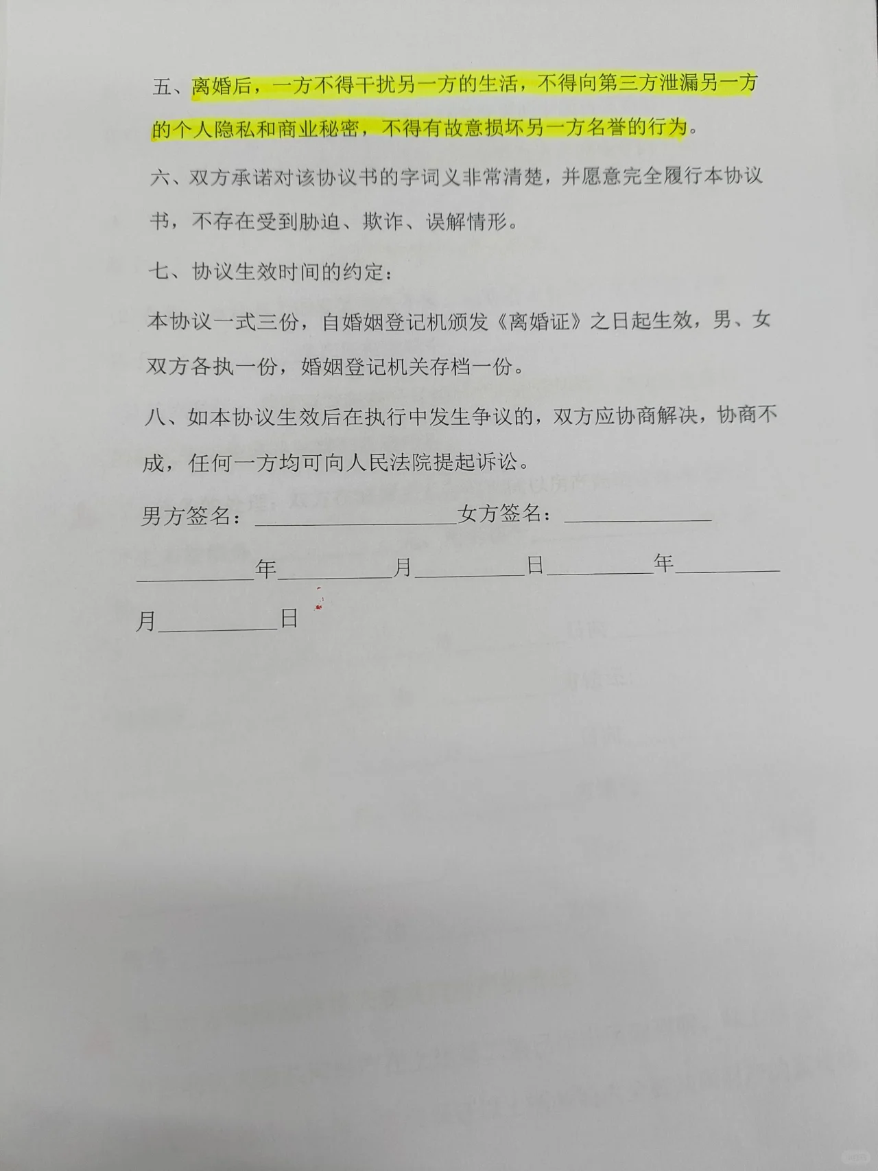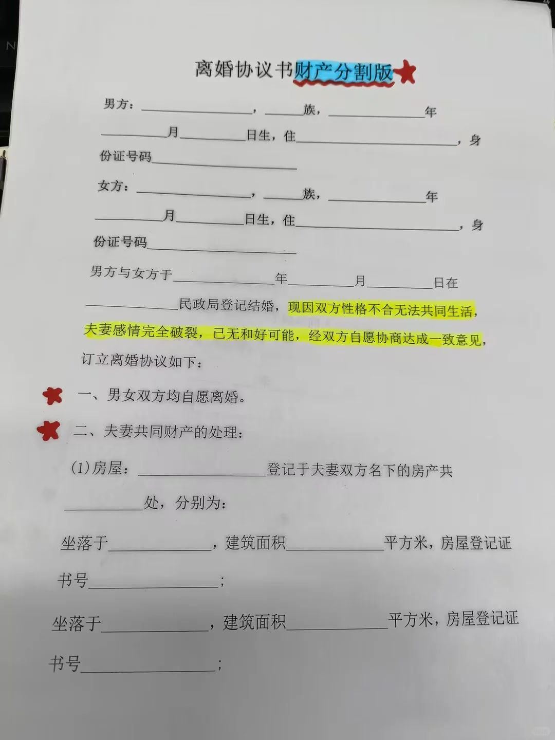 是否有詳細的離婚協(xié)議流程?(附離婚協(xié)議和財產(chǎn)分割協(xié)議第2-4頁,需粗線) ? 如果你和你的另一半決定分手,我希望這封信能幫助你更順利地完成離婚過程。 一?? 首先,確認你的離婚意向,并準備好你的戶口、身份證和結(jié)婚證。記住,你可以在沒有離婚協(xié)議的情況下第一次去民政局,因為還有冷靜期。 二?? 在民政局,工作人員可能會詢問您是否需要調(diào)解。在這一點上,堅定地告訴他們你已經(jīng)仔細考慮過了~ 三?? 如果你帶了離婚協(xié)議書,工作人員會指出需要按照民政局的統(tǒng)一格式進行修改。從標點符號到格式化的段落,它們應該是相同的。(如果你需要離婚協(xié)議格式,記得在PL部分告訴我。) 四?? 申請當天,您將收到一張收據(jù),這是非常重要的。它顯示了申請日期,冷卻期為自申請日期起30天。記得保管好雙方的收據(jù)。 五?? 等到冷靜期結(jié)束后,選擇一個工作日到民政局辦理正式離婚手續(xù)。確保雙方都在場,并提前安排好時間。如果任何一方未出席或期滿,則視為放棄離婚。 六?? 這次我需要帶到民政局的東西是: 雙方兩寸單人身份證照片 雙方結(jié)婚證、戶口本、身份證 ? 《離婚登記申請受理回執(zhí)表》 ? 離婚協(xié)議:必須包括在內(nèi),否則無法處理。記住,這是機器打字,不能手寫! 如果有財產(chǎn)分割,還應提交所有附屬證書,如財產(chǎn)所有權(quán)證書。 七?? 協(xié)議確認無誤后,男女雙方應做好記錄,并在離婚協(xié)議和離婚登記表上簽字。工作人員將對協(xié)議內(nèi)容進行審查,如果不規(guī)范,將要求他們進行現(xiàn)場修改。 ? 審查通過后,協(xié)議一式三份,各一份在民政局備案,其他雙方各一份。最后,你將收到離婚證書!
