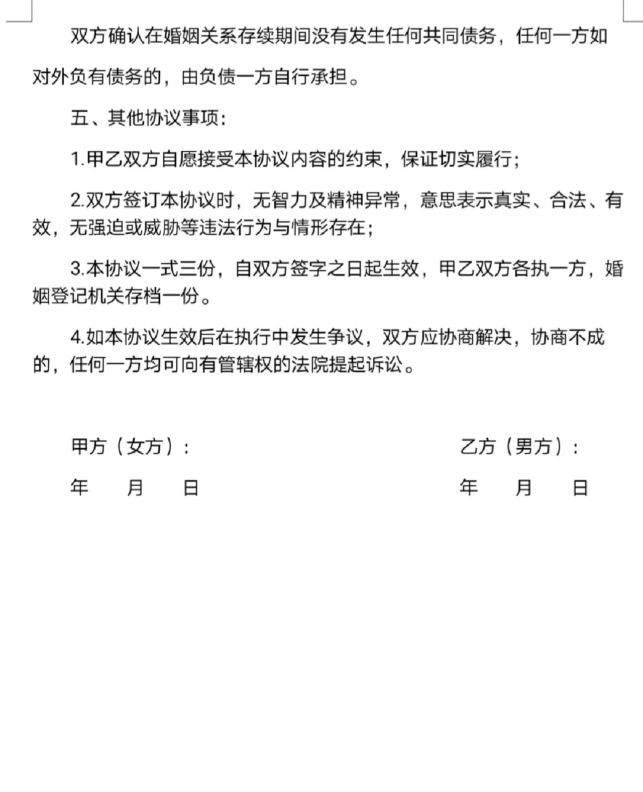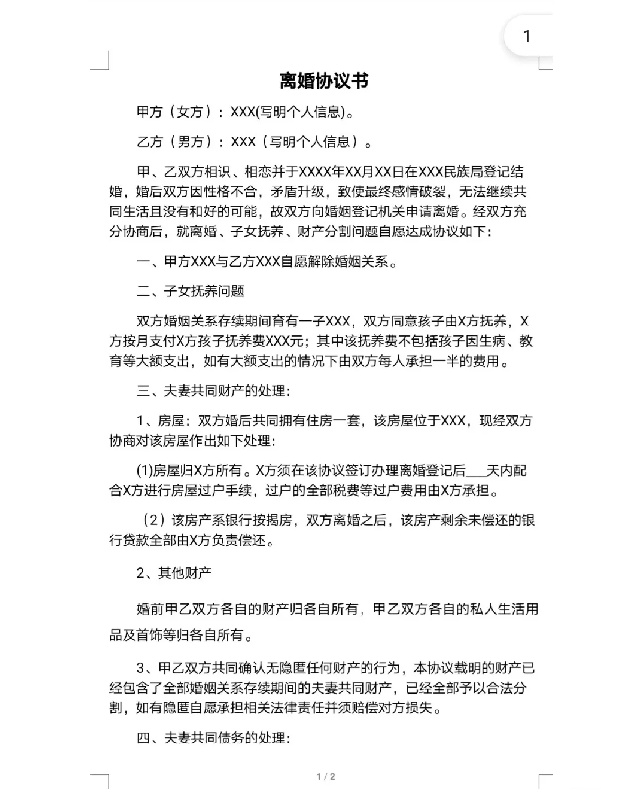 甲方(女):XXX(注明個(gè)人信息)。 乙方(男):XXX(注明個(gè)人信息)。 甲乙雙方于XXXX年XX月XX日在XXX市民政局登記結(jié)婚。然而,由于性格差異和不斷升級(jí)的沖突,他們的關(guān)系最終破裂,如果沒有和解的可能性,他們無法繼續(xù)生活在一起。因此,雙方當(dāng)事人向婚姻登記機(jī)關(guān)申請(qǐng)離婚。經(jīng)雙方充分協(xié)商,就離婚、子女監(jiān)護(hù)、財(cái)產(chǎn)分割等事項(xiàng)自愿達(dá)成如下協(xié)議: 1、 甲方XXX與乙方XXX自愿解除婚姻關(guān)系。 2、 育兒問題 婚姻關(guān)系存續(xù)期間,雙方育有一子,取名XXX。雙方同意由X方撫養(yǎng)子女,X方每月向X方支付子女撫養(yǎng)費(fèi)XXX元;撫養(yǎng)費(fèi)不包括孩子的疾病或教育等重大費(fèi)用。如發(fā)生重大費(fèi)用,雙方各承擔(dān)一半費(fèi)用。 3、 配偶共同財(cái)產(chǎn)的處理: 一?? 房屋:結(jié)婚后,雙方共同擁有位于XXX的房屋一套。經(jīng)協(xié)商,該房屋采取以下措施: (1) 該房屋歸X方所有,X方應(yīng)配合X方于本協(xié)議簽訂后__日內(nèi)辦理房屋過戶手續(xù),辦理離婚登記。與轉(zhuǎn)讓相關(guān)的所有稅費(fèi)應(yīng)由X方承擔(dān)。 (2) 該房產(chǎn)為銀行抵押房產(chǎn)。雙方離婚后,該房產(chǎn)剩余未償還的銀行貸款由X全額償還。 二?? 其他財(cái)產(chǎn) 婚前,雙方財(cái)產(chǎn)歸對(duì)方所有,個(gè)人生活用品和珠寶首飾歸對(duì)方所有。 三?? 雙方,田,已共同確認(rèn)不存在財(cái)產(chǎn)隱性損失。本協(xié)議約定的財(cái)產(chǎn)已依法分割,包括夫妻在婚姻關(guān)系存續(xù)期間的全部共同財(cái)產(chǎn) 如有隱瞞,自愿承擔(dān)相關(guān)法律責(zé)任,并賠償對(duì)方損失。 4、 夫妻共同債務(wù)的處理:婚姻關(guān)系存續(xù)期間雙方的確認(rèn)?未發(fā)生共同債務(wù),任何一方均應(yīng) 有外債的,由債務(wù)人自行承擔(dān)。 5、 其他協(xié)議事項(xiàng): 一?? 甲乙雙方自愿接受本協(xié)議內(nèi)容的約束,并保證以下各項(xiàng)的有效履行: 二?? 雙方簽署本協(xié)議時(shí),不存在智力或精神異常,意思表示真實(shí)、合法、有效,不存在脅迫、威脅等違法行為或情形: 三?? 本協(xié)議一式三份,自雙方簽字之日起生效。雙方各持一份,婚姻登記機(jī)關(guān)備案一份。 四?? 本協(xié)議生效后,在執(zhí)行過程中如發(fā)生爭議,雙方應(yīng)協(xié)商解決。如果協(xié)商不成,任何一方都可以向有管轄權(quán)的法院提起訴訟。