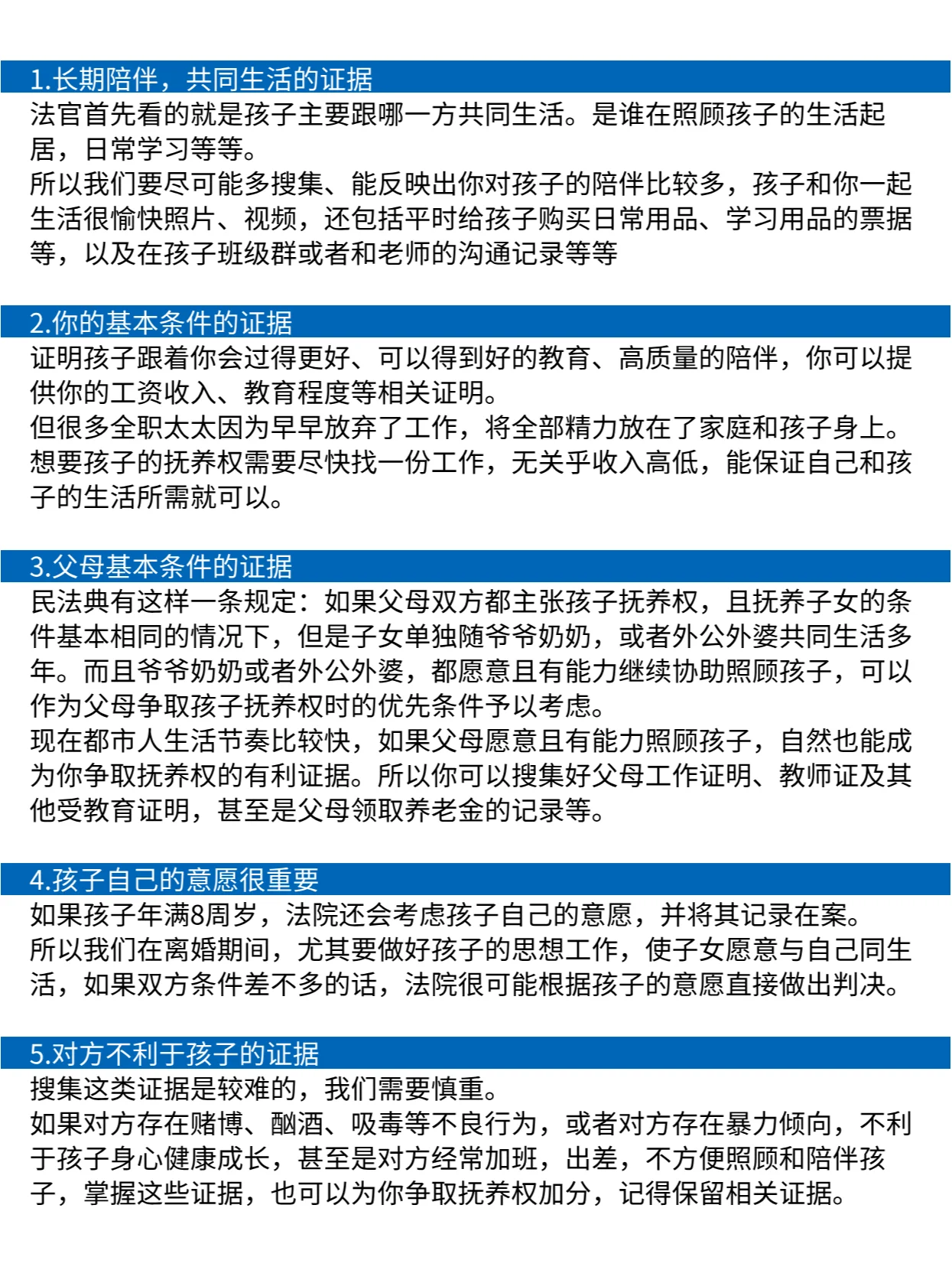 首先,我們需要澄清的是,兒童的監(jiān)護(hù)權(quán)并不能保證由經(jīng)濟(jì)條件好的人獲得。 ? 我曾經(jīng)接手過一個(gè)相關(guān)的案件,那個(gè)男人偷偷地把孩子藏起來,拒絕了那個(gè)女人的來訪。這個(gè)女人沒有看到孩子,把他托付給我們將近一年了。后來,當(dāng)律師在法庭上出示大量證據(jù)時(shí),他最終幫助委托人獲得了孩子的監(jiān)護(hù)權(quán)。 ?? 只有圍繞這5點(diǎn)收集證據(jù),才能獲得孩子監(jiān)護(hù)權(quán)的可能性更大。 ? 1.長期陪伴和共同生活的證據(jù) ? 2.你的基本情況證明 ? 3.父母基本情況證明 ? 4.孩子自己的愿望很重要 ? 5.對(duì)方對(duì)孩子不利的證據(jù) 一旦確定監(jiān)護(hù)權(quán),就無法輕易更改? 所以,我們還是希望大家做好準(zhǔn)備,?如果離婚涉及財(cái)產(chǎn)分割和撫養(yǎng)權(quán)糾紛,是否需要委托專業(yè)律師處理?在未來的平臺(tái)上留言,我會(huì)根據(jù)每個(gè)人的喜好推薦城市!