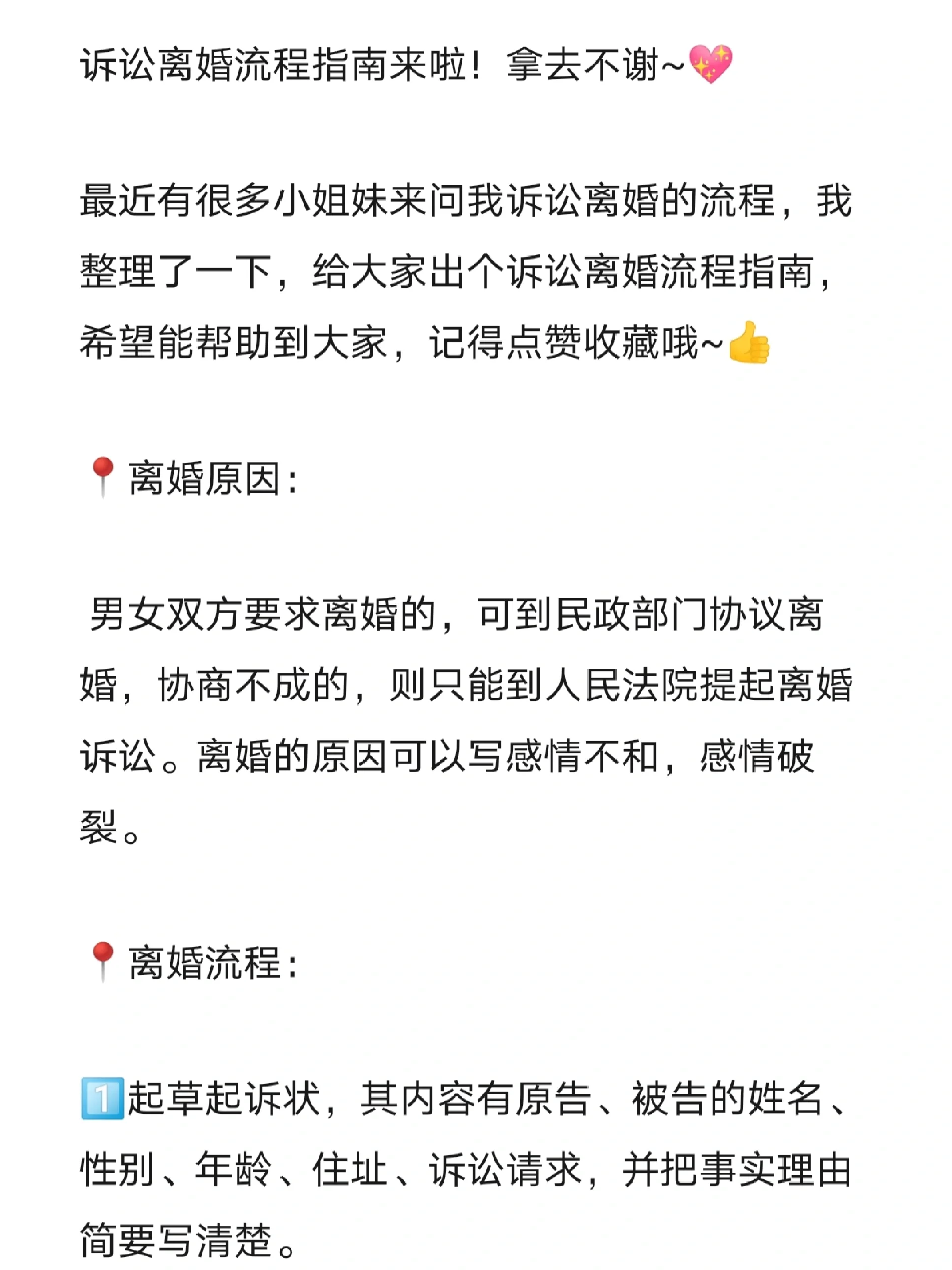 以下是離婚流程指南!拿著,謝謝~? 最近,很多小姐姐問我離婚訴訟的過程。我整理了一下,并為您提供了離婚訴訟流程指南。我希望它能幫助你。記得喜歡嗎? ? 離婚原因: 如果男女雙方都提出離婚,可以到民政部門協(xié)商離婚。如果協(xié)商不成,他們只能向人民法院提起離婚訴訟。離婚的原因可以用情感不和或情感崩潰來形容。 ? 離婚流程: 一?? 起草訴狀,包括原告和被告的姓名、性別、年齡、地址和索賠要求,并簡(jiǎn)要、明確地說明事實(shí)原因。 二?? 準(zhǔn)備訴訟所需的證據(jù),如身份證、戶口本、結(jié)婚證、房產(chǎn)證、存單等 三?? 向居住地法院提交訴訟和證據(jù)材料,并支付訴訟費(fèi)用。 四?? 法院已決定受理。法院受理案件后,原告應(yīng)在家等待消息。在此期間,可以繼續(xù)收集和準(zhǔn)備相關(guān)證據(jù)。 五?? 法院通知開庭,雙方當(dāng)事人到庭陳述事實(shí)并提交證據(jù)。法院將在晚些時(shí)候作出判決。 六?? 法院裁決。一個(gè)簡(jiǎn)單的案件通常在審判后三到六個(gè)月內(nèi)通過判決或調(diào)解結(jié)案。對(duì)判決不服的,可以在15日內(nèi)提起上訴。