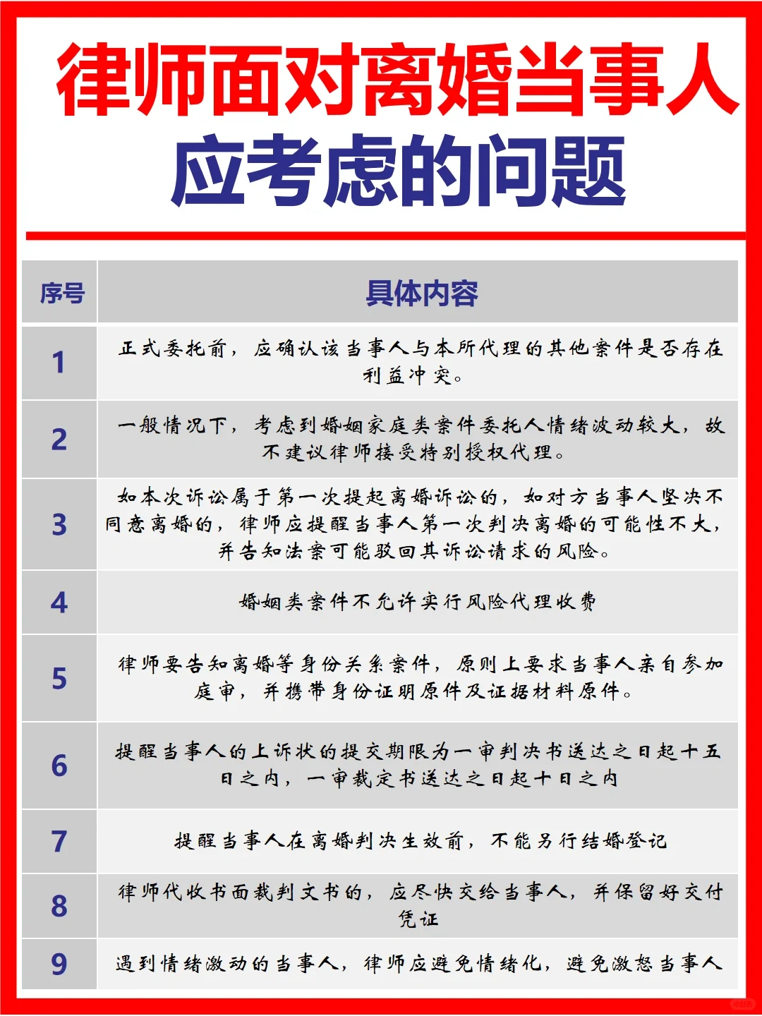 ? 婚姻家庭涉及當(dāng)事人的諸多情感因素。因此,律師在辦理此類案件時(shí),應(yīng)特別關(guān)注當(dāng)事人心理狀態(tài)和情緒表達(dá)的變化,并在從事相關(guān)法律服務(wù)時(shí)特別注意調(diào)解技巧的運(yùn)用。 ? 法律理論分析與實(shí)際操作結(jié)果可能存在哪些差異,當(dāng)事人對(duì)糾紛解決應(yīng)持何種態(tài)度和心理態(tài)度。 ? 在正式授權(quán)之前,應(yīng)確認(rèn)當(dāng)事方與該公司代理的其他案件之間是否存在利益沖突。 ? 一般來(lái)說(shuō),考慮到客戶在婚姻家庭案件中情緒波動(dòng)較大,不建議律師接受特別授權(quán)代理。 ? 如果這是第一次提起離婚訴訟,而另一方堅(jiān)決不同意離婚,律師應(yīng)提醒當(dāng)事人,第一次判決離婚的可能性不大,并告知他們?cè)V訟請(qǐng)求被駁回的風(fēng)險(xiǎn)。 ? 婚姻案件不允許執(zhí)行風(fēng)險(xiǎn)代理費(fèi) ? 律師應(yīng)當(dāng)告知離婚等身份案件的當(dāng)事人,要求其親自出庭,并攜帶身份證明文件和證據(jù)材料原件。 ? 提起上訴提醒當(dāng)事人的期限為一審判決送達(dá)之日起15日內(nèi),一審判決書(shū)送達(dá)之日止10日內(nèi) 提醒當(dāng)事人在離婚判決生效前不能再登記結(jié)婚 律師代為領(lǐng)取書(shū)面裁判文書(shū)的,應(yīng)當(dāng)盡快移交給委托人,并保存送達(dá)憑證 ? 當(dāng)遇到情緒激動(dòng)的客戶時(shí),律師應(yīng)避免情緒激動(dòng),避免激怒客戶