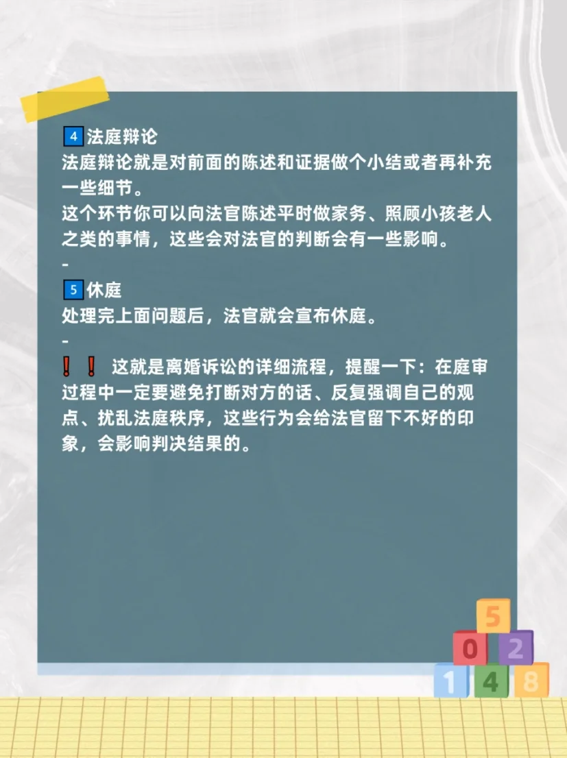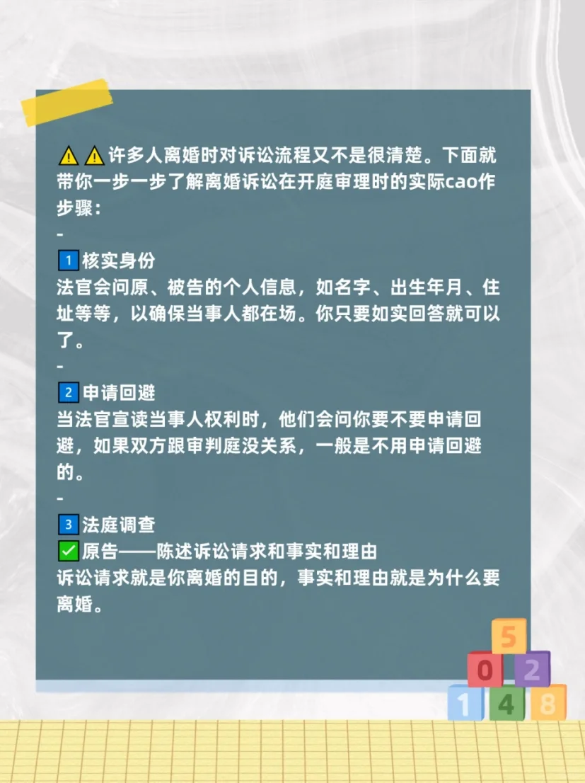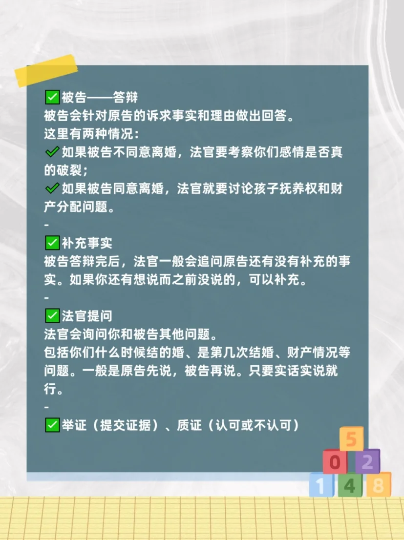 ? 許多人在離婚時(shí)對(duì)訴訟程序不是很清楚。下面,我們將帶您一步步了解離婚訴訟在審理過程中的實(shí)際步驟: - 一? 驗(yàn)證身份 法官將詢問原告和被告的個(gè)人信息,如姓名、出生日期、地址等,以確保各方都在場(chǎng)。你只需要如實(shí)回答。 - 二? 申請(qǐng)回避 當(dāng)法官宣讀當(dāng)事人的權(quán)利時(shí),他們會(huì)問你是否想申請(qǐng)回避。如果雙方都與審判法庭無關(guān),一般無需申請(qǐng)回避。 - 三? 法庭調(diào)查 ? 原告-陳述索賠、事實(shí)和訴訟理由 訴訟請(qǐng)求是你離婚的目的,事實(shí)和理由是你想要離婚的原因。 ?? 一般訴訟請(qǐng)求有三種: ? 雙方終止婚姻關(guān)系; ? 兒童監(jiān)護(hù)權(quán)的分配; ? 雙方財(cái)產(chǎn)分配。 - 根據(jù)法律規(guī)定,如果一方有重婚、與他人同居、家庭暴力、賭博、吸毒或分居兩年以上,則可以認(rèn)定婚姻關(guān)系破裂。 ?? 原告在訴狀中表示,上述任何一種情況都有更高的離婚成功可能性。 - 此外,如果已經(jīng)提出離婚但不允許,并且雙方又分居一年,則應(yīng)通知法官注意這一點(diǎn),這也是《民法典》規(guī)定的離婚理由。 - ? 被告-辯護(hù) 被告將回答原告索賠的事實(shí)和理由。 這里有兩種情況: ? 如果被告不同意離婚,法官將審查你們的關(guān)系是否真的破裂了; ? 如果被告同意離婚,法官將討論子女監(jiān)護(hù)權(quán)和財(cái)產(chǎn)分配問題。 - ? 補(bǔ)充事實(shí) 在被告辯護(hù)后,法官通常會(huì)詢問原告是否有其他事實(shí)。如果你還有什么想說的,你以前沒有提到過,你可以加上去。 - ? 法官提問 法官會(huì)問你和被告其他問題。 這包括你什么時(shí)候結(jié)婚、結(jié)婚多少次以及你的經(jīng)濟(jì)狀況等問題。一般來說,原告先發(fā)言,被告后發(fā)言。說實(shí)話。 - ? 證據(jù)出示(提交證據(jù))、質(zhì)證(批準(zhǔn)或不批準(zhǔn)) ? 原告應(yīng)當(dāng)出示證據(jù),被告應(yīng)當(dāng)對(duì)原告出示的證據(jù)逐一進(jìn)行質(zhì)證。 ? 被告應(yīng)當(dāng)提供證據(jù),原告也應(yīng)當(dāng)依次對(duì)被告提供的證據(jù)進(jìn)行質(zhì)證。 - 四? 法庭辯論 法庭辯論是對(duì)之前的陳述和證據(jù)進(jìn)行總結(jié)或添加一些細(xì)節(jié)。 在本節(jié)中,你可以向法官陳述日常家務(wù)、照顧孩子和老人的情況,這些可能會(huì)對(duì)法官的判斷產(chǎn)生一些影響。 - 五? 裁決 在處理完上述問題后,法官將宣布休庭。 - ?? 這是離婚訴訟的詳細(xì)過程。提醒是避免打斷對(duì)方的話,避免重復(fù)強(qiáng)調(diào)自己的觀點(diǎn),避免在審判過程中擾亂法庭秩序。這些行為會(huì)給法官留下不好的印象,影響判決結(jié)果。