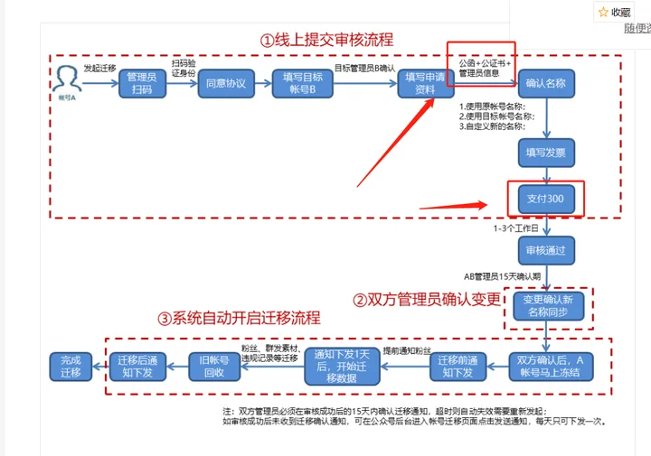1:兩個(gè)合格的公眾號(hào); 1.原始公眾號(hào)A必須是已驗(yàn)證主體信息的訂閱號(hào)或服務(wù)號(hào):小額支付驗(yàn)證、法定代表人驗(yàn)證或微信驗(yàn)證(包括資格審核成功);個(gè)人注冊(cè)成功。 2.目標(biāo)賬號(hào)B必須是對(duì)主體信息進(jìn)行過驗(yàn)證的組織訂閱或服務(wù)賬號(hào),如小額支付驗(yàn)證、法定代表人驗(yàn)證或微信認(rèn)證成功(包括資格審核成功)。 3.僅支持中國(guó)大陸地區(qū)的實(shí)體賬戶。海外實(shí)體公眾號(hào)不支持發(fā)起或接收遷移。 4.當(dāng)前不支持將訂閱號(hào)碼遷移到服務(wù)號(hào)碼。 溫馨提示:目前賬號(hào)遷移只支持中國(guó)大陸實(shí)體的公眾號(hào)遷移,不支持境外實(shí)體的公眾賬號(hào)遷移(不支持發(fā)起遷移,也不支持接收遷移)。如果帳戶違反規(guī)則并且功能被阻止,則不支持遷移應(yīng)用程序。 2:根據(jù)遷移流程指南,下載遷移申請(qǐng)書,填寫完整準(zhǔn)確的信息; 3:攜帶申請(qǐng)書到公證處進(jìn)行印章公證,并提供公證證明(目前不支持律師見證);現(xiàn)在支持在線公證,無需在場(chǎng) 網(wǎng)上公證所需的信息很簡(jiǎn)單,當(dāng)天就可以出具證書。你也可以在后臺(tái)私下進(jìn)行。我怎樣才能在線公證! 4:提交賬號(hào)遷移需要向騰訊支付300元的審核費(fèi)。如果您需要開具增值稅發(fā)票,請(qǐng)?zhí)崆跋蜇?cái)務(wù)部門準(zhǔn)備好稅號(hào)、稅務(wù)登記證/營(yíng)業(yè)執(zhí)照和開戶許可證。(注意:發(fā)票表頭的科目名稱不能修改。默認(rèn)情況下,將開具原始科目表頭發(fā)票。系統(tǒng)將自動(dòng)檢索數(shù)據(jù)。如果您的科目名稱在工商局發(fā)生更改,請(qǐng)向第三方審計(jì)公司提交相關(guān)證明材料。)