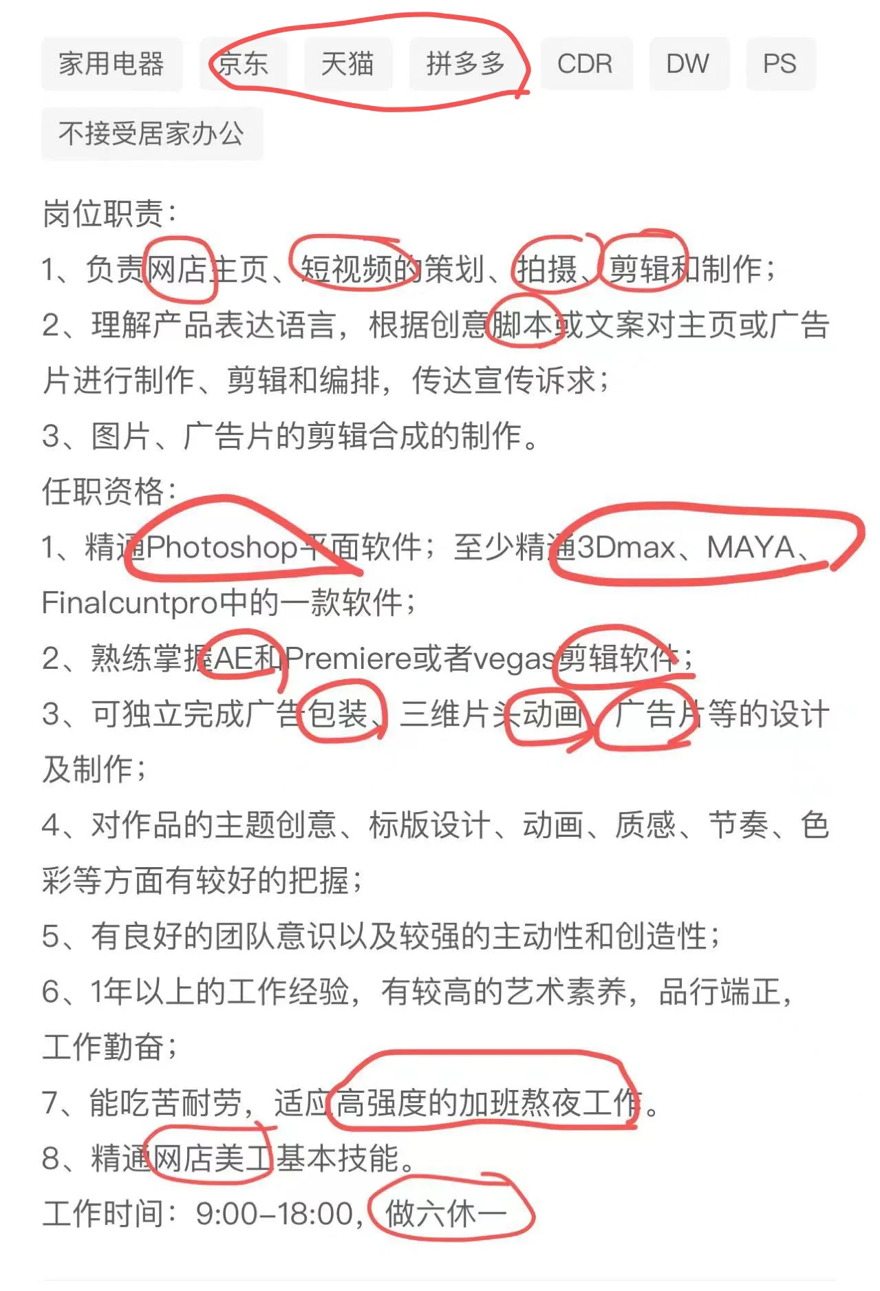 三個(gè)平臺(tái)要求熟練掌握平面廣告、電子商務(wù)和平面設(shè)計(jì)、3D建模、攝影和視頻編輯,以及適應(yīng)高強(qiáng)度加班[再見R][再見R][再見R]。這只是一個(gè)人在設(shè)計(jì)辦公室工作。