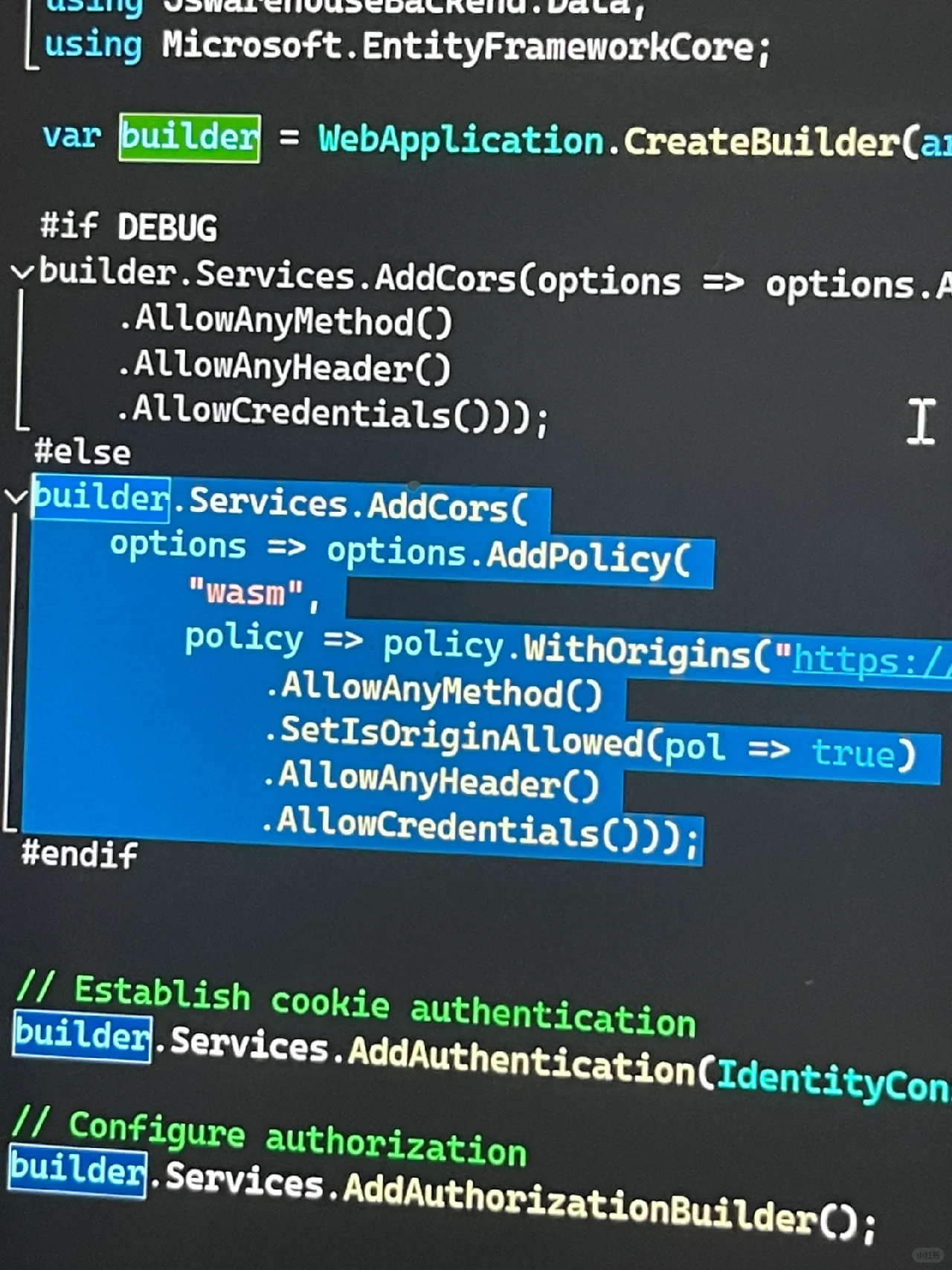 后端已經(jīng)配置了CORS,但前端仍然報(bào)告錯(cuò)誤,但使用Postman向后端發(fā)送請(qǐng)求不是問題。 Azure靜態(tài)應(yīng)用程序上的前端部署 Azure應(yīng)用程序服務(wù)中的后端部署 屏幕截圖顯示了允許在后端使用前端地址的代碼,而另一個(gè)使用完全相同配置的項(xiàng)目則沒有cors問題。