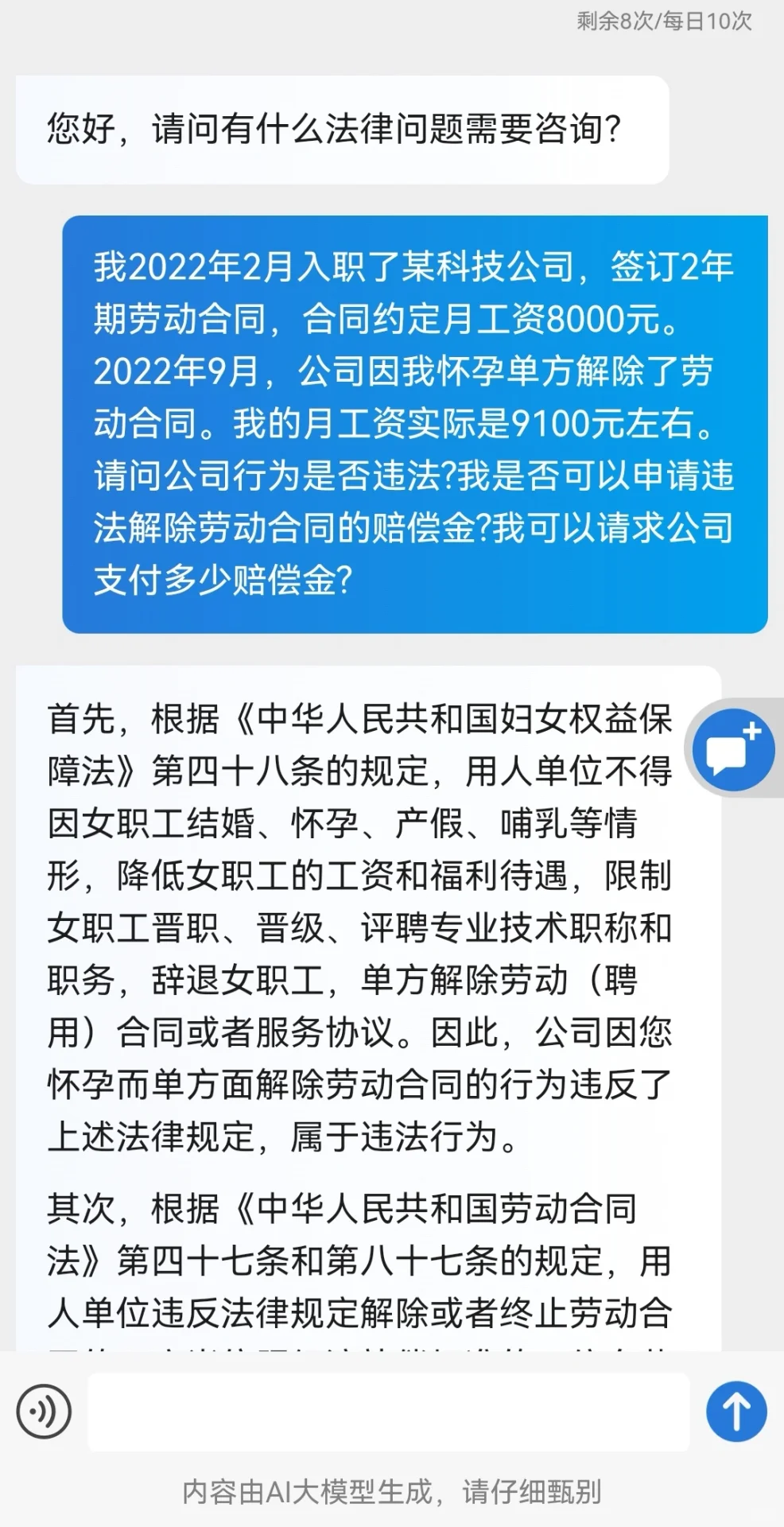 ?? 最近,我發(fā)現(xiàn)了華子制作的一個(gè)AI問答小程序——快速回答法律咨詢。 ? 經(jīng)過反復(fù)測(cè)試,我發(fā)現(xiàn)快速回答法律咨詢的問答能力相當(dāng)于GPT-4。而且,人工智能將根據(jù)真實(shí)的法律法規(guī)進(jìn)行回答,不會(huì)編造任何無稽之談。最重要的是,完全免費(fèi)?。?! ? 人工智能到底有多有用?例如,如果我在懷孕期間被解雇,我該怎么辦?在不到半分鐘的時(shí)間里,小程序結(jié)合《勞動(dòng)合同法》第47條和第87條進(jìn)行了回答。工作效率顯著提高。 ? 救命,這真的節(jié)省了很多時(shí)間。 ? 法律人工智能工具可以為我們的日常生活帶來一定的幫助。然而,建議每個(gè)人就具體和復(fù)雜的法律問題尋求專家的幫助。