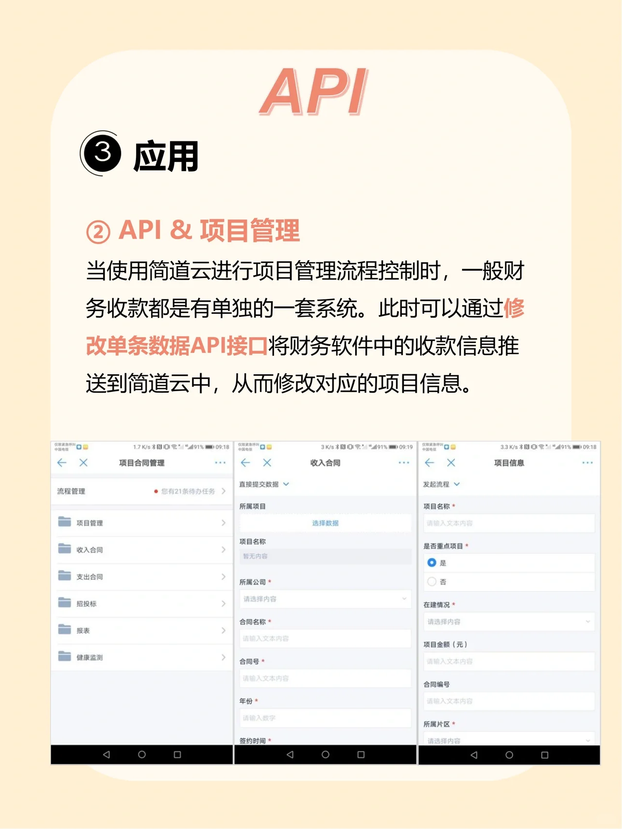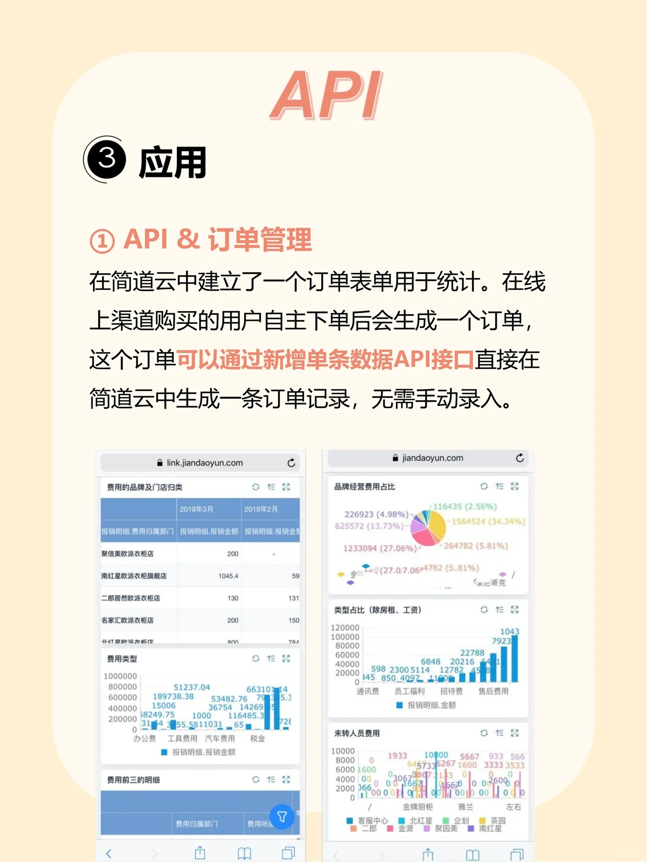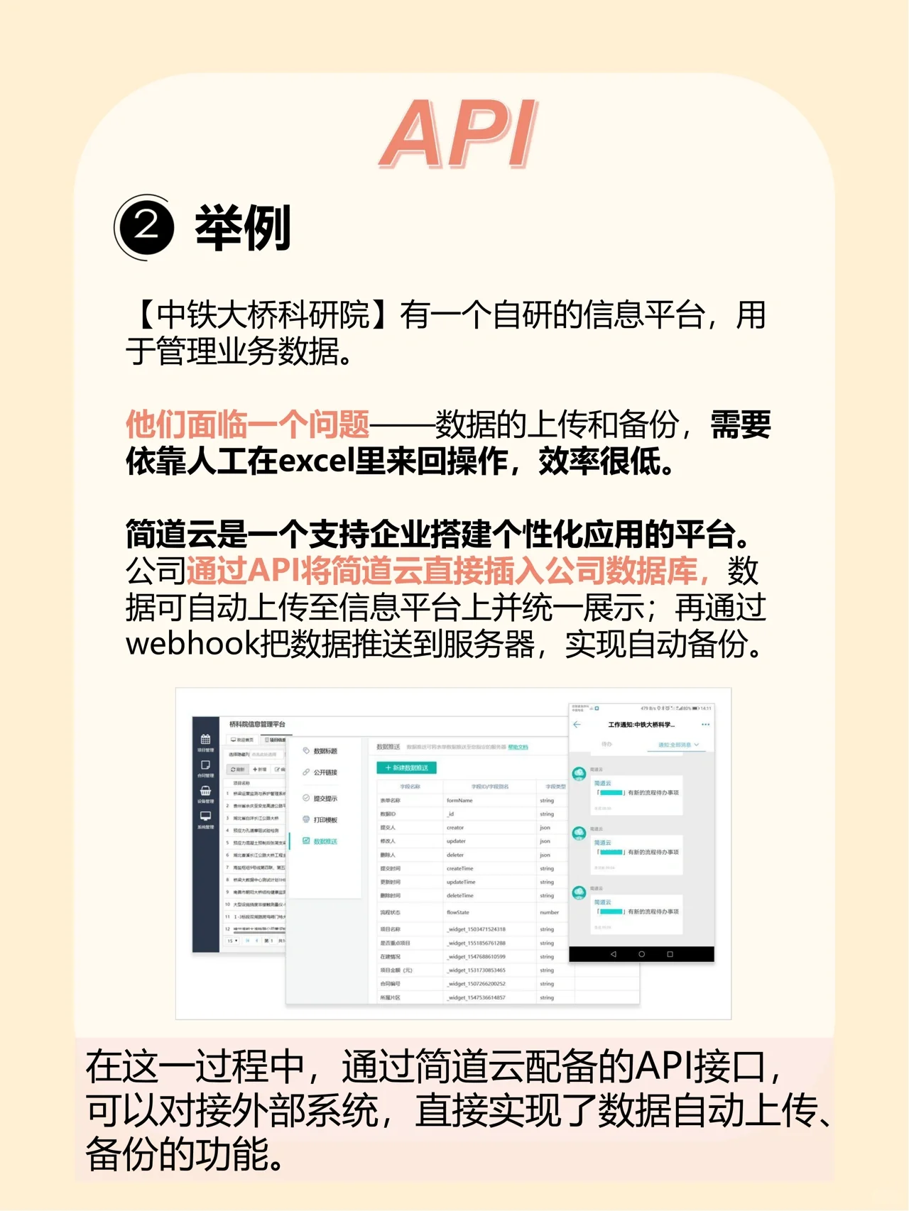 ?? 讓我先給你講個小故事 研發(fā)人員A已經(jīng)開發(fā)了軟件A,研發(fā)人員B目前正在開發(fā)軟件B。有一天,研發(fā)人員A想調(diào)用軟件A的一些功能來使用,但他們不想從頭開始經(jīng)歷軟件A的源代碼和功能實現(xiàn)過程。他們該怎么辦? 研發(fā)人員A想出了一個好主意:我會把你需要的功能打包到軟件A中,然后寫成一個功能。如果你按照我提到的過程,把這個功能放在軟件B中,你可以直接使用我的功能! API是研發(fā)人員A提到的功能。 ?? 釋義 API全稱為應(yīng)用編程接口,翻譯為“應(yīng)用編程接口”。 在日常生活中,我們有許多類似API的場景,例如: 計算機需要從手機訪問信息,此時,您將使用數(shù)據(jù)線連接計算機和手機。連接電腦和手機之間數(shù)據(jù)線的接口相當(dāng)于API接口。 ?? 再舉一個例子,幫助您理解API在實際工作中的應(yīng)用: 中鐵大橋研究院擁有自主研發(fā)的業(yè)務(wù)數(shù)據(jù)管理信息平臺。 他們面臨著一個問題——盡管有一個信息平臺,但由于系統(tǒng)的獨立性,數(shù)據(jù)上傳和備份需要在Excel中手動來回操作,導(dǎo)致效率低下。 由于系統(tǒng)的開發(fā)周期長,成本高,他們專注于現(xiàn)成的功能軟件。 于是簡道云通過API直接插入公司數(shù)據(jù)庫,數(shù)據(jù)可以自動上傳到信息平臺并統(tǒng)一顯示;然后通過webhook將數(shù)據(jù)推送到服務(wù)器,實現(xiàn)自動備份。 在此過程中,通過劍道云配備的API接口,可以連接外部系統(tǒng),讓橋梁科學(xué)研究所直接實現(xiàn)數(shù)據(jù)自動上傳和備份的功能,而無需開發(fā)。 ?? 給出一些更具體的應(yīng)用場景: ? API與訂單管理 在劍道云中建立了一個訂單表單,用于跟蹤訂單信息。在線銷售渠道的用戶獨立下單后,會生成訂單。此時,該訂單可以通過添加單個數(shù)據(jù)條目的API接口直接在劍道云中生成,無需手工錄入。 ? API與項目管理 在使用劍道云進行項目管理過程控制時,通常會有一個單獨的財務(wù)收款系統(tǒng)。在這種情況下,可以通過修改單個數(shù)據(jù)API接口,將財務(wù)軟件中的收款信息推送到劍道云,從而修改相應(yīng)的項目信息。