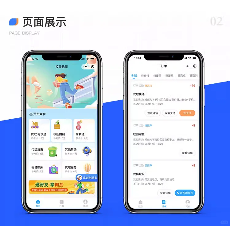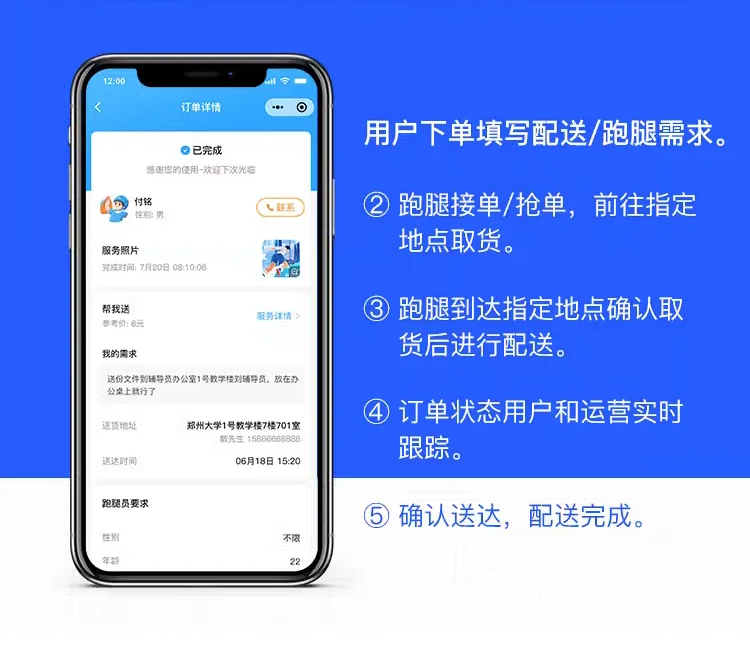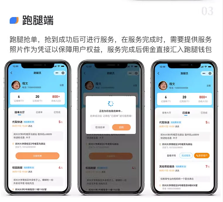 校園跑腿小程序通常旨在為校園內(nèi)外的大學(xué)生提供各種代理、送貨和其他服務(wù)。其功能主要包括以下幾個方面: 任務(wù)發(fā)布:用戶可以通過小程序發(fā)布各種代理任務(wù),如取快遞、購物、打印文檔、送餐等,并填寫任務(wù)明細(xì)、報酬和截止日期信息。 任務(wù)接受:其他用戶(通常是大學(xué)生)可以瀏覽并接受發(fā)布的任務(wù),接受任務(wù)后可以與發(fā)布者進(jìn)行溝通并完成任務(wù)。 評估系統(tǒng):用戶可以對完成任務(wù)的人員進(jìn)行評估和評分,建立信任和口碑,也可以幫助其他用戶選擇合適的跑步者。 支付功能:迷你程序通常支持在線支付功能,允許發(fā)布任務(wù)的用戶輕松支付補(bǔ)償,同時保護(hù)跑腿人員的權(quán)利。 任務(wù)管理:用戶可以在迷你程序上查看已發(fā)布任務(wù)的狀態(tài)、歷史記錄和管理,從而輕松跟蹤任務(wù)進(jìn)度和處理異常情況。 客戶服務(wù)支持:迷你程序可以提供在線客戶服務(wù)支持,回答用戶問題和處理投訴,提高用戶體驗和服務(wù)質(zhì)量。 通過校園跑腿小程序,大學(xué)生可以輕松快速地委托他人完成各種瑣碎的任務(wù),省時省力;同時,它還為愿意賺取額外收入的學(xué)生提供了一種靈活的兼職方式,促進(jìn)了校園內(nèi)部資源的共享和利用