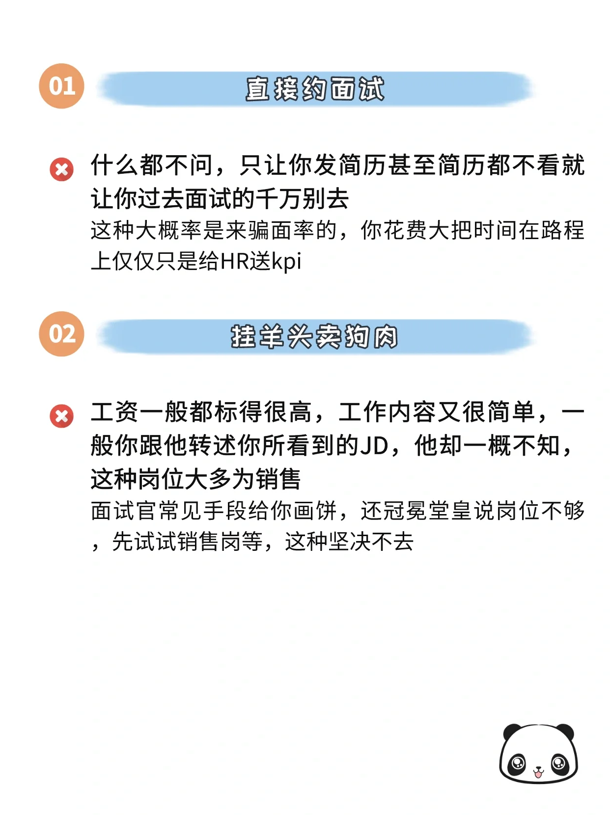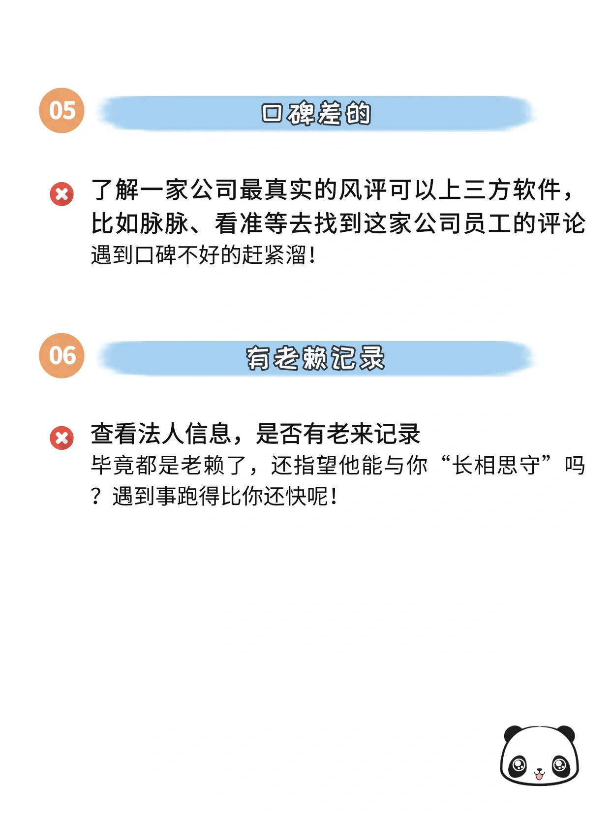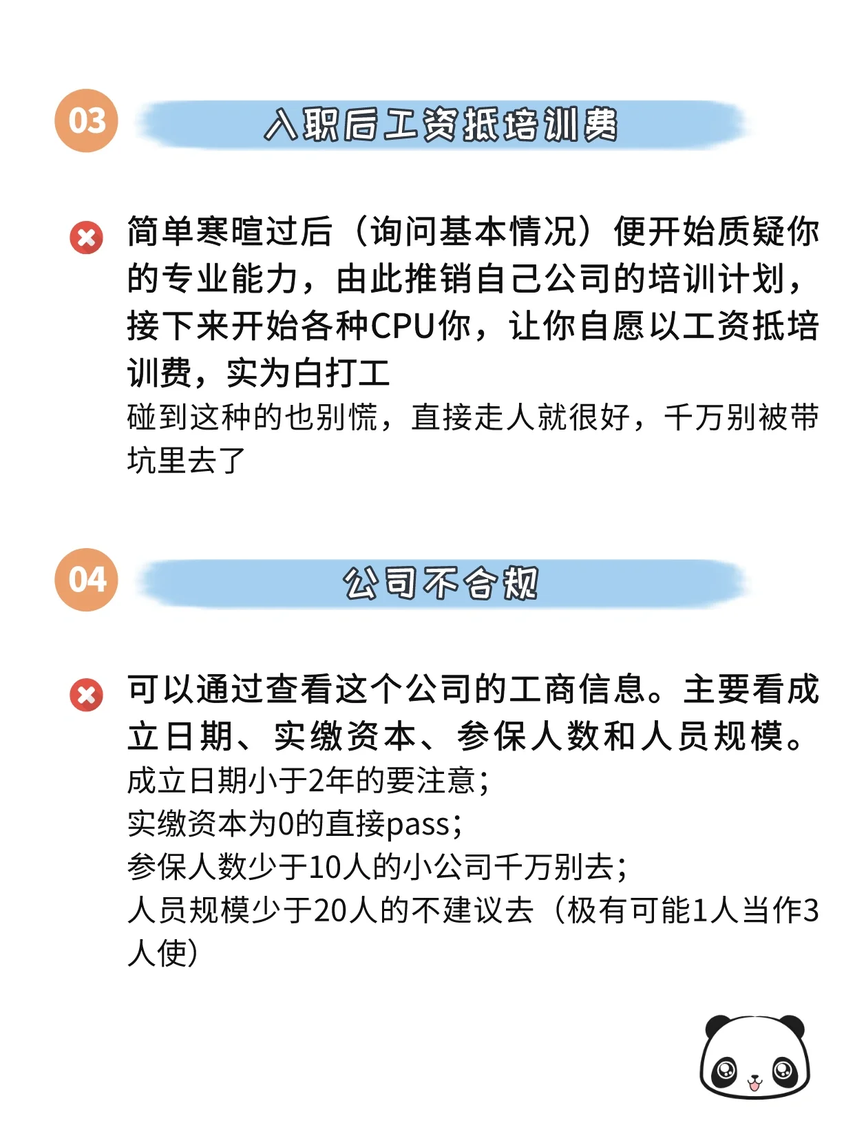 近日,有同學(xué)私信,說自己遇到垃圾公司了? 具體流程是HR在審閱簡歷后直接安排面試。一個(gè)1.5小時(shí)的車程和2分鐘的采訪導(dǎo)致了不恰當(dāng)?shù)幕貞?yīng)? 這顯然是詐騙率嗎?? · 我姐姐能理解每個(gè)人急于找工作的心情,但我們不應(yīng)該急于就醫(yī)??? ? 找工作是一個(gè)兩種選擇的過程,作為職場新人,我們需要有與公司進(jìn)行反向面試的意識(shí),以防止?jié)撛诘娘L(fēng)險(xiǎn) · 為了避免在找工作時(shí)被無良公司欺騙,今天學(xué)姐就來列舉一下垃圾公司的七大特點(diǎn)。遇到他們就別走?♀? ?? 直接安排面試 你問的任何問題都是“我們見面時(shí)會(huì)詳細(xì)討論” ?? 掛羊頭賣狗肉 面對(duì)面操作,實(shí)際銷售 ?? 入職后,工資與培訓(xùn)費(fèi)相抵 主觀判斷你的能力不夠,我們將為你提供專業(yè)培訓(xùn),并要求你支付工資,以表明你的決心 ?? 公司不合規(guī) 注意查看業(yè)務(wù)信息(成立日期、實(shí)收資本、參保人數(shù)、人員規(guī)模) ?? 糟糕的口碑 使用第三方平臺(tái)查看公司員工的真實(shí)評(píng)估 ?? 查看法定代表人信息,查看是否有賴賬記錄 你是不是已經(jīng)是個(gè)游手好閑的人了,還希望按時(shí)拿到工資 · ? 在去面試之前,學(xué)生們不僅需要對(duì)公司進(jìn)行反向調(diào)查,還需要問清楚這六個(gè)問題:試用工資打折了嗎? 會(huì)有五險(xiǎn)一金嗎? 工資結(jié)構(gòu)是什么? 如果申請(qǐng)實(shí)習(xí)職位,有機(jī)會(huì)成為全職員工嗎?... 你能轉(zhuǎn)到特定腳本的頂部嗎?自己查看筆記~ ? 難道不認(rèn)為這是轟炸問題嗎?這會(huì)引起人力資源部的不滿嗎?他們有義務(wù)回答嗎?,簡而言之,提前了解必要的信息可以避免浪費(fèi)行程?