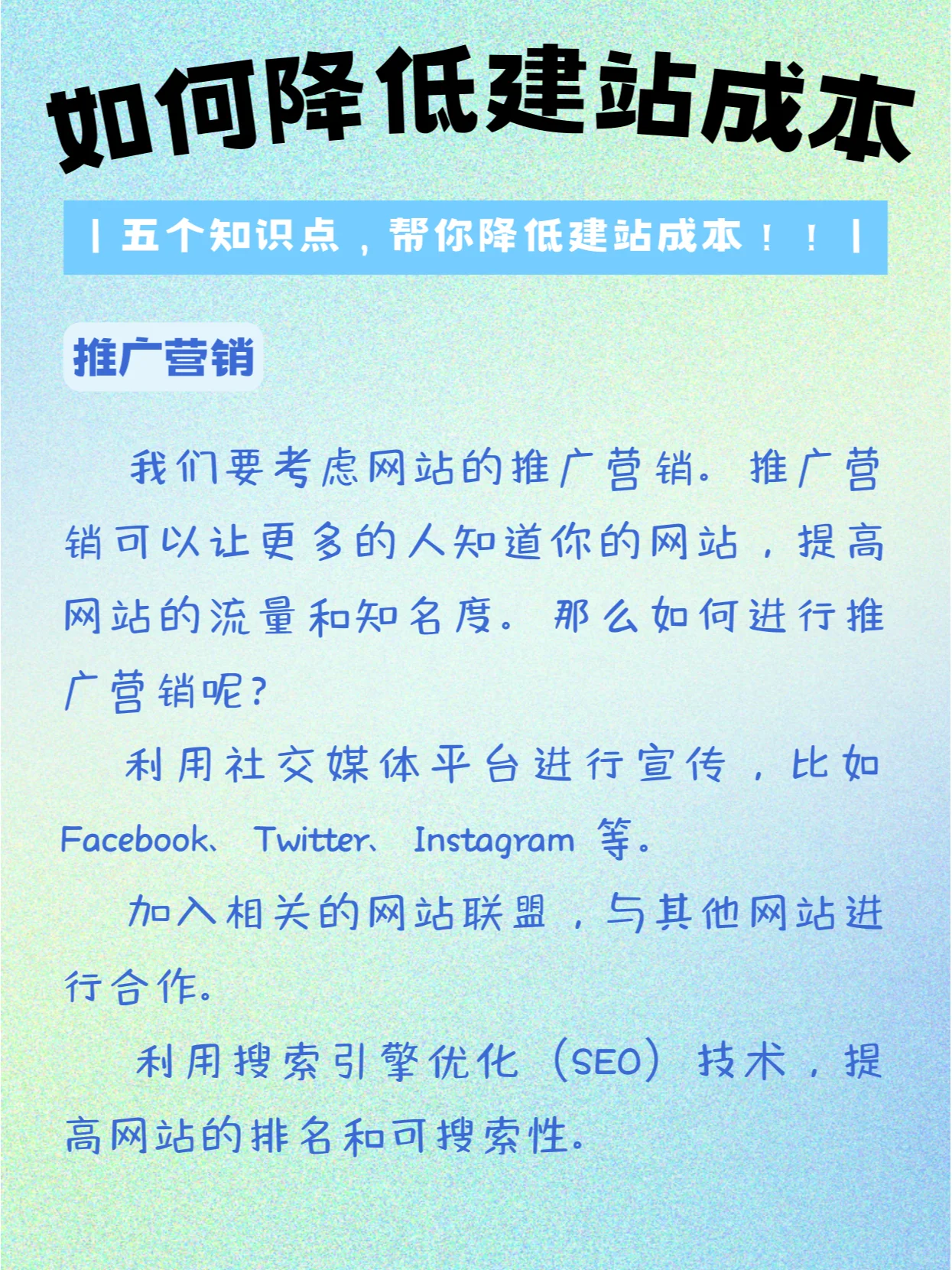 今天,讓我和大家分享一下如何降低我們的網(wǎng)站建設(shè)成本?我相信每個(gè)人在建網(wǎng)站的時(shí)候都會(huì)遇到各種各樣的問(wèn)題,包括域名注冊(cè)、服務(wù)器選擇、網(wǎng)站設(shè)計(jì)等等。別擔(dān)心,今天就給你一些小技巧吧! 一?? 域名注冊(cè) 選擇一個(gè)好的域名至關(guān)重要,因?yàn)樗蔷W(wǎng)站的基礎(chǔ)。一個(gè)好的域名不僅有利于用戶記住,還可以提高網(wǎng)站的可見(jiàn)性。那么如何選擇一個(gè)好的域名呢? 盡量選擇簡(jiǎn)短而令人難忘的域名,避免使用復(fù)雜的字母和數(shù)字組合。 選擇與網(wǎng)站內(nèi)容相關(guān)的域名,讓用戶更容易找到它們。 為了避免使用昂貴的域名,我們可以選擇一些更便宜的域名注冊(cè)商。 二?? 服務(wù)器選擇 接下來(lái),我們需要選擇一個(gè)合適的服務(wù)器。服務(wù)器是網(wǎng)站的基礎(chǔ)設(shè)施,對(duì)網(wǎng)站的穩(wěn)定性和速度有著至關(guān)重要的影響。那么如何選擇合適的服務(wù)器呢? 根據(jù)網(wǎng)站的需要選擇服務(wù)器配置和帶寬。 選擇可靠的服務(wù)提供商,如AWS、Linode、Vultr等。 如果你的網(wǎng)站流量不高,你可以選擇一些性價(jià)比高的云服務(wù)器。 三?? 網(wǎng)站設(shè)計(jì) 網(wǎng)站設(shè)計(jì)是降低網(wǎng)站建設(shè)成本的關(guān)鍵。一個(gè)好的網(wǎng)站設(shè)計(jì)不僅可以提高用戶體驗(yàn),還可以降低后期的維護(hù)成本。那么如何設(shè)計(jì)一個(gè)好的網(wǎng)站呢? 選擇簡(jiǎn)單清新的設(shè)計(jì)風(fēng)格,避免過(guò)度使用圖像和動(dòng)畫(huà)。 優(yōu)化頁(yè)面布局以提高網(wǎng)站的可讀性和可用性。 采用響應(yīng)式設(shè)計(jì),確保網(wǎng)站能夠在各種設(shè)備上正常顯示。 四?? 內(nèi)容質(zhì)量 內(nèi)容是網(wǎng)站的核心。高質(zhì)量的內(nèi)容不僅可以吸引用戶,還可以提高網(wǎng)站的排名和可見(jiàn)性。那么如何提高網(wǎng)站的內(nèi)容質(zhì)量呢? 寫(xiě)原創(chuàng)文章,避免抄襲和偽原創(chuàng)。 關(guān)注熱點(diǎn)事件,及時(shí)發(fā)表相關(guān)文章。 優(yōu)化關(guān)鍵詞布局,提高網(wǎng)站搜索能力。 五?? 推廣和營(yíng)銷(xiāo) 推廣營(yíng)銷(xiāo)可以幫助更多的人了解你的網(wǎng)站,增加流量和知名度。那么如何進(jìn)行推廣和營(yíng)銷(xiāo)呢? 利用社交媒體平臺(tái)進(jìn)行推廣,如Facebook、Twitter、Instagram等。 加入相關(guān)網(wǎng)站聯(lián)盟,并與其他網(wǎng)站合作。 利用搜索引擎優(yōu)化(SEO)技術(shù)來(lái)提高網(wǎng)站排名和搜索能力。