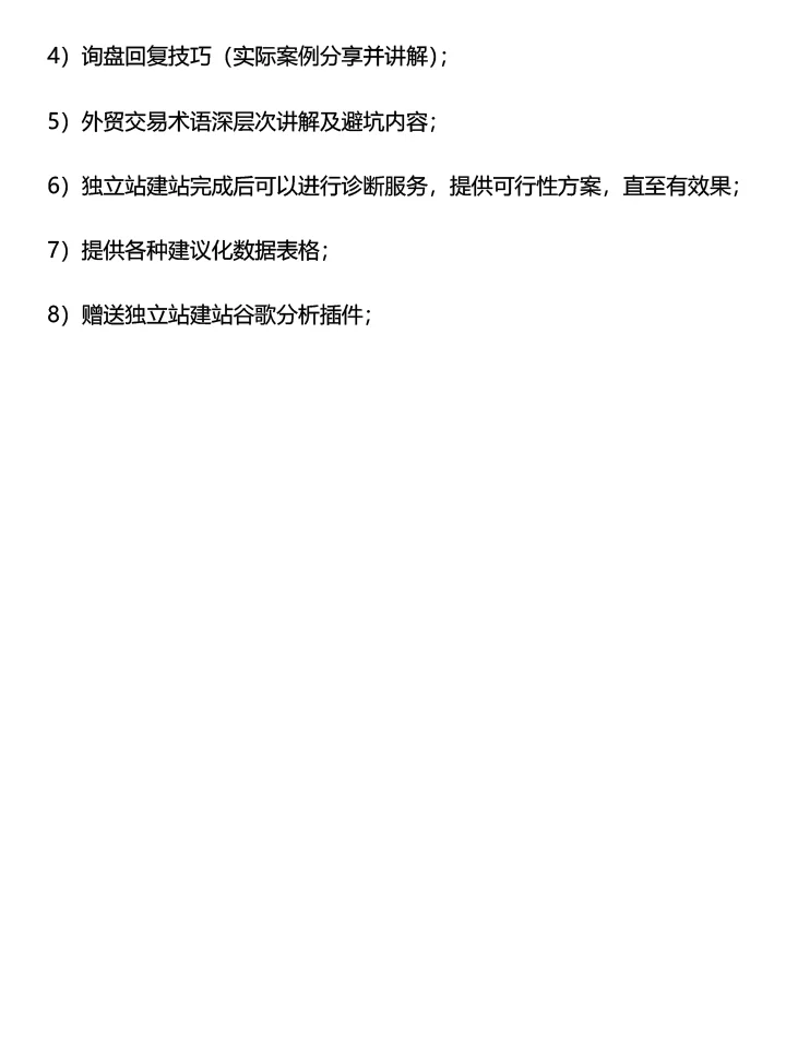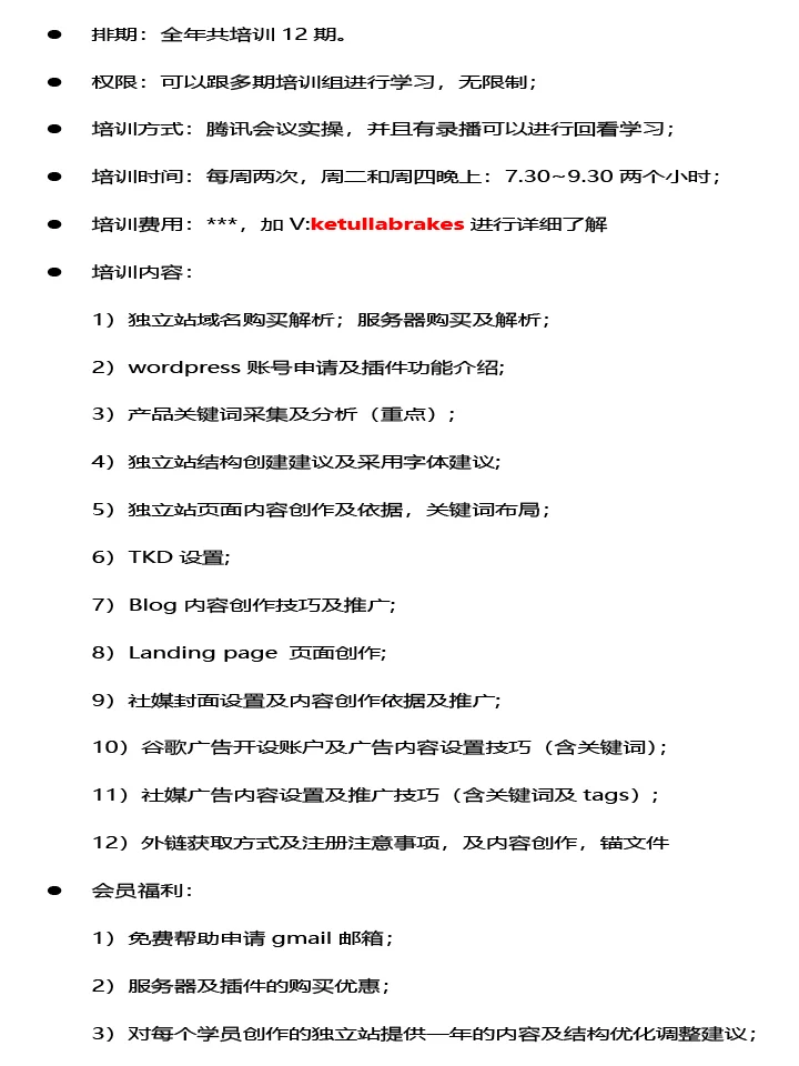 獨(dú)立網(wǎng)站需要整合多個(gè)方面的內(nèi)容才能有效,獨(dú)立網(wǎng)站需要具備以下幾個(gè)重要方面: 符合客戶搜索意圖的優(yōu)秀頁(yè)面內(nèi)容 簡(jiǎn)潔的頁(yè)面結(jié)構(gòu),符合客戶搜索習(xí)慣 關(guān)鍵詞布局好, 高品質(zhì)原創(chuàng)博客文章 高重量和一定數(shù)量的外部鏈路, 完全支持?jǐn)?shù)百個(gè)獨(dú)立頁(yè)面。 .... 對(duì)于中國(guó)企業(yè)來(lái)說(shuō),獨(dú)立外貿(mào)站并不是在跟風(fēng),而是一種趨勢(shì),這是企業(yè)走出國(guó)門(mén)必須要做的事情。2024年是獨(dú)立網(wǎng)站的時(shí)代,這將是一個(gè)新的趨勢(shì)。抓住機(jī)遇是實(shí)現(xiàn)實(shí)打?qū)嵉谋ㄐ约t利的關(guān)鍵!只有當(dāng)商家了解自己的產(chǎn)品以及創(chuàng)建、運(yùn)營(yíng)和推廣獨(dú)立網(wǎng)站的邏輯時(shí),我們才能在這樣一個(gè)競(jìng)爭(zhēng)激烈的外貿(mào)環(huán)境中脫穎而出,增加我們的獲客渠道,并提高銷售業(yè)績(jī), 為了解決許多企業(yè)能夠獨(dú)立創(chuàng)建網(wǎng)站、運(yùn)營(yíng)和推廣網(wǎng)站的問(wèn)題,我們將于2024年開(kāi)始進(jìn)行獨(dú)立網(wǎng)站創(chuàng)建和運(yùn)營(yíng)推廣培訓(xùn),培訓(xùn)內(nèi)容包括以下內(nèi)容: 1.獨(dú)立現(xiàn)場(chǎng)培訓(xùn): 成員安排:每屆會(huì)議20名成員,每月一次; 研究期為:1年 日程安排:全年共進(jìn)行12次培訓(xùn)。 權(quán)限:可以不受限制地向多個(gè)培訓(xùn)小組學(xué)習(xí); 培訓(xùn)方式:騰訊會(huì)議實(shí)操,錄制廣播復(fù)習(xí)學(xué)習(xí); 訓(xùn)練時(shí)間:每周兩次,周二和周四晚上:7.30-9.30兩小時(shí); 培訓(xùn)費(fèi):***,加上V:Ketullabrakes以供詳細(xì)了解 培訓(xùn)內(nèi)容: 1) 獨(dú)立網(wǎng)站域名購(gòu)買解析;服務(wù)器購(gòu)買和解決方案; 2) WordPress帳戶應(yīng)用程序和插件功能介紹; 3) 產(chǎn)品關(guān)鍵詞收集與分析(要點(diǎn)); 4) 關(guān)于創(chuàng)建獨(dú)立網(wǎng)站結(jié)構(gòu)和采用字體的建議; 5) 獨(dú)立網(wǎng)站頁(yè)面內(nèi)容的創(chuàng)建與基礎(chǔ)、關(guān)鍵詞布局; 6) TKD設(shè)置; 7) 博客內(nèi)容創(chuàng)作技巧與推廣; 8) 登陸頁(yè)創(chuàng)建; 9) 社交媒體封面設(shè)計(jì)與內(nèi)容創(chuàng)作的基礎(chǔ)與推廣; 10) 谷歌廣告賬戶開(kāi)通和廣告內(nèi)容設(shè)置技巧(包括關(guān)鍵詞); 11) 社交媒體廣告的內(nèi)容設(shè)置和推廣技術(shù)(包括關(guān)鍵詞和標(biāo)簽); 12) 外部鏈接獲取方法和注冊(cè)注意事項(xiàng),以及內(nèi)容創(chuàng)建和錨定文件 會(huì)員福利: 1) 免費(fèi)協(xié)助申請(qǐng)Gmail電子郵件; 2) 服務(wù)器和插件的購(gòu)買折扣; 3) 為學(xué)生創(chuàng)建的每個(gè)獨(dú)立網(wǎng)站提供一年的內(nèi)容和結(jié)構(gòu)優(yōu)化調(diào)整建議; 4) 詢問(wèn)回應(yīng)技能(分享和解釋實(shí)際案例); 5) 外貿(mào)交易術(shù)語(yǔ)的深層解釋與避坑內(nèi)容; 6) 獨(dú)立站點(diǎn)建設(shè)完成后,可以提供診斷服務(wù),并提供可行的解決方案,直到其生效; 7) 提供各種建議的數(shù)據(jù)表; 8) 免費(fèi)的谷歌分析插件,用于獨(dú)立網(wǎng)站建設(shè);