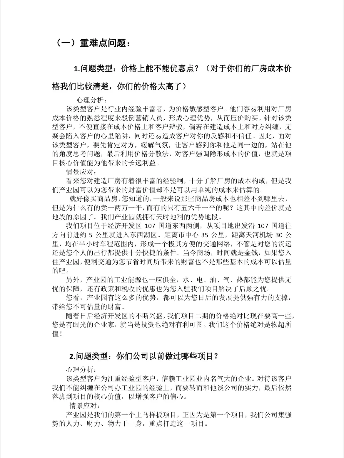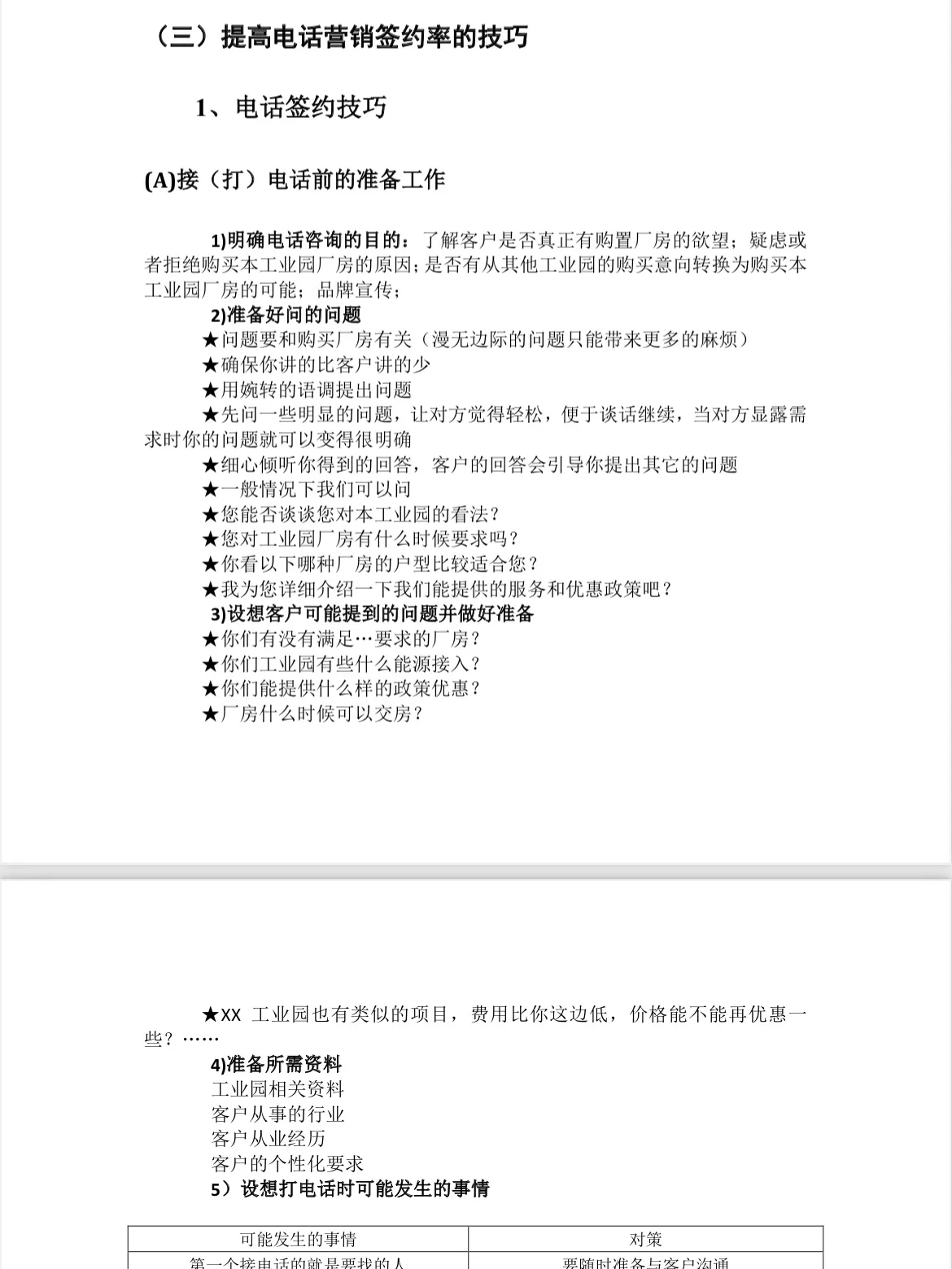 ? 1.客戶的第一印象 ? 穿著得體,展現(xiàn)職業(yè)形象 ? 保持微笑和熱情,營(yíng)造良好氛圍 ? 注意言行,表現(xiàn)出自信和正直 ? 傾聽客戶需求并表達(dá)對(duì)他們的關(guān)心 ? 提供有價(jià)值的信息和建議,展示專業(yè)技能 ? 2.提高電話營(yíng)銷簽約率的技巧 ? 提前準(zhǔn)備好劇本和材料 ? 注意發(fā)音和語(yǔ)調(diào),保持自信和親和力 ? 強(qiáng)調(diào)工業(yè)園區(qū)的獨(dú)特賣點(diǎn)和優(yōu)勢(shì) ? 了解客戶需求并提供個(gè)性化解決方案 ? 舉行面對(duì)面的會(huì)議,以進(jìn)一步促進(jìn)合同的簽署 ? 3、重點(diǎn)難點(diǎn)問題 ? 如何突出產(chǎn)業(yè)園區(qū)的特色和優(yōu)勢(shì)? ? 如何區(qū)別于競(jìng)爭(zhēng)對(duì)手? ? 如何解決客戶對(duì)價(jià)格的敏感性? ? 如何處理客戶的疑慮? ? 如何確??蛻魸M意度和忠誠(chéng)度? ? 4.價(jià)格可以打折嗎 ? 根據(jù)工業(yè)園區(qū)的定位和市場(chǎng)條件制定合理的定價(jià)策略 ? 提供一定的優(yōu)惠政策或增值服務(wù)以增加吸引力 ? 與客戶充分溝通,解釋價(jià)格的合理性和價(jià)值 ? 在一定范圍內(nèi)靈活談判,但要注意底線和盈利能力 ? 5.遇到客戶拒絕的提示 ? 保持冷靜和耐心,了解客戶拒絕的原因 ? 提供更多信息或解決方案以消除客戶的顧慮 ? 強(qiáng)調(diào)工業(yè)園區(qū)的優(yōu)勢(shì)和潛在價(jià)值 ? 建立良好關(guān)系,爭(zhēng)取未來的合作機(jī)會(huì) ? 持續(xù)跟進(jìn)并保持聯(lián)系