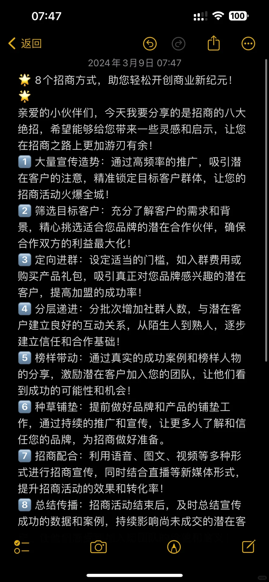 親愛的朋友們,今天我要給大家分享的是吸引投資的八個小技巧。我希望它能給你帶來一些靈感和啟發(fā),讓你更善于吸引投資! 一?? 海量推廣和炒作:通過高頻次的推廣,吸引潛在客戶的注意力,精準(zhǔn)定位目標(biāo)客戶群,讓你的招商活動火爆全城! 二?? 篩選目標(biāo)客戶:充分了解客戶的需求和背景,精心選擇適合您品牌的潛在合作伙伴,確保雙方利益最大化! 三?? 定向加盟:設(shè)置適當(dāng)?shù)拈T檻,如加盟費(fèi)或購買產(chǎn)品包,以吸引真正對您的品牌感興趣的潛在客戶,提高加盟成功率! 四?? 分級推進(jìn):批量增加社區(qū)成員數(shù)量,與潛在客戶建立良好的互動關(guān)系,逐步建立從陌生人到熟人的信任與合作基礎(chǔ)! 五?? 榜樣驅(qū)動:通過分享真實(shí)的成功故事和榜樣,激勵潛在客戶加入您的團(tuán)隊(duì),并向他們展示成功的可能性和機(jī)會! 六?? 種草打基礎(chǔ):提前準(zhǔn)備好品牌和產(chǎn)品,通過不斷的推廣和宣傳,讓更多的人了解和信任你的品牌,為招商做準(zhǔn)備。 七?? 招商合作:利用語音、文字、視頻等多種形式進(jìn)行招商,結(jié)合直播等新媒體形式,提高招商活動的有效性和轉(zhuǎn)化率! 八?? 總結(jié)與交流:招商活動結(jié)束后,及時總結(jié)推廣成功的數(shù)據(jù)和案例,持續(xù)影響尚未完成交易的潛在客戶,讓他們感受到加入您團(tuán)隊(duì)的價值和意義!