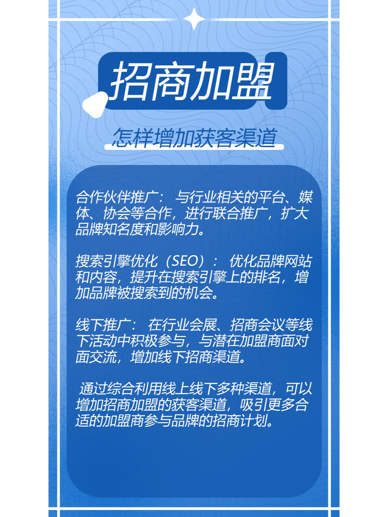 增加投資和加盟的獲客渠道,可以通過以下方式吸引更多加盟商: 數(shù)字營(yíng)銷:利用社交媒體、搜索引擎營(yíng)銷、內(nèi)容推廣等方式,提升品牌知名度,吸引更多潛在加盟商的關(guān)注。 在線招商平臺(tái):在知名招商加盟平臺(tái)注冊(cè)發(fā)布招商信息,吸引對(duì)加盟感興趣的人。 品牌推廣活動(dòng):舉辦品牌推廣活動(dòng),如線上直播、線下展覽等,增加品牌曝光度,吸引加盟商的眼球。 口碑營(yíng)銷:通過提高品牌聲譽(yù),現(xiàn)有的加盟商可以通過口碑吸引更多潛在的加盟商。什么 合作伙伴推廣:與行業(yè)相關(guān)平臺(tái)、媒體、協(xié)會(huì)等合作,共同提升和擴(kuò)大品牌知名度和影響力。 搜索引擎優(yōu)化(SEO):優(yōu)化品牌網(wǎng)站和內(nèi)容,提高搜索引擎的排名,增加品牌被搜索的機(jī)會(huì)。 線下推廣:積極參與行業(yè)展會(huì)、投資會(huì)議等線下活動(dòng),與潛在加盟商面對(duì)面交流,增加線下投資渠道。 通過綜合利用線上線下的各種渠道,我們可以增加吸引加盟商的獲客渠道,吸引更多合適的加盟商參與品牌的投資計(jì)劃。