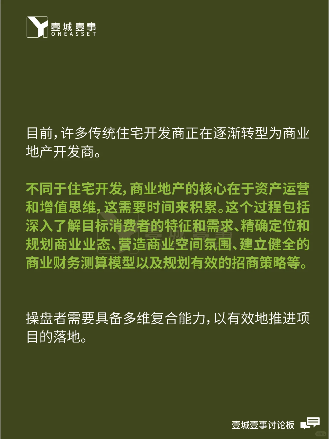 ? 目前,許多傳統(tǒng)的住宅開發(fā)商正在逐步向商業(yè)地產(chǎn)開發(fā)商轉(zhuǎn)型。與住宅開發(fā)不同,商業(yè)地產(chǎn)的核心在于資產(chǎn)運營和增值思維,這需要時間的積累。 ? 這一過程包括深入了解目標消費者的特征和需求,對商業(yè)業(yè)態(tài)進行精準定位和規(guī)劃,營造商業(yè)空間氛圍,建立健全商業(yè)財務計算模型,規(guī)劃有效的投資策略。貿(mào)易商需要具備多維度和綜合能力,才能有效推動項目的實施。 ? 經(jīng)濟環(huán)境是不確定的,市場上只有這么多資源。如今,無論是擴張還是開店都非常謹慎。我們?nèi)绾挝覀兊耐顿Y和商業(yè)客戶進入我們將在下一期繼續(xù)討論。