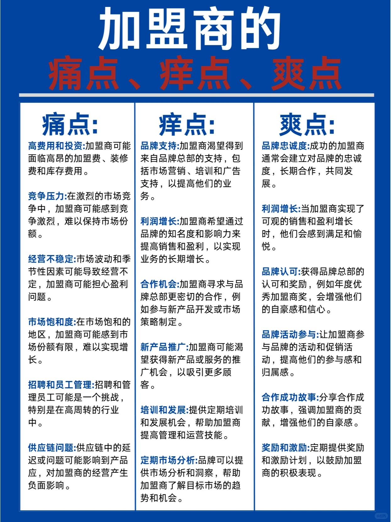 ? 為什么一些品牌招商如火如荼,而另一些品牌卻被冷落 ? 很多人可能會(huì)說,品牌投資之所以成功,是因?yàn)楫a(chǎn)品銷量好,利潤高,售后服務(wù)省心。這聽起來可能是對(duì)的,但仔細(xì)想想,這不是一句“胡說八道”嗎畢竟,哪個(gè)品牌不想實(shí)現(xiàn)這三點(diǎn)呢但真正能取得多大成就呢 ? 所以,我們需要深入分析,加盟商到底在尋求什么他們面臨哪些痛點(diǎn)、癢點(diǎn)和快樂點(diǎn) ? 痛點(diǎn):成本和投資高、競爭壓力大、運(yùn)營不穩(wěn)定、市場飽和、招聘和員工管理困難以及供應(yīng)鏈問題。加盟商每天都面臨這些問題,讓他們晚上睡不著覺。 ? 癢點(diǎn):品牌支持、利潤增長、多重合作機(jī)會(huì)、新產(chǎn)品推廣、培訓(xùn)和開發(fā),以及品牌的定期市場分析。這些都是加盟商夢(mèng)寐以求的東西,會(huì)讓他們感到誘惑。 ? 亮點(diǎn):品牌忠誠度、利潤增長、品牌知名度、品牌活動(dòng)參與度、合作成功案例、獎(jiǎng)勵(lì)和激勵(lì)。當(dāng)這些快樂得到滿足時(shí),加盟商會(huì)感到無比的滿足和快樂。 ? 因此,為了品牌投資的成功,它不能僅僅停留在“產(chǎn)品銷售好、利潤高、售后無憂”的表面條件上。但要更深入地了解加盟商的需求和痛點(diǎn),并為他們提供真正有價(jià)值的支持和幫助。 ? 如果您對(duì)吸引加盟商有任何疑問或困惑,請(qǐng)隨時(shí)在評(píng)論區(qū)或后臺(tái)留言。我們有一對(duì)一的專業(yè)老師為您提供專業(yè)的答案。 ? 別忘了點(diǎn)贊并關(guān)注我們。我們將定期分享更多關(guān)于品牌投資的見解和信息,幫助您更好地了解市場動(dòng)態(tài)和趨勢(shì)。