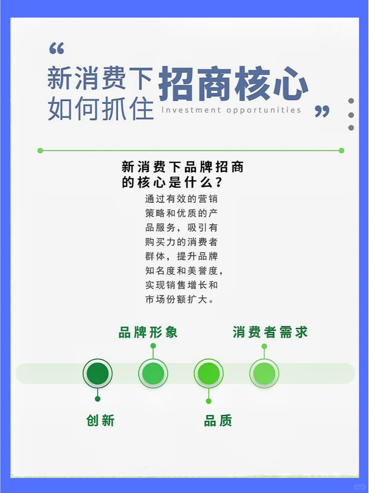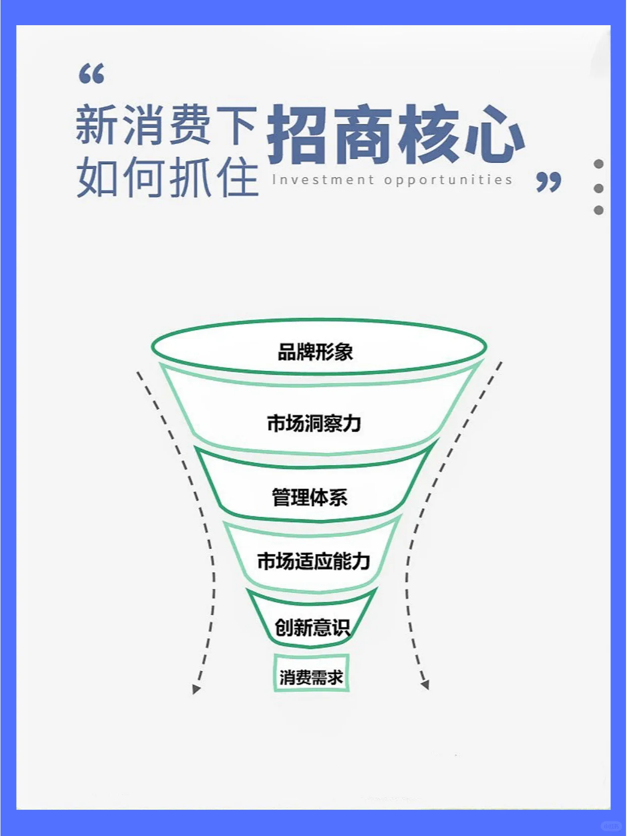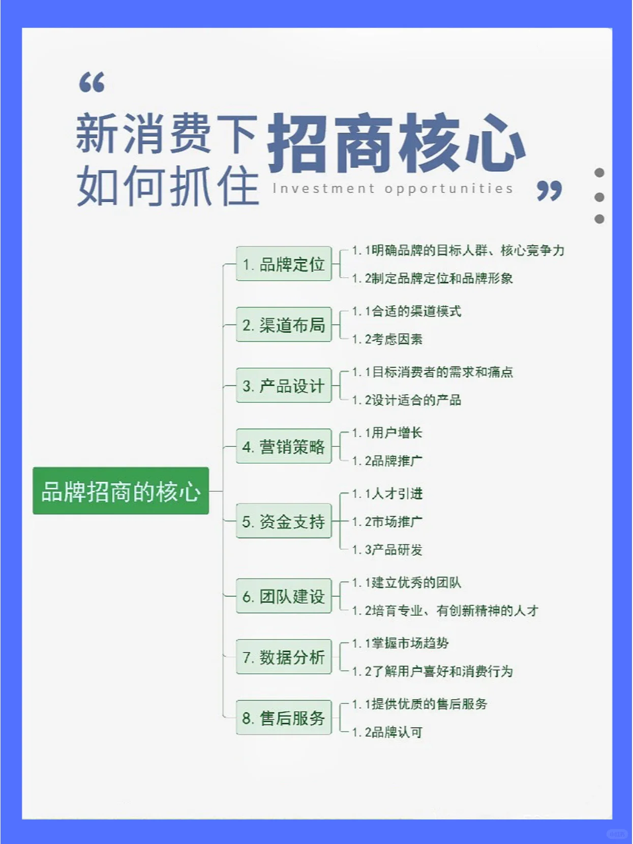 ? 在新消費(fèi)大潮中,如何抓住招商核心成為眾多品牌關(guān)注的焦點。今天,讓我們來揭示幾個關(guān)鍵點,讓您的投資之旅更加順利! ? 清晰的品牌定位:首先,你需要清楚你的品牌是誰以及你想去哪里。確定目標(biāo)受眾和市場定位,分析他們的需求和消費(fèi)習(xí)慣,以便準(zhǔn)確制定投資策略。 ? 有效的品牌推廣:品牌推廣是成功招商的關(guān)鍵。選擇合適的推廣渠道,將品牌的聲音傳播得更遠(yuǎn)、更深。社交媒體、線下活動和合作伙伴都是您品牌推廣的有力助手。 ? 改進(jìn)招聘流程:在招聘加盟商時,不僅要深入了解其業(yè)務(wù)實力和聲譽(yù),還要深入了解品牌競爭對手的優(yōu)勢和劣勢。通過這種方式,你可以更有針對性地吸引高質(zhì)量的加盟商。 ? 評估合作伙伴:在選擇合作伙伴時,進(jìn)行全面評估至關(guān)重要。商業(yè)實力、聲譽(yù)、背景、資金實力都是你需要關(guān)注的方面。只有找到真正合適的合作伙伴,我們才能共同推動品牌的發(fā)展。 ? 總之,抓住招商核心,才能在激烈的市場競爭中脫穎而出,實現(xiàn)品牌快速發(fā)展!