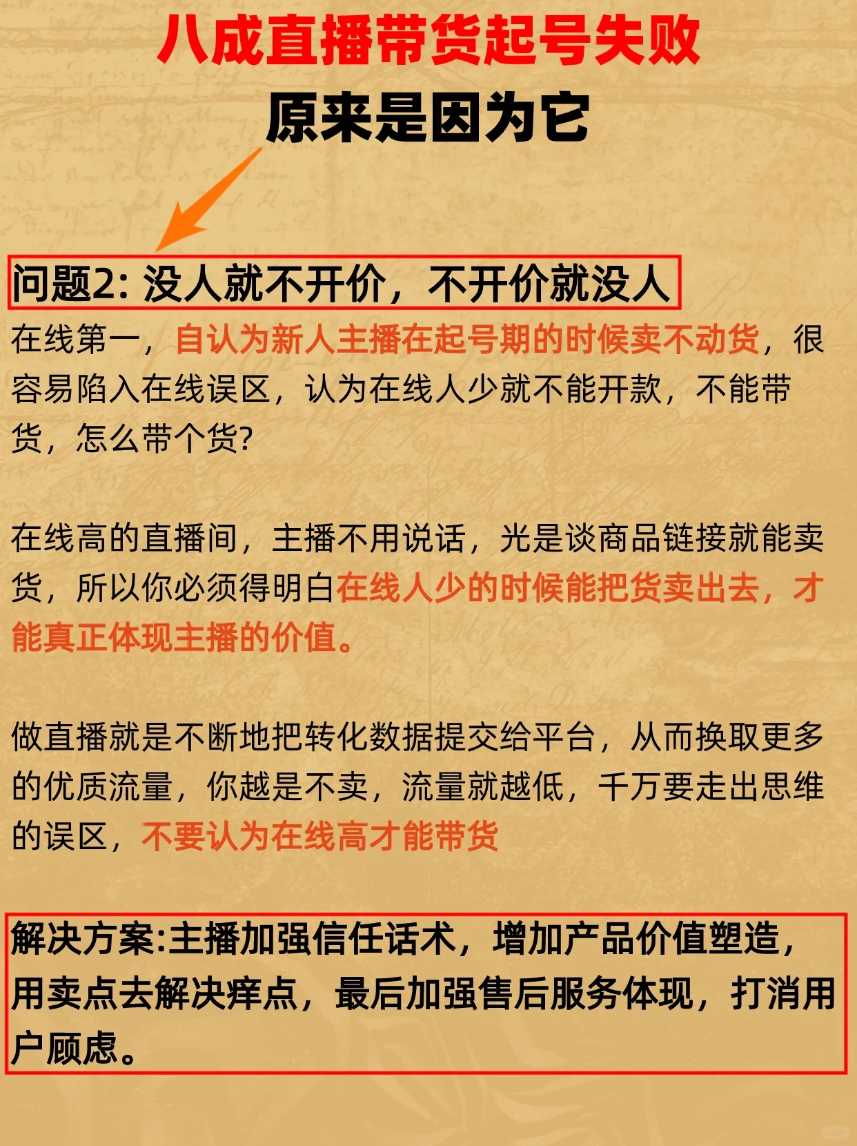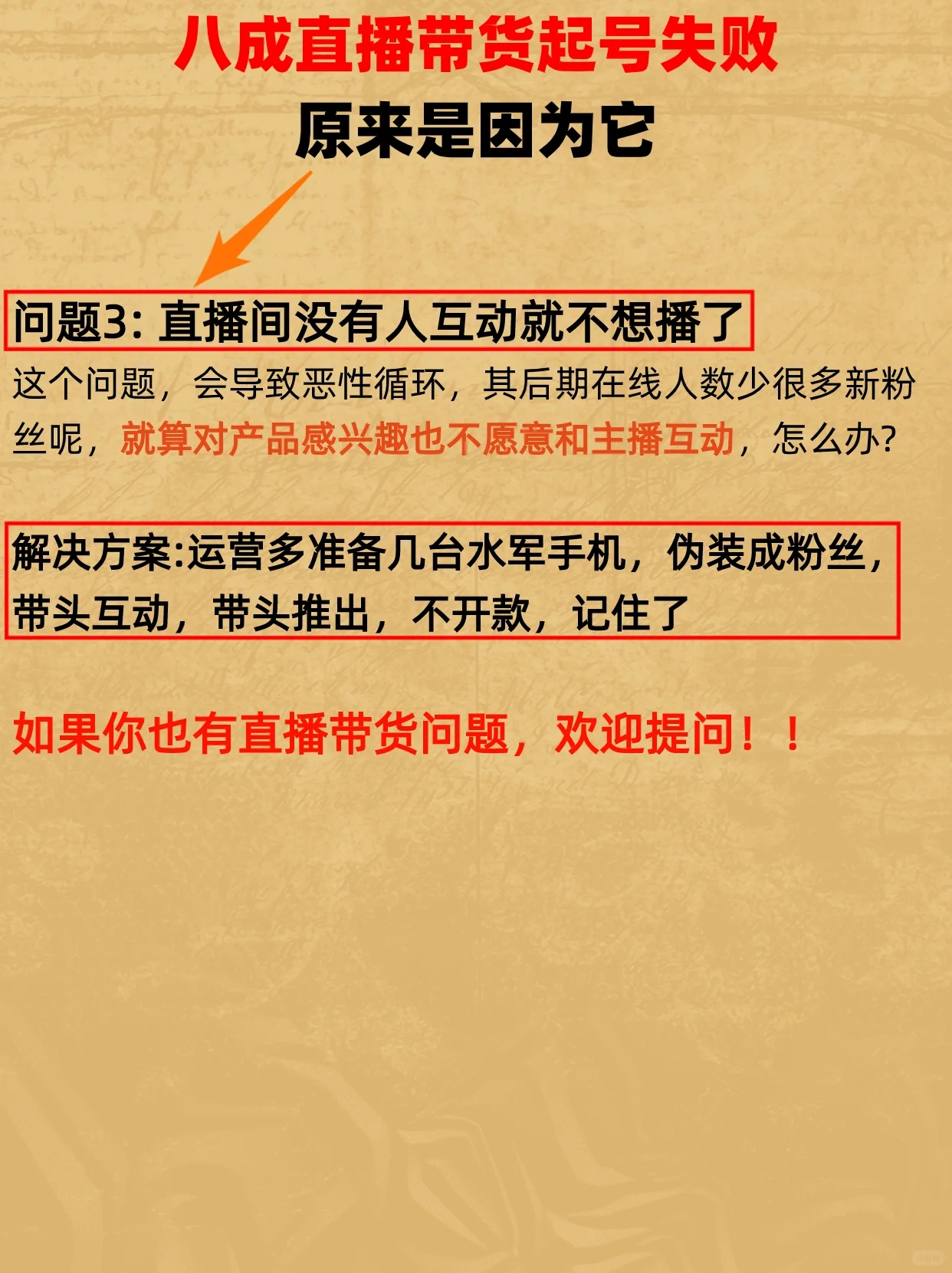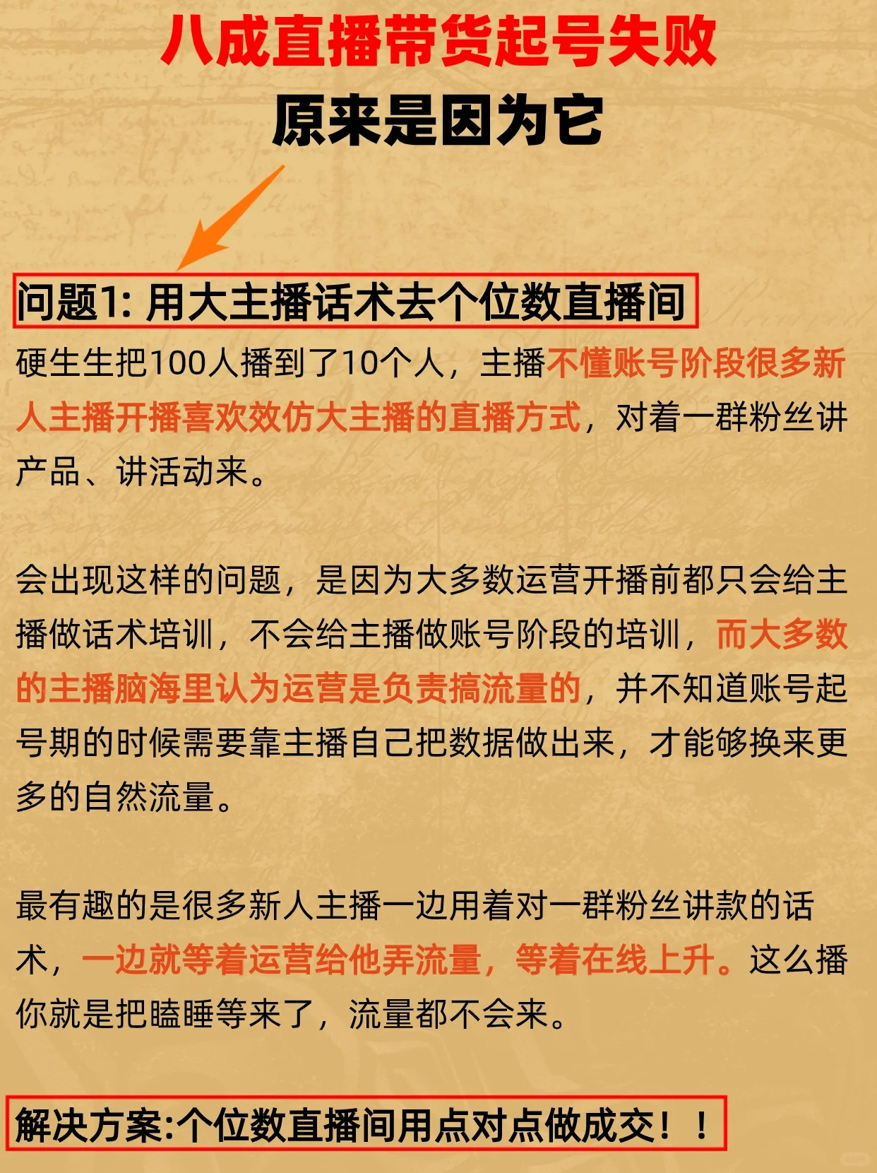 問(wèn)題一:用大主播的語(yǔ)言去個(gè)位數(shù)的直播間 幾乎不播100人到10人,主播不了解賬號(hào)階段。許多新主播喜歡模仿大主播的直播方式,向一群粉絲講述產(chǎn)品和活動(dòng)。 造成這一問(wèn)題的原因是,大多數(shù)運(yùn)營(yíng)商在開播前只對(duì)主播進(jìn)行腳本培訓(xùn),在賬號(hào)階段不進(jìn)行賬號(hào)培訓(xùn)。在大多數(shù)主播心中,他們認(rèn)為運(yùn)營(yíng)商負(fù)責(zé)管理流量,不知道在賬號(hào)注冊(cè)期間需要依靠主播創(chuàng)建自己的數(shù)據(jù)才能產(chǎn)生更多的自然流量。 最有趣的是,許多新主播在等待運(yùn)營(yíng)的同時(shí),用他們的講故事技巧來(lái)吸引一群粉絲,以增加他們的流量和在線增長(zhǎng)。這種廣播方式,你只是在等瞌睡,交通甚至不會(huì)來(lái)。 解決方案:在個(gè)位數(shù)的直播間中使用點(diǎn)對(duì)點(diǎn)交易!! 問(wèn)題2:如果沒(méi)有人,那么就沒(méi)有人可以引用。如果沒(méi)有人可以引用,那么就沒(méi)有人 首先是在線,認(rèn)為新主播在起步期不能賣貨,很容易陷入在線誤解,即在線人數(shù)少,就不能開戶,也不能帶貨。他們?cè)趺茨軒ж? 在一個(gè)高度在線的直播間里,主播不需要大聲疾呼,只談產(chǎn)品鏈接就可以賣貨,所以你必須明白,在網(wǎng)上人少的時(shí)候,你也可以賣貨,才能真正體現(xiàn)主播的價(jià)值。 做直播就是不斷向平臺(tái)提交轉(zhuǎn)化數(shù)據(jù),以換取更多高質(zhì)量的流量。你賣的越少,流量就越低。一定要擺脫思維上的誤解,不要認(rèn)為高在線流量是促進(jìn)銷售的唯一途徑 解決方案:主播應(yīng)加強(qiáng)信任和溝通技巧,增加產(chǎn)品價(jià)值塑造,用賣點(diǎn)解決癢點(diǎn),最終加強(qiáng)售后服務(wù),打消用戶顧慮。 問(wèn)題3:如果直播間沒(méi)有互動(dòng),我就不想再玩了 這個(gè)問(wèn)題會(huì)導(dǎo)致一個(gè)惡性循環(huán),后期在線的新粉絲會(huì)減少。即使他們對(duì)產(chǎn)品感興趣,也不愿意與主播互動(dòng)。他們?cè)撛趺崔k 解決方案:準(zhǔn)備更多海軍手機(jī)進(jìn)行操作,偽裝成粉絲,率先互動(dòng),發(fā)布,不發(fā)布,記住