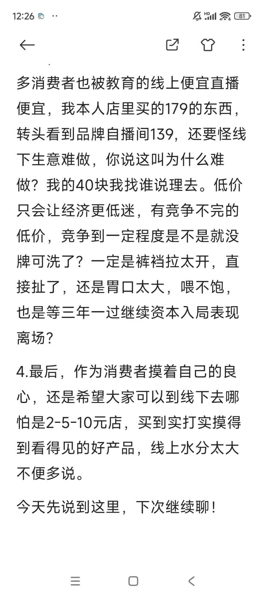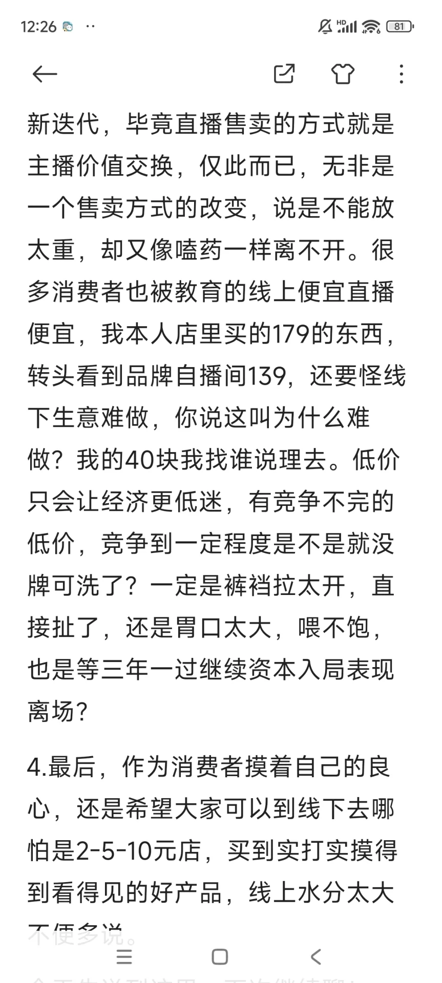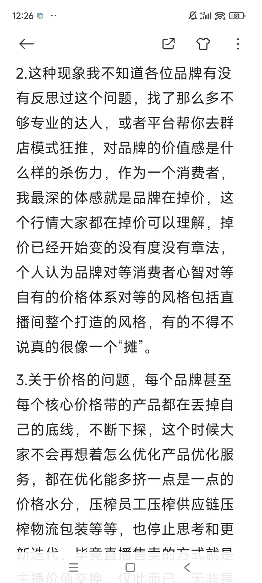 作為一個見證了直播行業(yè)興衰的人,我還有很多話要說 1、在20-21-22還是直播高峰期的時(shí)候,真的可以實(shí)現(xiàn)主播和品牌的雙贏。什么是雙贏的局面主播的口碑可以撬動行業(yè)大片,卷起行業(yè)頂級品牌的良性競爭,顛覆技術(shù)設(shè)計(jì)壁壘。沒有強(qiáng)力的價(jià)格調(diào)整,而是價(jià)格是否與產(chǎn)品一致,盡量擠出價(jià)格泡沫。這是一項(xiàng)非常積極的業(yè)務(wù)。22的巔峰吸引了太多人加入,沒有專業(yè)背景的你我都可以成為主播。不管怎樣,我只是覺得我可以正常地輸出到賣點(diǎn)。有了一部手機(jī)和一個樣品,我可以輕松地謀生。因此,你會在各種渠道中看到各種不專業(yè)的主播,引起一種人人都能輕松賺錢、幫助他人賣貨的社會反應(yīng)。 2.不知道有沒有品牌對這種現(xiàn)象進(jìn)行過反思。他們找到了很多不專業(yè)的專家或平臺來幫助你推廣團(tuán)購模式。它對品牌的價(jià)值感有什么樣的破壞力作為一名消費(fèi)者,我最深的感受是這個品牌正在降價(jià)。這種市場趨勢是可以理解的,因?yàn)槊總€人都在降價(jià)。價(jià)格下跌已經(jīng)開始在沒有學(xué)位或組織的情況下發(fā)生變化。我個人認(rèn)為,品牌相當(dāng)于消費(fèi)者的心智,價(jià)格體系相當(dāng)于整個直播間的風(fēng)格。他們中的一些人不得不說,它看起來真的像一個“攤位”。 3、關(guān)于價(jià)格的問題,每一個品牌,甚至每一個核心價(jià)格區(qū)間的產(chǎn)品都在失去底線,在不斷探索。這個時(shí)候,人們不再考慮如何優(yōu)化產(chǎn)品和服務(wù),而是在優(yōu)化以擠壓更多的價(jià)格水。擠壓員工、擠壓供應(yīng)鏈、擠壓物流包裝等,也停止了思考和更新迭代。畢竟,直播的銷售方式是主播價(jià)值的交換,這無非是銷售方式的改變。據(jù)說它不能放得太重,但它就像服用了無法分離的藥物。許多消費(fèi)者也接受了在線直播很便宜的教育。當(dāng)我在自己的商店里買了179的東西,轉(zhuǎn)身看到品牌的自播室139時(shí),我責(zé)怪線下業(yè)務(wù)很難做。你為什么說這很難我的40元錢能跟誰講道理。低價(jià)格只會使經(jīng)濟(jì)更加蕭條。低價(jià)競爭永無止境,如果競爭達(dá)到一定程度,就沒有牌可以洗牌了一定是因?yàn)榭璨坷锰珜挘苯永?,還是胃口太大,吃不飽,等著資本三年后繼續(xù)入場,表現(xiàn)好 4.最后,作為消費(fèi)者的良心,我們?nèi)匀幌M總€人都能去線下商店,即使花2-5-10元,買到有形可見的好產(chǎn)品。不方便過多地談?wù)摼W(wǎng)上的水分。