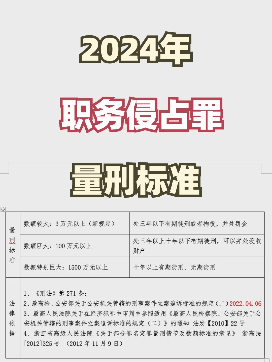 一、量刑幅度 1.數(shù)額較大:3萬元以上(新規(guī)定)>>處三年以下有期徒刑或者拘役,并處罰金 2.數(shù)額巨大:100萬元以上 >> 處三年以上十年以下有期徒刑,可以并處沒收財產(chǎn) 3.數(shù)額特別巨大:1500萬元以上 >> 十年以上有期徒刑、無期徒刑 二、法律依據(jù) 1、《刑法》第271條; 2、最高檢、公安部關(guān)于公安機關(guān)管轄的刑事案件立案追訴標(biāo)準(zhǔn)的規(guī)定(二)2022.04.06 3、最高人民法院關(guān)于在經(jīng)濟犯罪中審判中參照適用《最高人民檢察院、公安部關(guān)于公安機關(guān)管轄的刑事案件立案追訴標(biāo)準(zhǔn)的規(guī)定(二)》的通知 法發(fā)【2010】22號 4、浙江省高級人民法院《關(guān)于部分罪名定罪量刑情節(jié)及數(shù)額標(biāo)準(zhǔn)的意見》 三、注意事項 職務(wù)侵占與盜竊罪的唯一區(qū)分是是否利用職務(wù)便利,在該情節(jié)模糊的情況下,切勿根據(jù)職務(wù)侵占罪量刑標(biāo)準(zhǔn),盲目樂觀,也要注意盜竊罪量刑標(biāo)準(zhǔn),如果被控盜竊罪,認(rèn)為自己僅涉嫌職務(wù)侵占的,一定要及時委托律師介入。