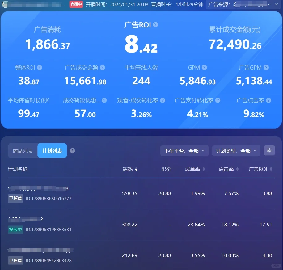 1.直播間觀看人數(shù)(UV):一場直播的總觀看人數(shù),例如,如果一場直播有10000人參加,則直播的觀看人數(shù)為10000人。 2. 直播間觀眾人數(shù)(PV):進入直播的觀眾總數(shù),例如,如果觀眾前后進入兩次,則觀眾人數(shù)為兩人。 3. 直播間點擊率:直播間點擊量=直播間點擊次數(shù)/直播間顯示次數(shù),反映直播的預(yù)覽界面是否有吸引力。 4. 付費直播銷售轉(zhuǎn)化率:計算公式為(直播間付費買家數(shù)/進入直播間總?cè)藬?shù))。100人進入直播間,3人賣貨,付費直播銷售轉(zhuǎn)化率為3%。 5. 小黃車:在直播間的右下角,可以添加小黃車。點擊后,會出現(xiàn)各種產(chǎn)品,客戶可以選擇購買。 6. 小風(fēng)車:點擊預(yù)約按鈕,留下你的電話號碼,適合商家遵守規(guī)定,引導(dǎo)交通。小鳳車和小黃車只能出現(xiàn)在一個直播間,不能同時出現(xiàn)。 7. 服務(wù)費:一般根據(jù)直播間的銷售收入,向直播機構(gòu)收取一定比例的服務(wù)費。 8. 控制評審:指對直播間評論板塊風(fēng)格的控制。一般情況下,主播會提前設(shè)置積極的互動氛圍,屏蔽一些負面關(guān)鍵詞,引導(dǎo)直播。 9. 平均每1000名進入直播間的用戶產(chǎn)生的每千次觀看的交易量,用于評估兒童直播間的轉(zhuǎn)化能力。 ? ROI:指廣告/廣告費用產(chǎn)生的銷售收入,如投資回報率。在電商領(lǐng)域,通常的計算公式是投資1萬元,賣出3萬元,RO1為1:3。 全球ROl:計算公式為(整個直播/廣告費用產(chǎn)生的銷售額)。 平均停留時間:每個進入直播間的人平均停留多長時間 衡量主播留存能力的計算公式為(總直播時長/總觀看人數(shù))。 產(chǎn)品點擊率:產(chǎn)品越有吸引力,主播的水平就越好,客戶也越容易點擊鏈接,從而獲得高點擊率。計算公式為(產(chǎn)品點擊量/進入直播間的人數(shù))。 SKU:如果一個產(chǎn)品有3種顏色,就相當(dāng)于有3種SKU規(guī)格。 Feed:(年齡、性別、手機型號)和其他商業(yè)流量池。 白標(biāo):指沒有品牌生產(chǎn)的產(chǎn)品,是一個品牌的相對概念,指一些小型制造商。 產(chǎn)品轉(zhuǎn)化率:反映直播間產(chǎn)品吸引用戶下單的能力,并計算公式冪(產(chǎn)品交易次數(shù)/產(chǎn)品點擊次數(shù)) 口碑評分:商家產(chǎn)品售出后,系統(tǒng)會根據(jù)產(chǎn)品評價、售后服務(wù)、投訴等多個維度綜合計算口碑評分,最高得5分??诒u分將顯示在直播間購物車中的產(chǎn)品詳情頁面和產(chǎn)品展示窗口等核心位置,幫助用戶做出更好的購買決策。