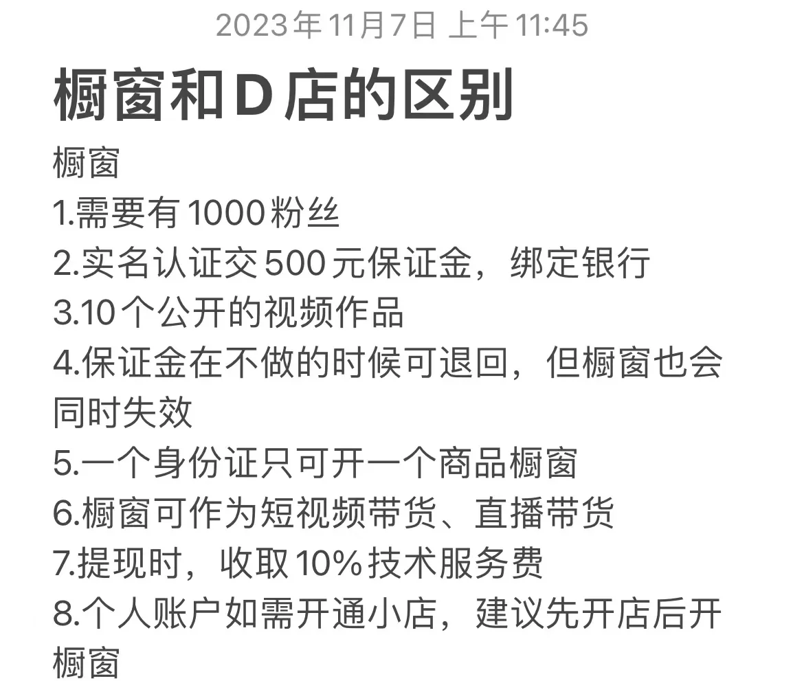 Showcase窗口 1.需要1000名追隨者 2.實(shí)名認(rèn)證,存款500元,綁定銀行 3.10公開的視頻作品 4.不使用時可以退還押金,但店面也將同時失效 5.一張身份證只能打開一個產(chǎn)品展示廳 6.展示案例可用于短視頻銷售和直播銷售 7.提款時將收取10%的技術(shù)服務(wù)費(fèi) 8.如果你需要為你的個人賬戶開一家小商店,建議先開商店,然后再開店面 D存儲 1.企業(yè)和個人業(yè)務(wù)部門可以申請 2.經(jīng)營范圍必須與營業(yè)執(zhí)照一致 3.按行業(yè)類別收取2000元至20000元不等的保險 證書押金(可退還) 4.你可以在D音樂選擇聯(lián)盟中搜索有影響力的人來推廣產(chǎn)品 5.你可以直播自己的產(chǎn)品,也可以親自飛到鏡頭前直播 6、公司開戶及收入轉(zhuǎn)公司賬戶、個人賬戶轉(zhuǎn)個人卡 7.開抖音店前不要打開櫥窗,開了店后直接打開櫥窗 8.直播只允許懸掛DJ商店的產(chǎn)品 g.最好在電腦上開一家音樂商店 10、開D店,贈送藍(lán)V不產(chǎn)生600元認(rèn)證費(fèi),后續(xù)每年認(rèn)證費(fèi)120元