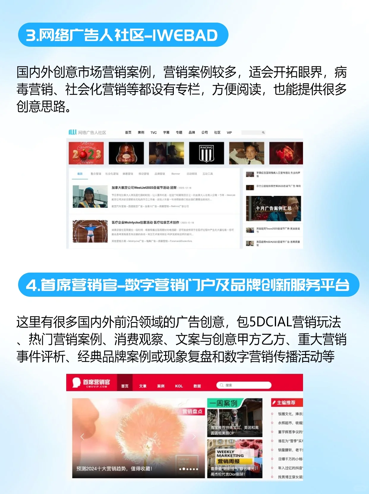 ?? 恭喜你,你又發(fā)現(xiàn)了一個(gè)寶藏干貨分享!這一次,小編將分享一些常見(jiàn)的想法和營(yíng)銷(xiāo)靈感網(wǎng)站,希望能有效地幫助規(guī)劃者拓寬國(guó)際視野? ? 以下網(wǎng)站包括營(yíng)銷(xiāo)、廣告、文案和創(chuàng)意 ? 大創(chuàng)意-PITCHINA-頂級(jí)創(chuàng)意社區(qū) ? Madison Bond-你自己的生活才是大創(chuàng)意 ? 互聯(lián)網(wǎng)廣告人社區(qū)-IWEBAD-國(guó)內(nèi)外創(chuàng)意營(yíng)銷(xiāo)案例 ? 首席營(yíng)銷(xiāo)官-數(shù)字營(yíng)銷(xiāo)門(mén)戶和品牌創(chuàng)新服務(wù)平臺(tái) ? SOCIALBETA-品牌營(yíng)銷(xiāo)案例和信息