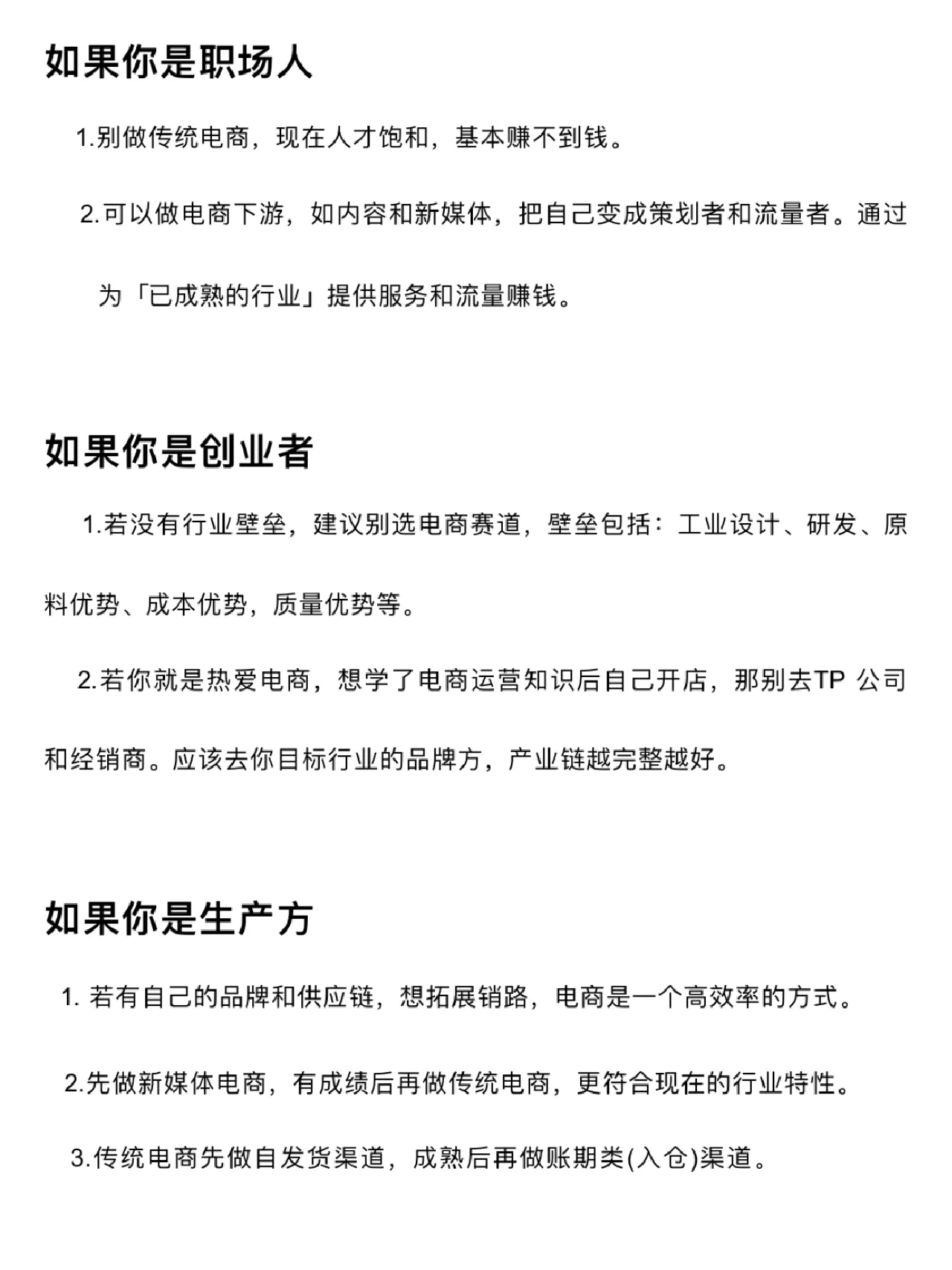 如果你是專業(yè)人士 1.不要從事傳統(tǒng)的電子商務(wù),因?yàn)槟壳叭瞬乓呀?jīng)飽和,你幾乎賺不到錢(qián)。 2.你可以做下游的電商,比如內(nèi)容和新媒體,把自己變成一個(gè)策劃者和流量驅(qū)動(dòng)者。采用 為成熟的行業(yè)提供服務(wù)和流量來(lái)賺錢(qián)。 如果你是一個(gè)企業(yè)家 1.如果沒(méi)有行業(yè)壁壘,建議不要選擇電商賽道。障礙包括工業(yè)設(shè)計(jì)、研發(fā)和原材料 材料優(yōu)勢(shì)、成本優(yōu)勢(shì)、質(zhì)量?jī)?yōu)勢(shì)等。 如果你對(duì)電子商務(wù)充滿熱情,想在開(kāi)店前了解電子商務(wù)運(yùn)營(yíng),不要去TP公司或經(jīng)銷(xiāo)商那里。你應(yīng)該去目標(biāo)行業(yè)的品牌方,產(chǎn)業(yè)鏈越完整越好。 如果你是制造商 如果你有自己的品牌和供應(yīng)鏈,并且想擴(kuò)大銷(xiāo)售渠道,電子商務(wù)是一種有效的方式。 2、從新媒體電商入手,先出成績(jī)?cè)購(gòu)膫鹘y(tǒng)電商入手,更符合當(dāng)下的行業(yè)特點(diǎn)。 3、傳統(tǒng)電商首先關(guān)注的是自營(yíng)渠道,成熟后再關(guān)注核算和倉(cāng)儲(chǔ)渠道。