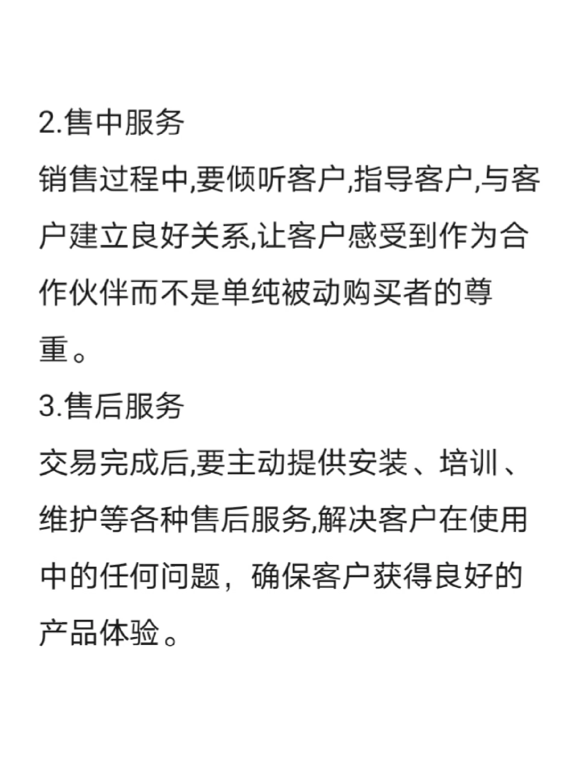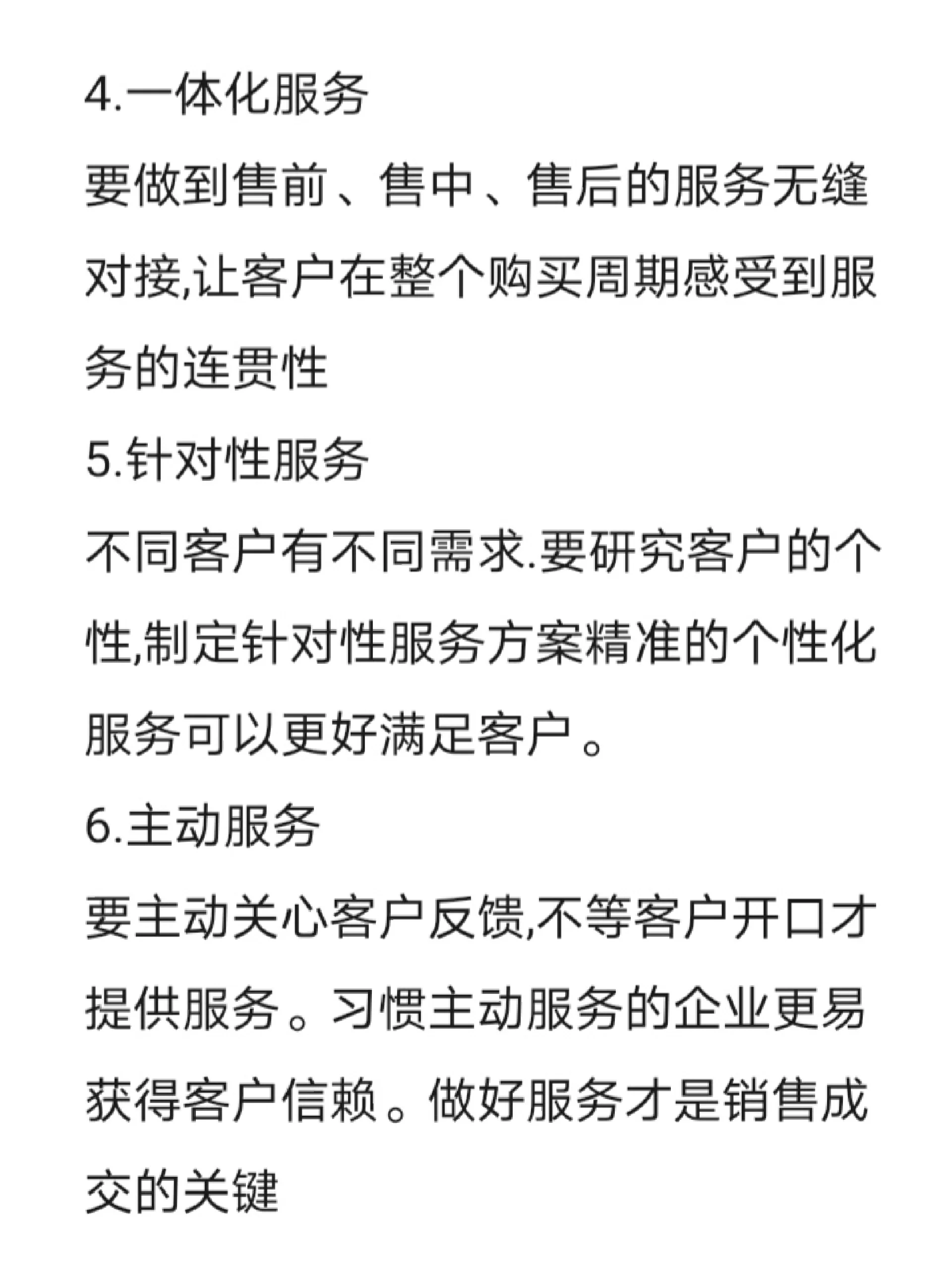 良好的服務(wù)是銷售和交易的關(guān)鍵,越來越多的企業(yè)意識(shí)到服務(wù)質(zhì)量是決定銷售和交易成敗的關(guān)鍵因素。與簡單的產(chǎn)品銷售相比,提供高質(zhì)量的服務(wù)更容易贏得客戶的支持和信任,從而實(shí)現(xiàn)交易。 ? 1.售前服務(wù) 在正式開始銷售之前,銷售人員應(yīng)該對產(chǎn)品和市場進(jìn)行徹底的研究,以了解客戶的背景和需求,并為他們的問題提供解決方案,而不是簡單地宣傳產(chǎn)品。 ? 2.銷售服務(wù) 在銷售過程中,重要的是傾聽客戶的意見,引導(dǎo)他們,與他們建立良好的關(guān)系,讓他們感覺到作為合作伙伴而不是被動(dòng)買家的尊重。 ? 3.售后服務(wù) 交易完成后,要主動(dòng)提供安裝、培訓(xùn)、維護(hù)等各種售后服務(wù),解決客戶在使用過程中可能遇到的任何問題,確保客戶獲得良好的產(chǎn)品體驗(yàn)。 ? 4.綜合服務(wù) 實(shí)現(xiàn)售前、售中、售后服務(wù)的無縫集成,讓客戶在整個(gè)購買周期中感受到服務(wù)的連續(xù)性 ? 5.有針對性的服務(wù) 不同的客戶有不同的需求。有必要研究他們的個(gè)性并制定有針對性的服務(wù)計(jì)劃。精準(zhǔn)的個(gè)性化服務(wù)可以更好地滿足客戶的需求。 ? 6.主動(dòng)式服務(wù) 積極主動(dòng)地關(guān)心客戶的反饋,等待客戶發(fā)言后再提供服務(wù)。習(xí)慣于主動(dòng)服務(wù)的企業(yè)更有可能獲得客戶的信任。良好的服務(wù)是銷售和交易的關(guān)鍵