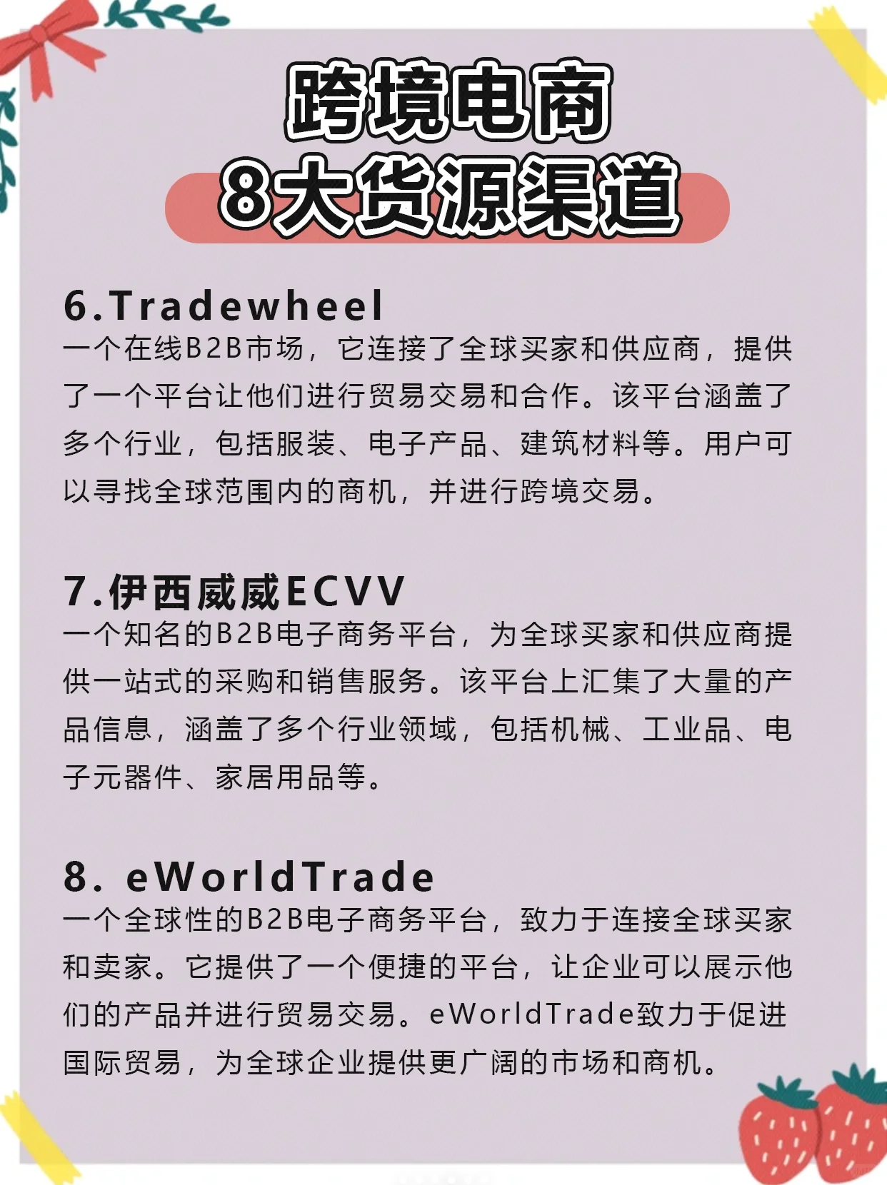 阿里巴巴國際站:作為全球最大的B2B交易平臺(tái)之一,阿里巴巴國際站連接著來自世界各地的制造商和買家。 環(huán)球資源:環(huán)球資源是一個(gè)致力于國際貿(mào)易的B2B平臺(tái),致力于為全球企業(yè)提供貿(mào)易機(jī)會(huì)。 中國制造:作為中國領(lǐng)先的B2B電子商務(wù)平臺(tái),中國制造專注于連接全球買家和中國制造商。 DHgate敦煌網(wǎng)站:一個(gè)全球B2B批發(fā)平臺(tái),提供來自中國的產(chǎn)品。 Tradekey:一個(gè)連接全球買家和賣家的全球B2B市場,提供各種各樣的產(chǎn)品和服務(wù)。 Tradewheel:一個(gè)新興的B2B平臺(tái),旨在促進(jìn)國際貿(mào)易并提供安全便捷的貿(mào)易服務(wù)。 ECVV:一個(gè)全球B2B平臺(tái),為買家和賣家提供方便的貿(mào)易渠道。 EWorldTrade:一個(gè)致力于連接全球供應(yīng)鏈的全球B2B交易平臺(tái)。 每個(gè)平臺(tái)都有其獨(dú)特的特點(diǎn)和服務(wù),選擇取決于企業(yè)的需求、產(chǎn)品類型和目標(biāo)市場。