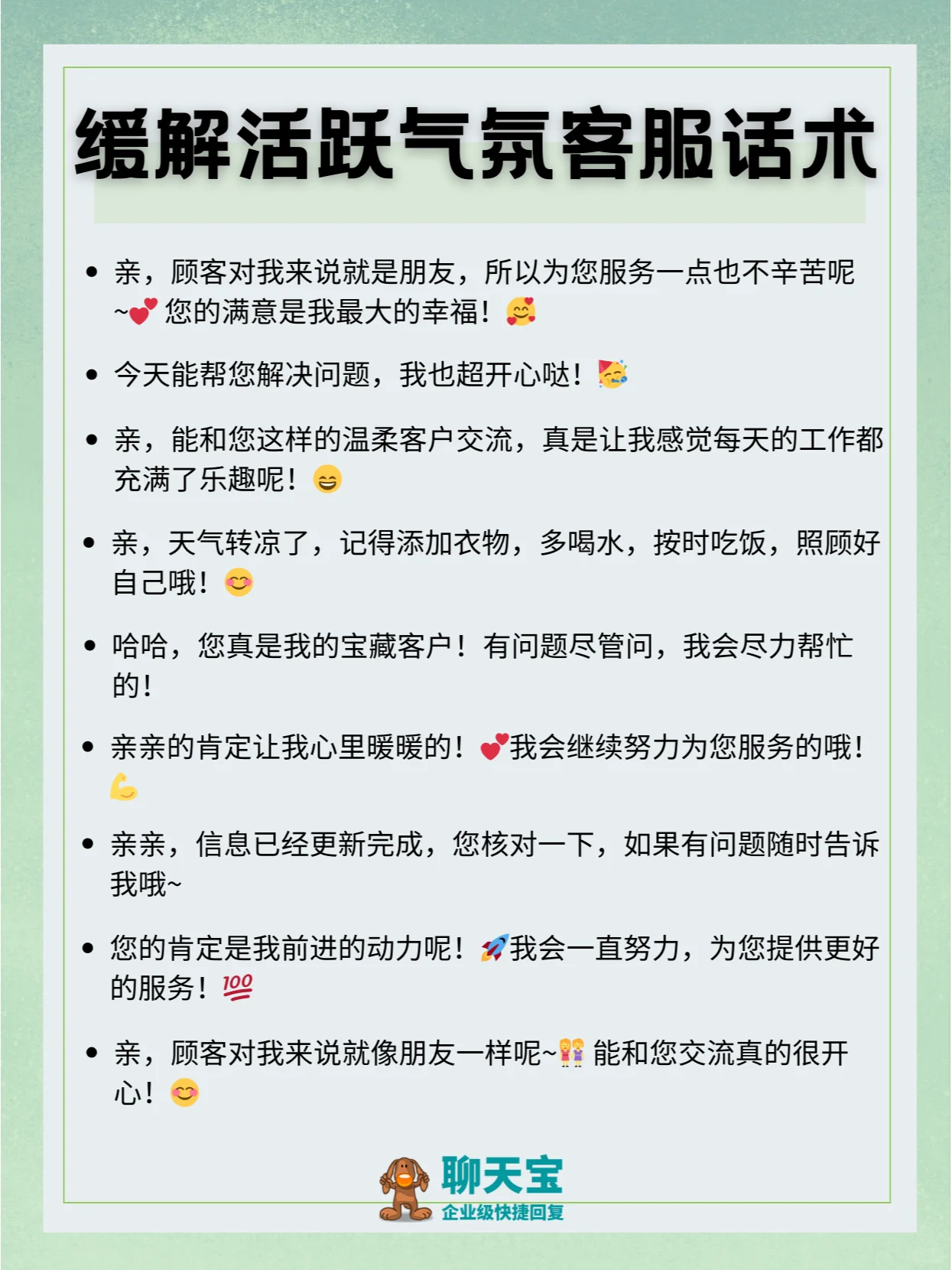在接受客戶咨詢時(shí),電子商務(wù)客服不可避免地會(huì)遇到一些尷尬的問(wèn)題,或者客戶來(lái)勢(shì)洶洶地提出問(wèn)題,這只會(huì)加劇氣氛。最后,他們喜歡投訴,感到憤怒、委屈和無(wú)助。因此,在許多氣氛不好的情況下,使用適當(dāng)?shù)恼Z(yǔ)言來(lái)緩解緊張氣氛,活躍氣氛,可以有效地改變聊天氣氛。 Chatbot為我們的客服代表編寫了幾個(gè)腳本來(lái)緩解活躍的氣氛,希望能幫助到每個(gè)人 我很高興今天能幫你解決問(wèn)題! 嘿,別緊張!有了我,問(wèn)題就不再是問(wèn)題了! 親愛的,你的耐心真的讓我感動(dòng)!我也想變得溫和,和你一起解決問(wèn)題! 把客戶當(dāng)成朋友,工作起來(lái)更輕松,不會(huì)覺(jué)得累~你的微笑是我最大的動(dòng)力! 親愛的,能夠與像你這樣溫和的客戶交流真的讓我覺(jué)得每天的工作都充滿了樂(lè)趣! 親愛的,這絕對(duì)讓我很高興。能為您服務(wù)是我的榮幸! 親愛的,天氣變冷了。記得加衣服,多喝水,按時(shí)吃飯,照顧好自己! 呵呵,親吻絕對(duì)讓我的心溫暖!我會(huì)繼續(xù)努力為您服務(wù)! 哈哈,你真是我的寶貝客戶!請(qǐng)隨時(shí)提出任何問(wèn)題,我會(huì)盡我所能提供幫助! 親愛的,信息已為您修改。請(qǐng)檢查一下是否正確~ 你的肯定是我前進(jìn)的動(dòng)力!我會(huì)一直努力為您提供更好的服務(wù)! 對(duì)我來(lái)說(shuō),顧客就是朋友,所以為你服務(wù)一點(diǎn)都不難嗎你的滿足是我最大的幸福! 親愛的,信息已更新。請(qǐng)檢查一下,如果你有任何問(wèn)題,請(qǐng)告訴我~ 親愛的,為了擁有一個(gè)好的身體,請(qǐng)注意保暖,多喝水,按時(shí)吃飯,并繼續(xù)支持我們! 非常感謝你的肯定。我將繼續(xù)保持我的熱情,為您提供高質(zhì)量的服務(wù)~ 非常感謝您的認(rèn)可!我也非常樂(lè)意為您服務(wù)! 親愛的,顧客對(duì)我來(lái)說(shuō)就像朋友一樣~我真的很高興能和你交流! 聊天機(jī)器人快速回復(fù)是使用專業(yè)語(yǔ)言和用戶友好的軟件來(lái)協(xié)助客戶服務(wù)。面對(duì)大量的詢問(wèn),打字更少,響應(yīng)迅速,并且可以輕松發(fā)送文本和圖像來(lái)完成一切