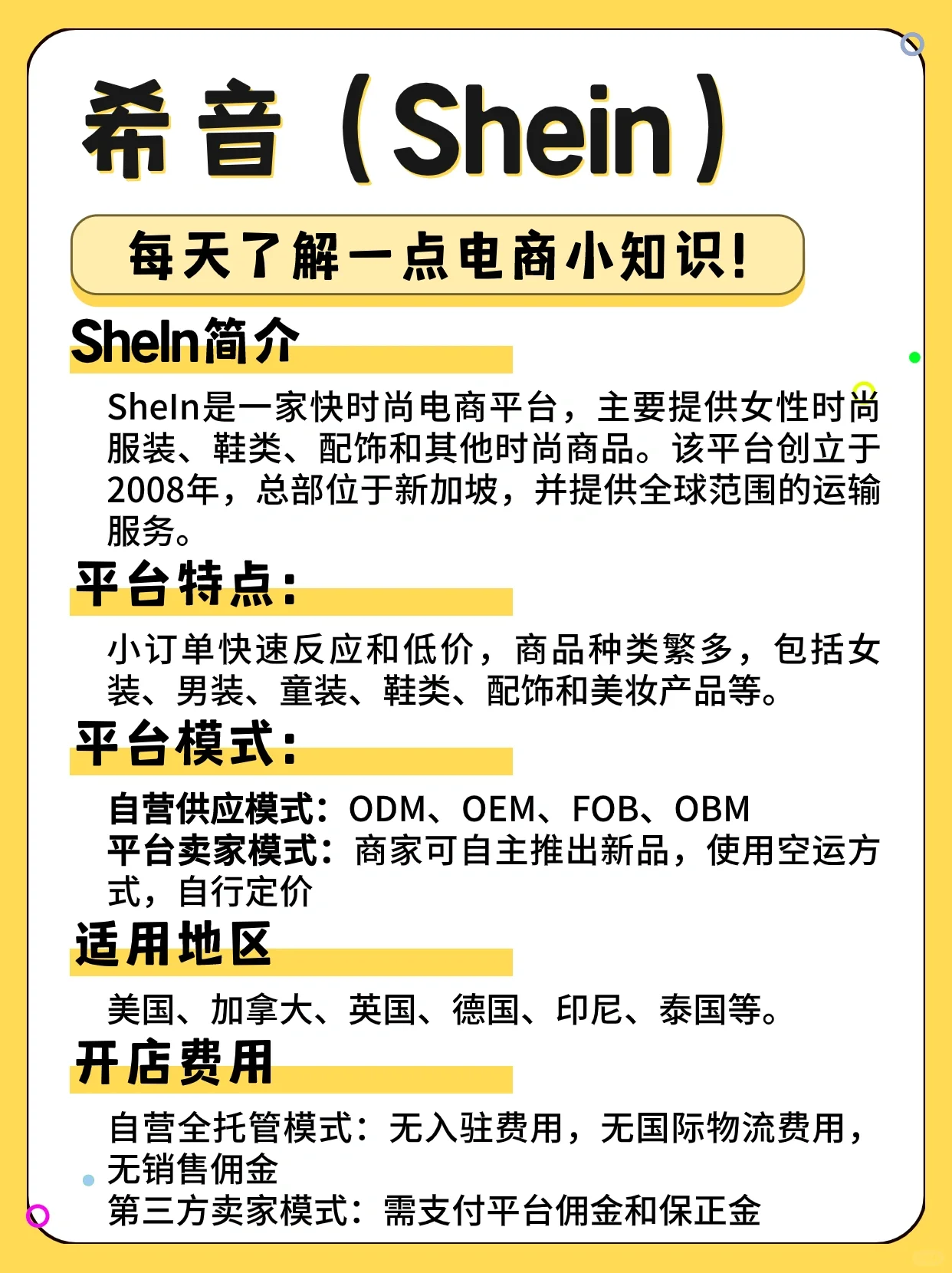 SheIn簡介 SheIn是一個(gè)快速時(shí)尚電商平臺(tái),主要提供女性時(shí)尚服裝、鞋子、配飾等時(shí)尚產(chǎn)品。該平臺(tái)成立于2008年,總部位于新加坡,提供全球運(yùn)輸服務(wù)。 平臺(tái)功能: 小訂單反應(yīng)迅速,價(jià)格低廉,產(chǎn)品種類繁多,包括女裝、男裝、童裝、鞋類、配飾和美容產(chǎn)品。 平臺(tái)模式: 自營模式: ODM(強(qiáng)大的商戶開發(fā)和設(shè)計(jì)能力) OEM(商家根據(jù)圖紙制作板材的能力很強(qiáng)) FOB(商家強(qiáng)大的生產(chǎn)管理能力) OBM全托管模式:商家提供產(chǎn)品,平臺(tái)負(fù)責(zé)運(yùn)營 平臺(tái)賣家模式:商家可以獨(dú)立推出新產(chǎn)品,使用空運(yùn),并自行定價(jià) 主要適用地區(qū):美國、加拿大、英國、德國、印度尼西亞、泰國等。 期初費(fèi)用: 自營全托管模式:無入場(chǎng)費(fèi),無國際物流費(fèi),無銷售傭金 第三方賣家模式:需要支付平臺(tái)傭金和保證金 SheIn是目前在海外市場(chǎng)發(fā)展迅速的公司之一。希望盡快了解這個(gè)平臺(tái)的同學(xué)們一定要抓緊時(shí)間!