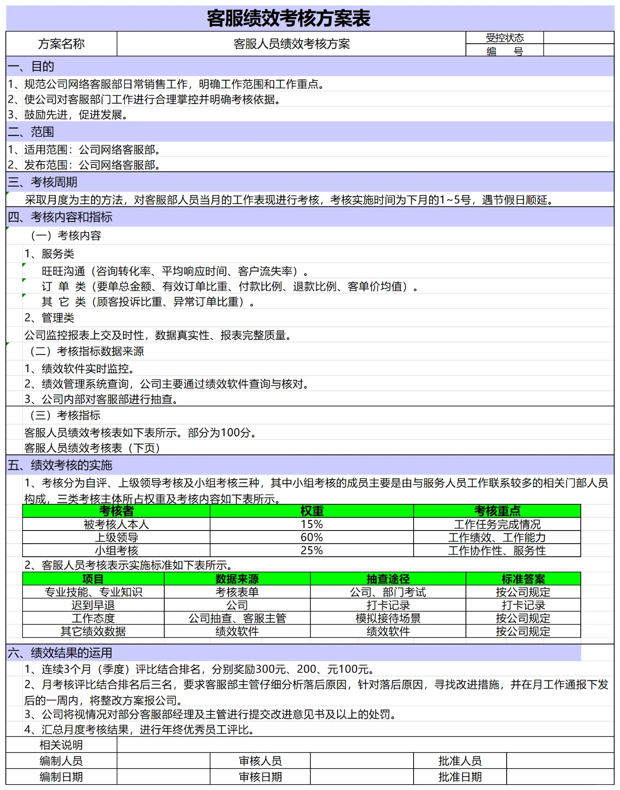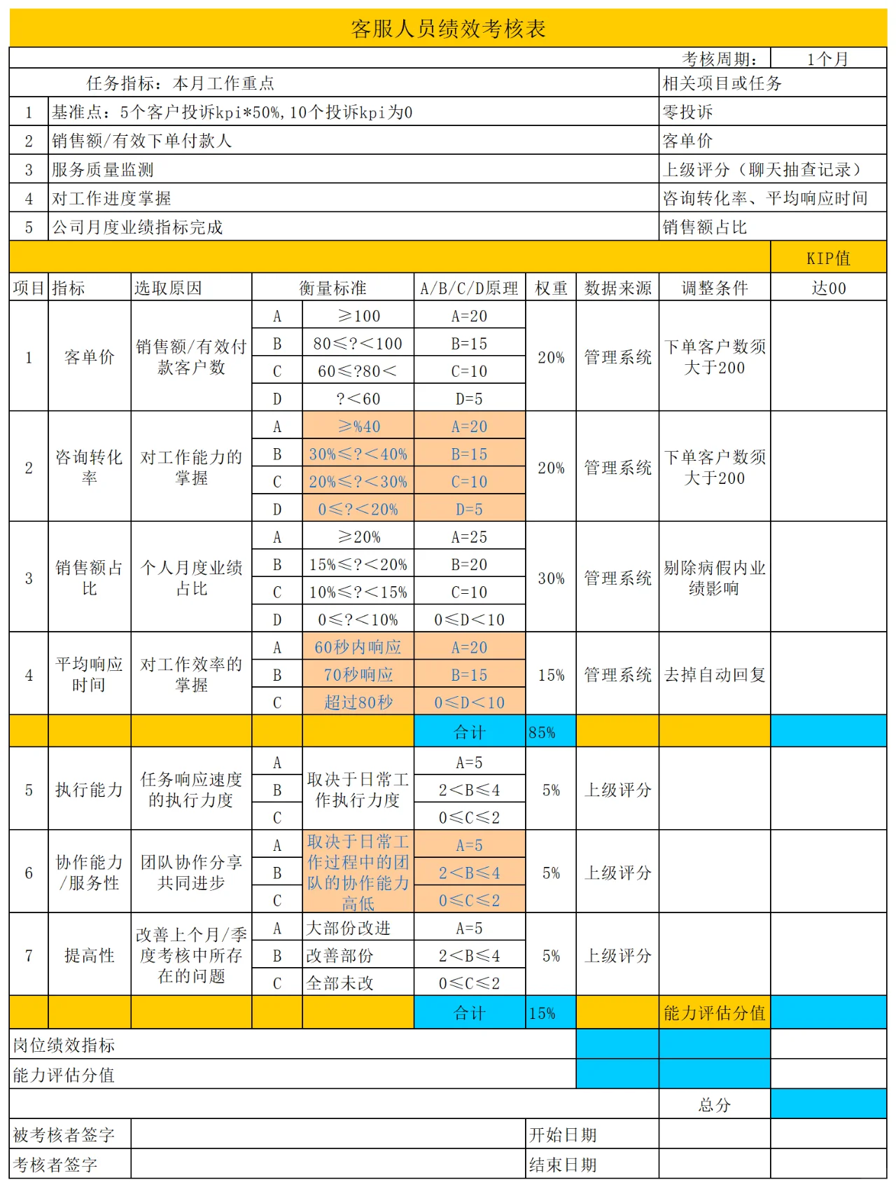 電子商務(wù)客戶服務(wù)績(jī)效實(shí)施計(jì)劃通常需要考慮以下核心要素,以確??蛻舴?wù)質(zhì)量和業(yè)務(wù)目標(biāo)的實(shí)現(xiàn): 1.性能指標(biāo)設(shè)置 響應(yīng)時(shí)間:記錄從客戶發(fā)起查詢到客服人員第一次響應(yīng)的時(shí)間。 解決率:計(jì)算在一定時(shí)間內(nèi)(如24小時(shí)、48小時(shí))成功解決客戶問(wèn)題或投訴的比例。 滿意度評(píng)估:收集和分析客戶對(duì)服務(wù)的滿意度評(píng)級(jí)。 訂單轉(zhuǎn)化率:客戶服務(wù)可以處理的訂單比例。 漲價(jià):通過(guò)有效推薦或升級(jí)服務(wù),提高個(gè)人客戶的購(gòu)買金額。 重復(fù)訪客接待:對(duì)于同一客戶的多次詢問(wèn),評(píng)估客服維護(hù)客戶關(guān)系的能力。 知識(shí)庫(kù)利用率:使用標(biāo)準(zhǔn)答案解決問(wèn)題的比例,反映客服專業(yè)知識(shí)掌握水平。 績(jī)效評(píng)價(jià)體系 基本得分:根據(jù)日常工作的完成情況,給予基本得分。 激勵(lì)加分:獎(jiǎng)勵(lì)超出預(yù)期的行為,如高滿意度反饋、成功留住潛在流失客戶等。 扣分:處理不當(dāng)導(dǎo)致客戶投訴升級(jí)、嚴(yán)重逾期回復(fù)等應(yīng)被扣分。 3.培訓(xùn)與發(fā)展 定期進(jìn)行技能和服務(wù)態(tài)度培訓(xùn),提高團(tuán)隊(duì)整體服務(wù)水平。 根據(jù)績(jī)效評(píng)估結(jié)果,為優(yōu)秀客服代表提供晉升渠道或?qū)I(yè)技能培訓(xùn)機(jī)會(huì)。 4.實(shí)時(shí)監(jiān)控和反饋 使用CRM系統(tǒng)實(shí)時(shí)監(jiān)控客戶服務(wù)工作狀態(tài)和績(jī)效數(shù)據(jù)。 每周/每月進(jìn)行數(shù)據(jù)分析,提供改進(jìn)建議,并及時(shí)與客服進(jìn)行一對(duì)一溝通指導(dǎo)。 5.激勵(lì)機(jī)制 設(shè)立月度/季度/年度優(yōu)秀客戶服務(wù)獎(jiǎng),發(fā)放獎(jiǎng)金或其他形式的物質(zhì)獎(jiǎng)勵(lì)。 根據(jù)績(jī)效評(píng)估結(jié)果調(diào)整薪酬結(jié)構(gòu),如設(shè)置績(jī)效獎(jiǎng)金、傭金制度等。 在實(shí)施過(guò)程中,要根據(jù)公司的實(shí)際情況和行業(yè)特點(diǎn),靈活調(diào)整計(jì)劃,并不斷優(yōu)化和改進(jìn)。同時(shí),也要注意客服人員的心理壓力和工作強(qiáng)度,保持良好的團(tuán)隊(duì)氛圍和員工關(guān)懷。