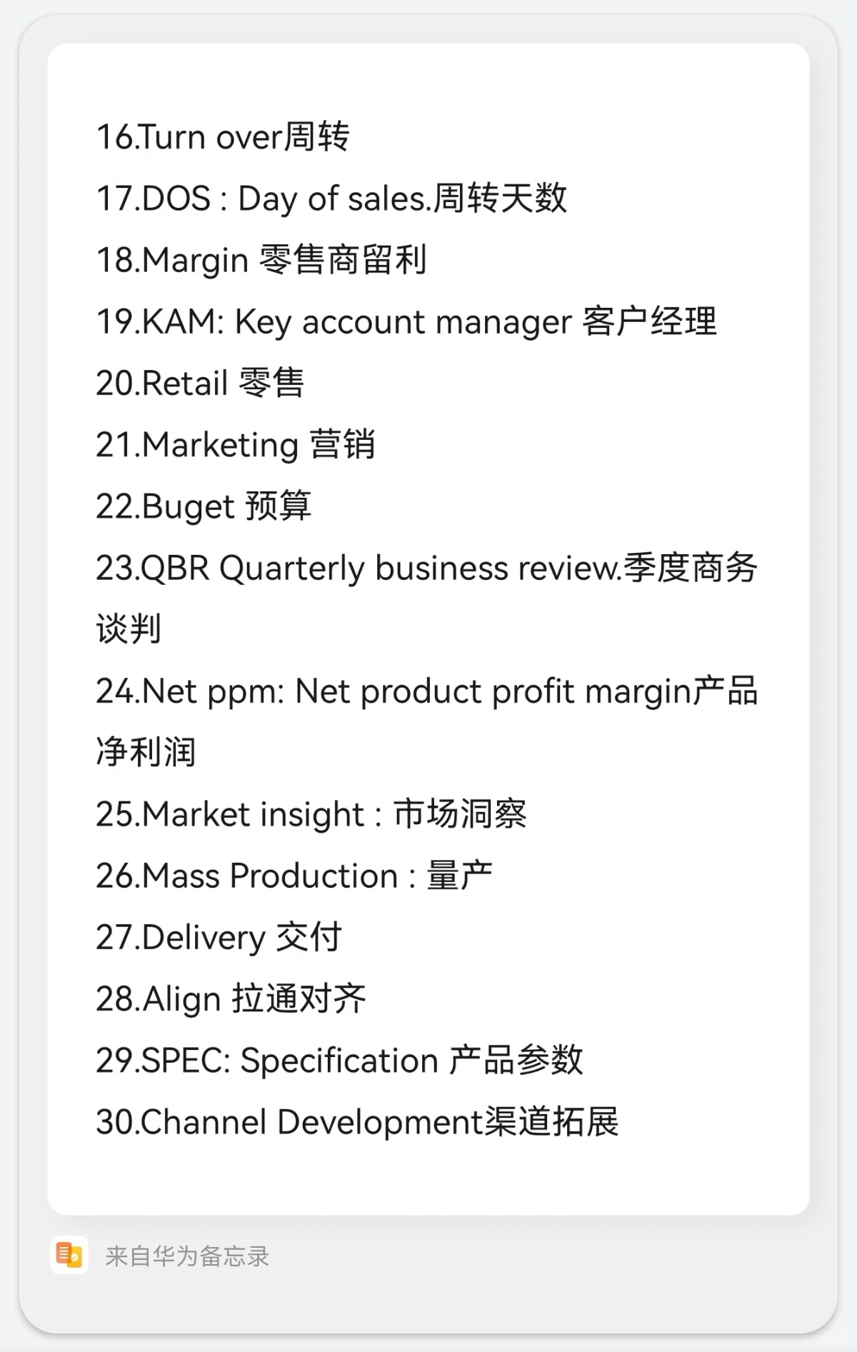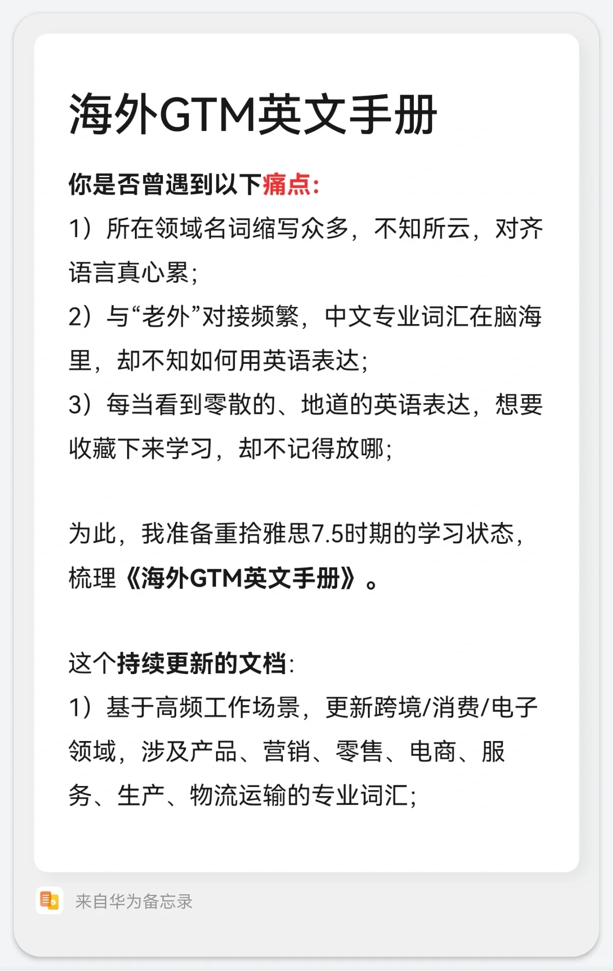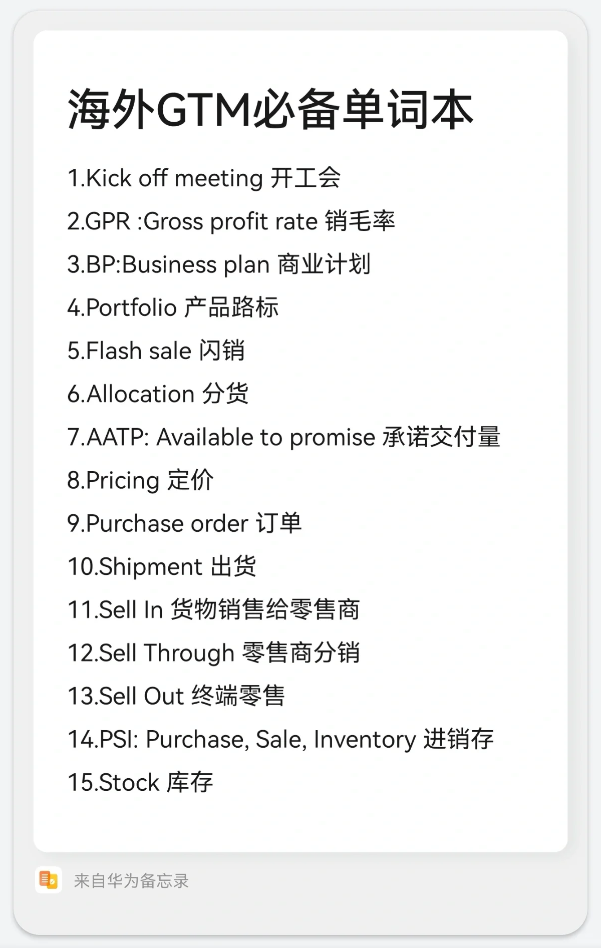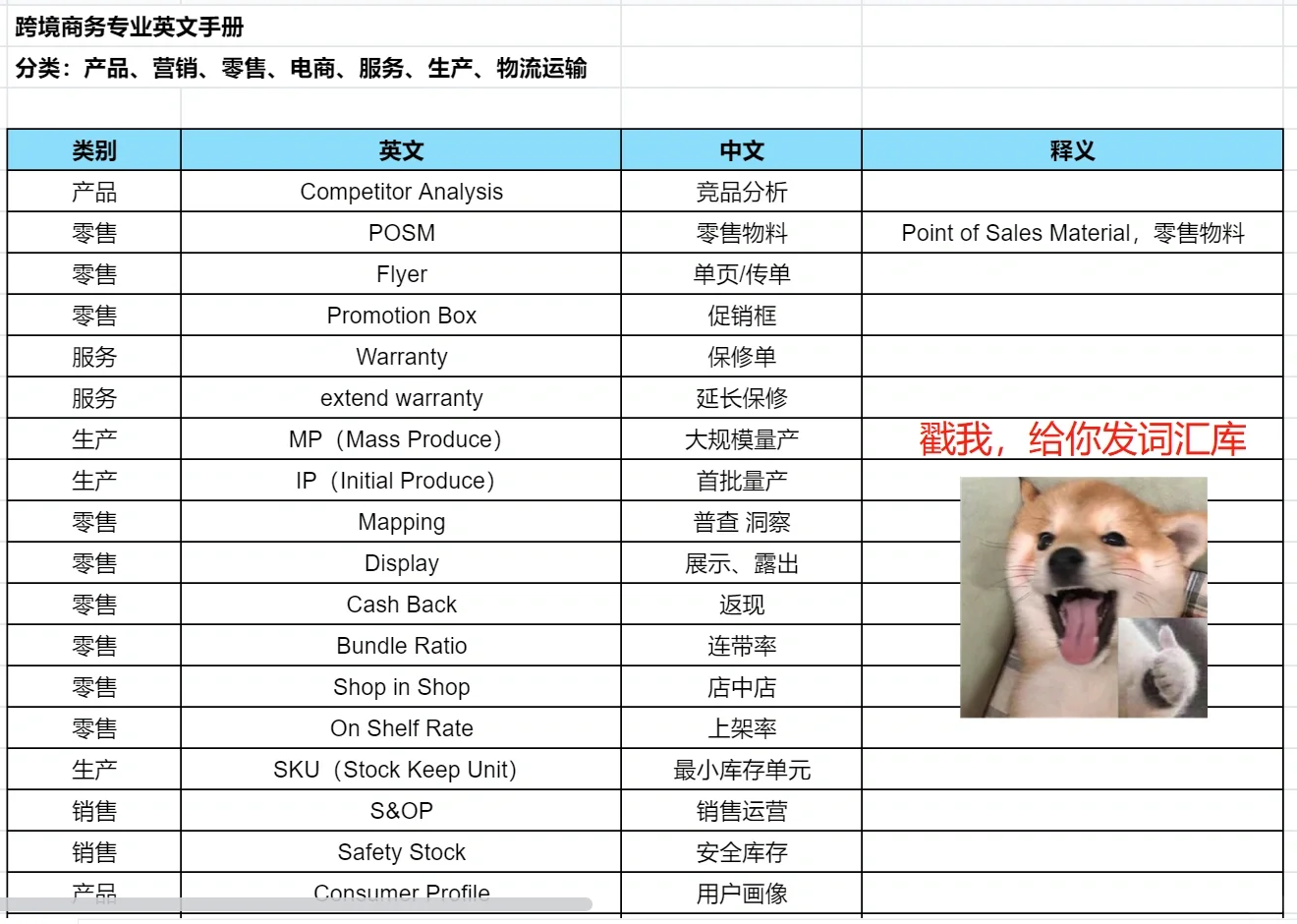 你是否遇到過以下痛點: 1) 這個領(lǐng)域有很多術(shù)語的縮寫,我對它們并不熟悉。協(xié)調(diào)語言確實很累; 2) 經(jīng)常與“外國人”交流,心里想著漢語專業(yè)詞匯,卻不知道如何用英語表達; 3) 每當我看到零散而真實的英語表達時,我想把它們存起來學(xué)習(xí),但我不記得放在哪里了; [列表R]為此,我準備重新審視雅思7.5期間的學(xué)習(xí)狀況,并組織《海外GTM英語手冊》 這份不斷更新的文件: 1) 基于高頻工作場景,更新與跨境/消費/電子領(lǐng)域相關(guān)的專業(yè)詞匯,包括產(chǎn)品、營銷、零售、電子商務(wù)、服務(wù)、生產(chǎn)和物流運輸; 2) 具有中文翻譯和口譯功能,方便初學(xué)者入門,標記分類,方便有經(jīng)驗的司機篩選; 3) 持續(xù)更新此帖子,并建立在線數(shù)據(jù)庫,以便隨時按需搜索、添加或刪除。請隨意詢問; 適合的受眾: 1) 海外GTM、供應(yīng)鏈和MKT從業(yè)者/ 2) 跨境亞馬遜業(yè)務(wù) 3) 外國企業(yè)工人 4) 商務(wù)英語從業(yè)者和在校學(xué)生