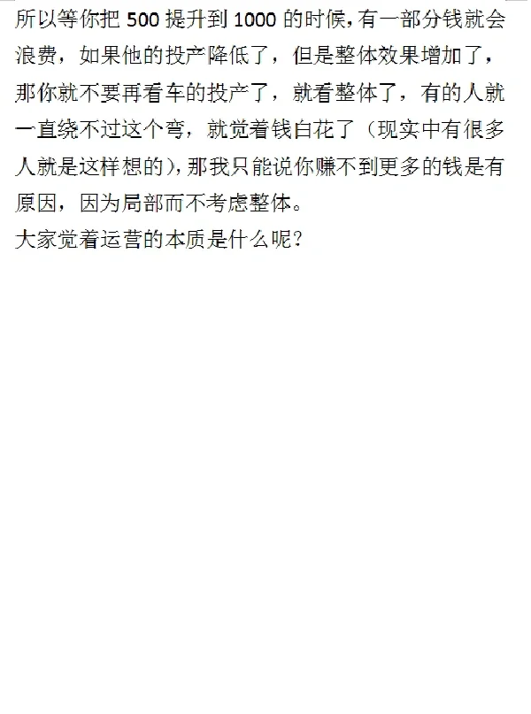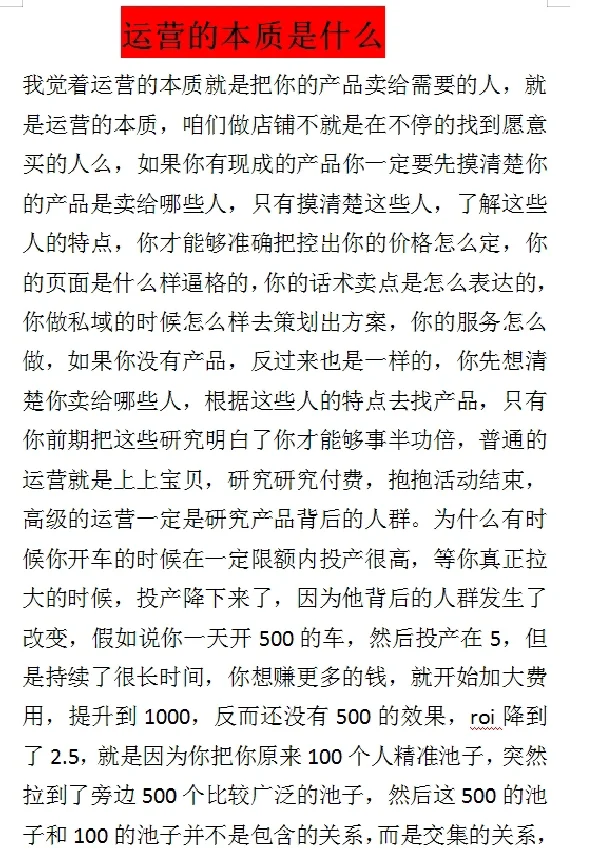 運(yùn)營(yíng)的本質(zhì)是什么 我認(rèn)為運(yùn)營(yíng)的本質(zhì)是把你的產(chǎn)品賣給有需要的人,這就是運(yùn)營(yíng)的本質(zhì)。當(dāng)我們經(jīng)營(yíng)一家商店時(shí),我們會(huì)不斷地找到愿意購(gòu)買的人。如果你有現(xiàn)成的產(chǎn)品,你必須首先了解你的產(chǎn)品賣給了誰。只有了解這些人和他們的特點(diǎn),你才能準(zhǔn)確地控制你如何定價(jià),你的頁面是什么樣的,你的語言和賣點(diǎn)是如何表達(dá)的,你在做私域時(shí)如何規(guī)劃你的計(jì)劃,以及你如何提供服務(wù)。如果你沒有產(chǎn)品,反之亦然。你首先想一想你賣給了誰,并根據(jù)他們的特點(diǎn)找出他們,你就可以找出你賣給了哪些人。產(chǎn)品,只有在早期了解這些研究,才能達(dá)到事半功倍的效果。普通的操作就像高檔的珍寶,研究付費(fèi),擁抱活動(dòng)結(jié)束。高水平的操作必須是研究產(chǎn)品背后的受眾。為什么有時(shí)你在駕駛時(shí)會(huì)在一定的限度內(nèi)獲得高產(chǎn)量,而當(dāng)你真的提高產(chǎn)量時(shí),產(chǎn)量就會(huì)下降因?yàn)樗澈蟮挠^眾已經(jīng)改變了。如果你每天開500輛車,然后在5點(diǎn)開始生產(chǎn),但這種情況持續(xù)很長(zhǎng)一段時(shí)間,而且你想賺更多的錢,你開始將成本提高到1000輛,但還沒有達(dá)到500輛的效果。投資回報(bào)率降低到2.5,因?yàn)槟阃蝗话言瓉淼?00人精密人才庫(kù)拉到了旁邊的500個(gè)相對(duì)較寬的人才庫(kù),而這500個(gè)人才庫(kù)和100個(gè)人才庫(kù)并不是一種包容性的關(guān)系,而是一種交叉關(guān)系。因此,當(dāng)你增加500到1000時(shí),有一部分錢會(huì)被浪費(fèi)掉。如果產(chǎn)量減少了,但總體效果增加了,那么你就不需要再看汽車的產(chǎn)量了。你只需要看看全局。有些人就是無法繞過這條曲線,覺得錢被浪費(fèi)了(事實(shí)上,很多人是這么認(rèn)為的)。所以,我只能說,你賺不到更多的錢是有原因的,因?yàn)槟銢]有考慮全局,而不是具體方面。
