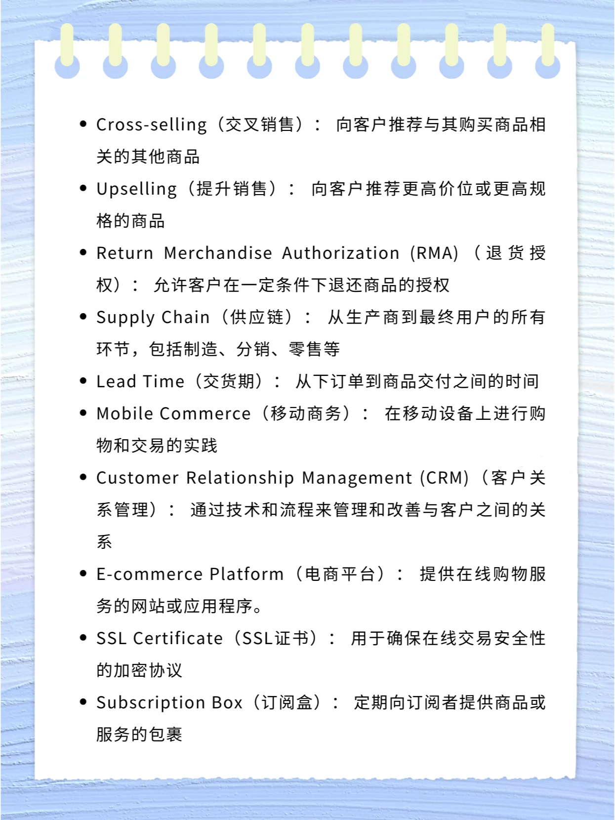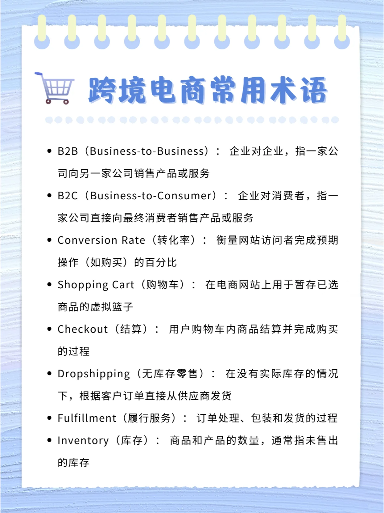在電子商務領域,有許多常用術語涵蓋了從網(wǎng)上購物到供應鏈管理的各個方面。以下是一些常用的電子商務術語: B2B(企業(yè)對企業(yè)):企業(yè)對企業(yè)是指從一家公司向另一家公司銷售產(chǎn)品或服務。 B2C(企業(yè)對消費者):企業(yè)對消費者是指直接向終端消費者銷售產(chǎn)品或服務的公司。 轉化率:衡量網(wǎng)站訪問者完成預期操作(如購買)的百分比。 購物車:電子商務網(wǎng)站上用于臨時存儲選定商品的虛擬購物籃。 結賬:用戶在購物車中結算并完成商品購買的過程。 直運:根據(jù)客戶訂單直接從供應商發(fā)貨,無需實際庫存。 履行:訂單處理、包裝和運輸?shù)倪^程。 存貨:貨物和產(chǎn)品的數(shù)量,通常指未售出的存貨。 交叉銷售:指與客戶購買相關的其他產(chǎn)品。 促銷:向客戶推薦價格或規(guī)格更高的產(chǎn)品。 退貨商家授權(RMA):允許客戶在特定條件下退貨的授權。 供應鏈:從制造商到最終用戶的所有環(huán)節(jié),包括制造、分銷、零售等。 交付周期:從下訂單到交貨的時間。 移動商務:在移動設備上購物和交易的實踐。 客戶關系管理(CRM):通過技術和流程管理和改善與客戶的關系。 電子商務平臺:提供在線購物服務的網(wǎng)站或應用程序。 SSL證書:用于確保在線交易安全的加密協(xié)議。 訂閱箱:定期向訂閱用戶提供商品或服務的包裹。