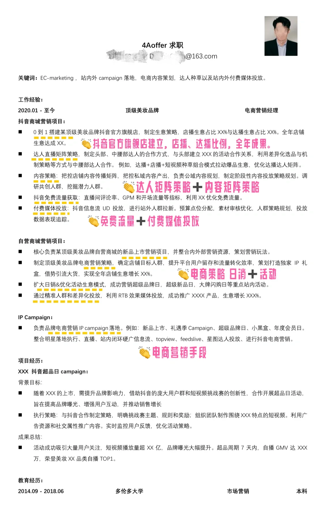 做4A offer的好朋友,提高簡歷通過率,優(yōu)化要求 - ? 4 offer分享:如何寫一份跳槽薪水翻倍的電商營銷簡歷 對電子商務營銷感興趣的姐妹?? - 簡歷背景:長期服務于頂級美容品牌,電子商務營銷經(jīng)理。 - 電商營銷的內(nèi)容分為三個模塊:DY商城營銷項目、自營商城營銷項目和IP戰(zhàn)役。 抖音商城營銷項目: 從0到1,抖音官方旗艦店將建成。 DY官方開店,門店直播 實現(xiàn)廣播率和年度業(yè)績。 為有影響力的人制定直播矩陣戰(zhàn)略,并為頂級和中級有影響力的人士制定合作方法。 大Bo商店廣播在短視頻中種草。 內(nèi)容戰(zhàn)略。 內(nèi)容傳播矩陣戰(zhàn)略。 免費獲取流量。 直播間評論率? GPM? 開放交通。 【四盧比】付費媒體植入。 信息流? 車站外的新兵 自營商城營銷項目: 自營商場新品首發(fā)營銷項目, 整合內(nèi)外部營銷資源? 制定營銷策略。 電子商務營銷策略、留存與轉(zhuǎn)化, 打造專屬IP禮盒? 利用這種情況吸引大批貨物。 拓展日常銷售,優(yōu)化活動商業(yè)模式, 超級品牌日、超級新品日、大品牌搶購日等重點現(xiàn)場活動成功營銷。 通過精準定位和差異化廣告, 利用RTB效果媒體進行廣告宣傳。 IP運動: 負責品牌電商營銷IP活動的實施。例如:新品發(fā)布會、禮品季活動、超級品牌日、小黑盒、年度會員日。集明星落地執(zhí)行、直播、站內(nèi)閉環(huán)硬播信息流、topview、feedslip、星圖達人投放、抖音電商營銷于一體。 電子商務營銷方法。 - 提示: 簡歷的關(guān)鍵詞:電子商務營銷、現(xiàn)場和場外活動落地、電子商務內(nèi)容規(guī)劃、影響者營銷以及現(xiàn)場和場外的付費媒體廣告。