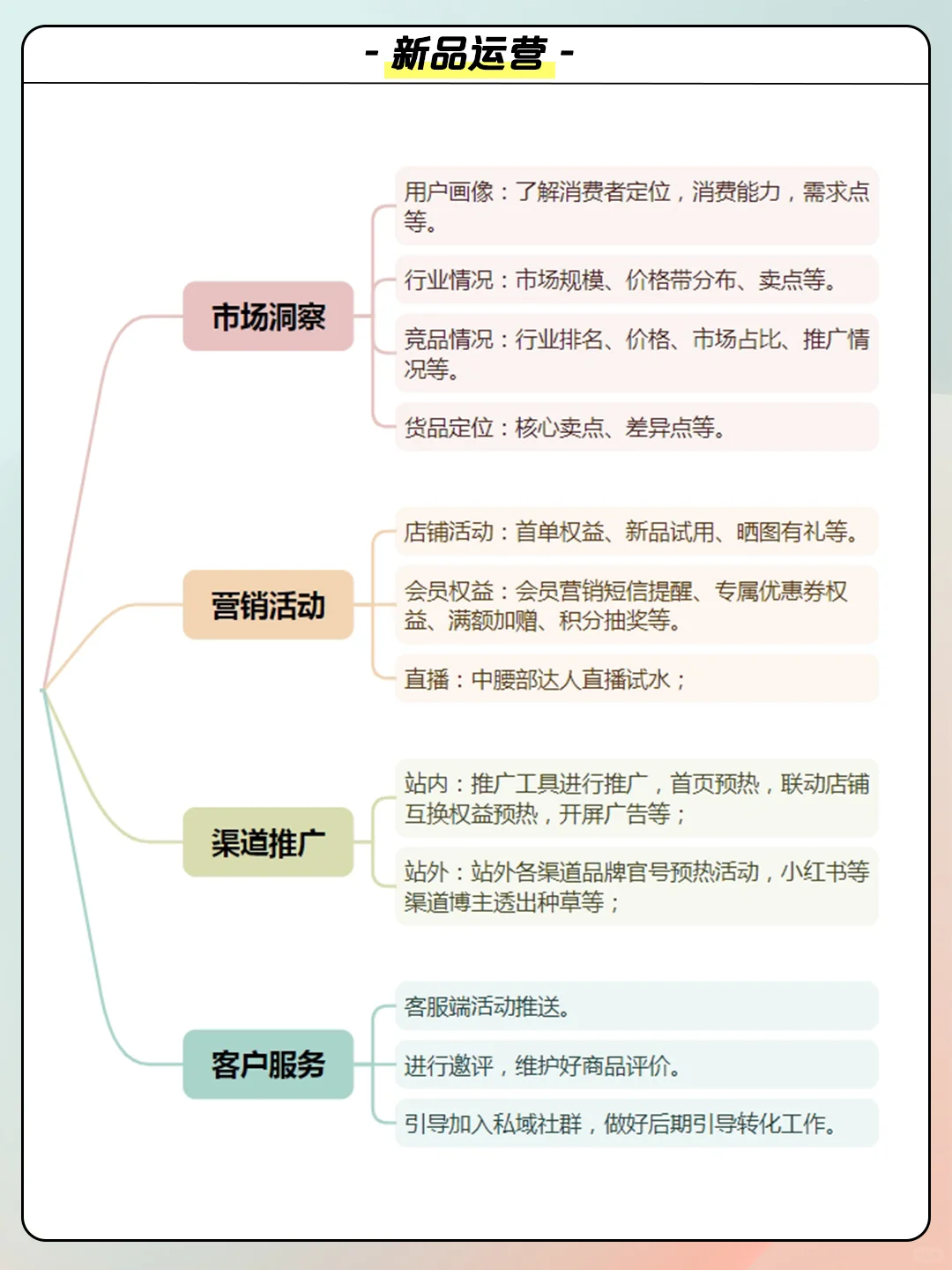 ? 24年后開始新的一天計劃。經(jīng)過一年的工作,你有什么收獲 ? 我相信在過去的24年里,許多品牌都策劃了許多新產(chǎn)品,如何運營好新產(chǎn)品并進一步提高門店銷售額是他們運營中的一個重要問題。 ? 新產(chǎn)品運營規(guī)劃可以從四個方面進行。 ? 市場洞察:從市場洞察中,人們可以學(xué)到很多信息,了解競爭對手的信息,并確定自己的新產(chǎn)品運營策略。 ? 營銷活動:提交平臺新品支持活動,獲得新品流量支持。與會員、直播等活動合作,積累前期新產(chǎn)品的銷量。 ? 渠道推廣:將在內(nèi)部和外部渠道上持續(xù)努力,增加新產(chǎn)品的曝光率,并引導(dǎo)購買轉(zhuǎn)化。 ? 客戶服務(wù):提供卓越的客戶服務(wù),并保持對新產(chǎn)品的好評。