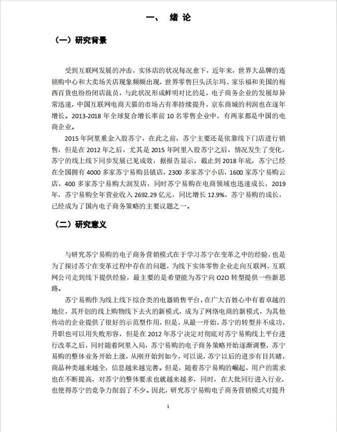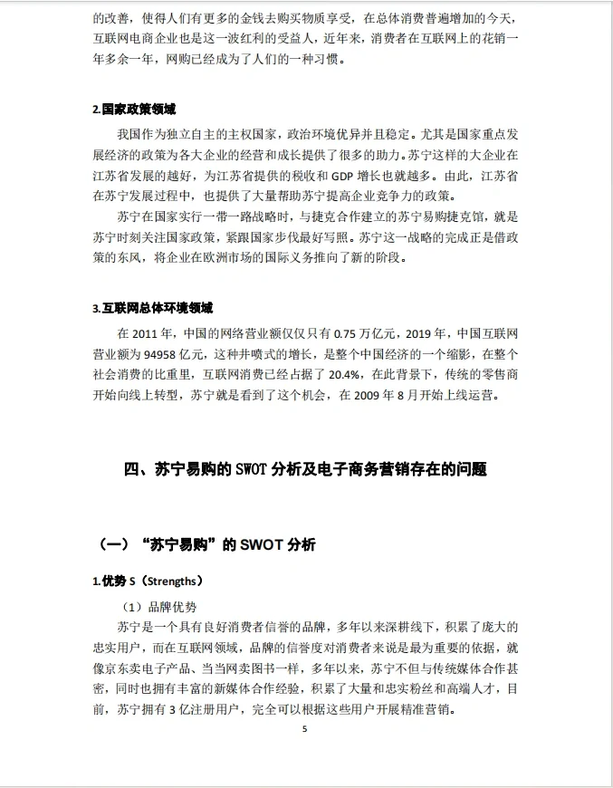 題目:蘇寧電子商務(wù)營銷策略研究 目錄 內(nèi)容摘要一 摘要二 1、 引言1 (1) 研究背景1 (2) 研究意義1 (3) 研究內(nèi)容與方法2 1.研究內(nèi)容2 2.研究方法2 2、 電子商務(wù)營銷基礎(chǔ)理論與文獻(xiàn)綜述2 (1) 電子商務(wù)營銷基礎(chǔ)理論2 (2) 國內(nèi)外研究現(xiàn)狀文獻(xiàn)綜述3 3、 蘇寧電子商務(wù)營銷策略分析4 (1) 蘇寧易購公司簡介4 (2) 蘇寧易購4公司發(fā)展現(xiàn)狀 (3) 蘇寧易購?fù)獠凯h(huán)境分析4 1.消費(fèi)者領(lǐng)域4 2.國家政策領(lǐng)域5 3.互聯(lián)網(wǎng)的整體環(huán)境5 4、 蘇寧易購SWOT分析及電子商務(wù)營銷中存在的問題5 (1) 蘇寧易購SWOT分析5 1.優(yōu)勢5 2.弱點(diǎn)6 3.機(jī)會O(機(jī)會)7 4.威脅7 (2) “蘇寧網(wǎng)”電商營銷存在的問題8 1.線上線下定位不清8 2.經(jīng)驗(yàn)薄弱,信用體系不完善8 3.與消費(fèi)者互動不暢8 4.價(jià)格定位不明確9 5、 蘇寧電商營銷建議9 (1) 在線和離線營銷協(xié)作9 (2) 改善信用體系10 (3) 加強(qiáng)與消費(fèi)者的溝通11