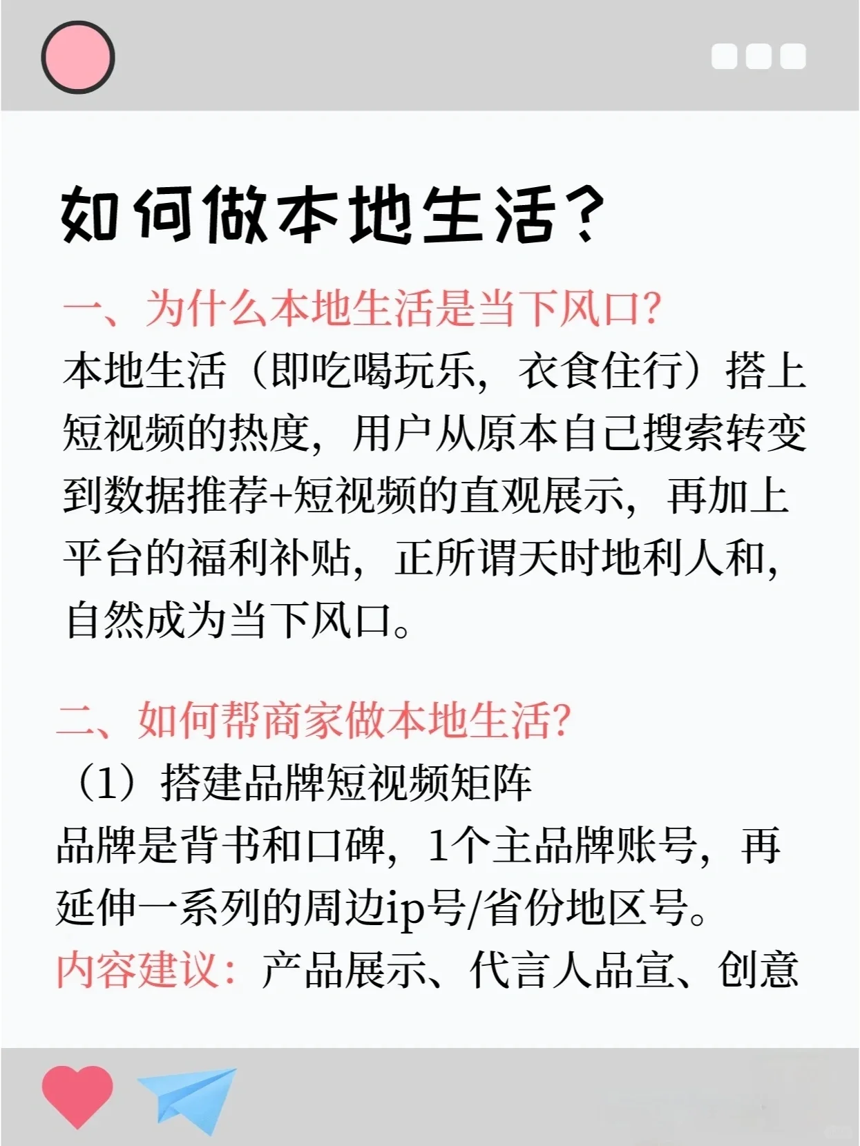 如何做好本地營銷 簡(jiǎn)單地說,鄉(xiāng)土生活是指與我們?nèi)粘I蠲芮邢嚓P(guān)的衣食住行。如果你不熟悉當(dāng)?shù)厣钸@個(gè)詞,那么你最近一定通過短視頻瀏覽了附近的許多美食和樂趣,或者你已經(jīng)吃了很多次了。 作為一個(gè)運(yùn)營商,你應(yīng)該已經(jīng)注意到了下一個(gè)趨勢(shì),那就是伴隨著短視頻的勢(shì)頭而來的本土生活方式,也是各平臺(tái)拉攏商家的必備“肥肉”。 那么今天,我們就從以下三個(gè)方面來談?wù)勅绾巫龊绵l(xiāng)土生活 為什么本地生活是當(dāng)前的趨勢(shì) 如何幫助商家做好當(dāng)?shù)厣? 如何改進(jìn)本地生活的離線驗(yàn)證 “本地生活”這個(gè)詞并不陌生,但它的營銷形式已經(jīng)從1.0的圖文時(shí)代變成了現(xiàn)在的2.0的短視頻時(shí)代。在過去,探索商店都是關(guān)于圖形和文本的,然后每個(gè)人都在第三方平臺(tái)上搜索。如今,在短視頻時(shí)代,與1.0圖文相比,顯示更直接、更生動(dòng),游戲性也更多樣,這也縮短了用戶觀看和下單的路徑。 所以與其關(guān)注本地生活,不如談?wù)劚镜厣钍侨绾螐亩桃曨l的1.0時(shí)代轉(zhuǎn)變?yōu)?.0時(shí)代的。這應(yīng)該會(huì)讓它更容易理解和開始。