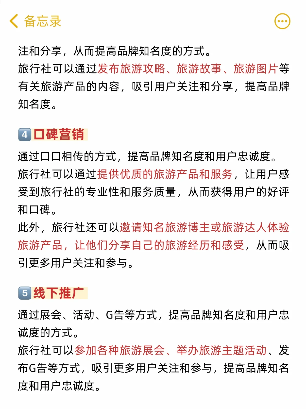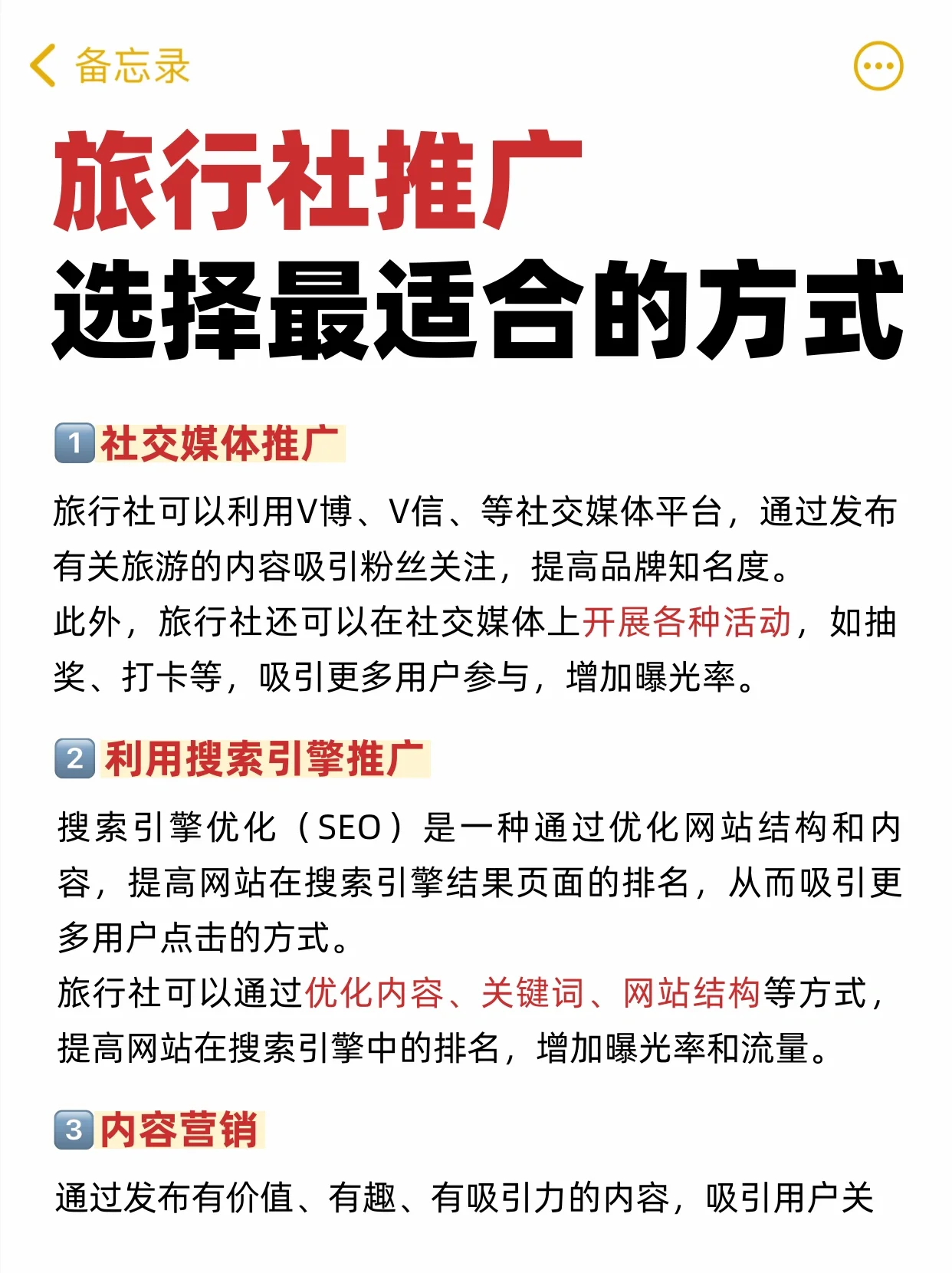 疫情結(jié)束后,旅游業(yè)的人氣只增不減隨著旅游業(yè)的不斷發(fā)展,旅行社的推廣渠道也越來越多樣化。今天,我們將為您介紹5種旅行社產(chǎn)品推廣渠道 - 社交媒體推廣 搜索引擎優(yōu)化 內(nèi)容營銷 口碑營銷 線下推廣 - 無論選擇哪種推廣渠道,旅行社都需要不斷創(chuàng)新,提高服務(wù)質(zhì)量在競爭激烈的市場中脫穎而出。同時,了解目標(biāo)客戶的需求和偏好,精準(zhǔn)定位和定制化旅游產(chǎn)品也是推廣過程中需要強調(diào)的重要方面。