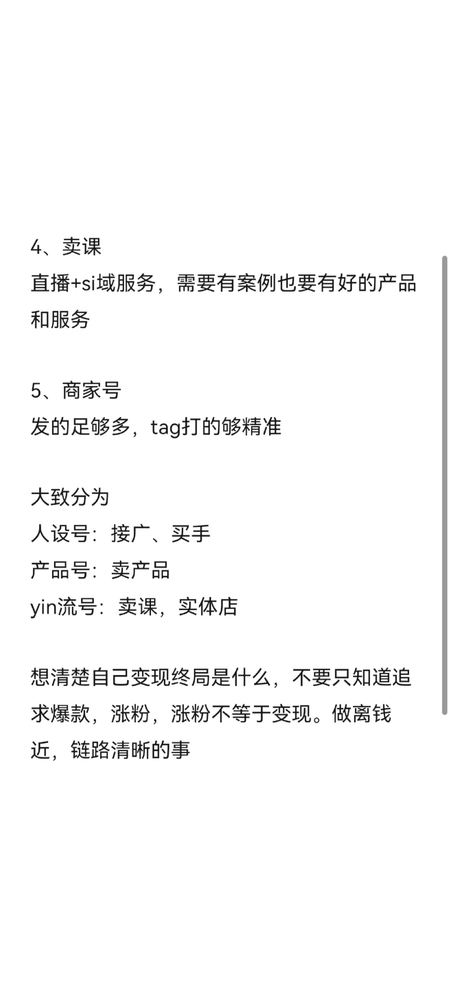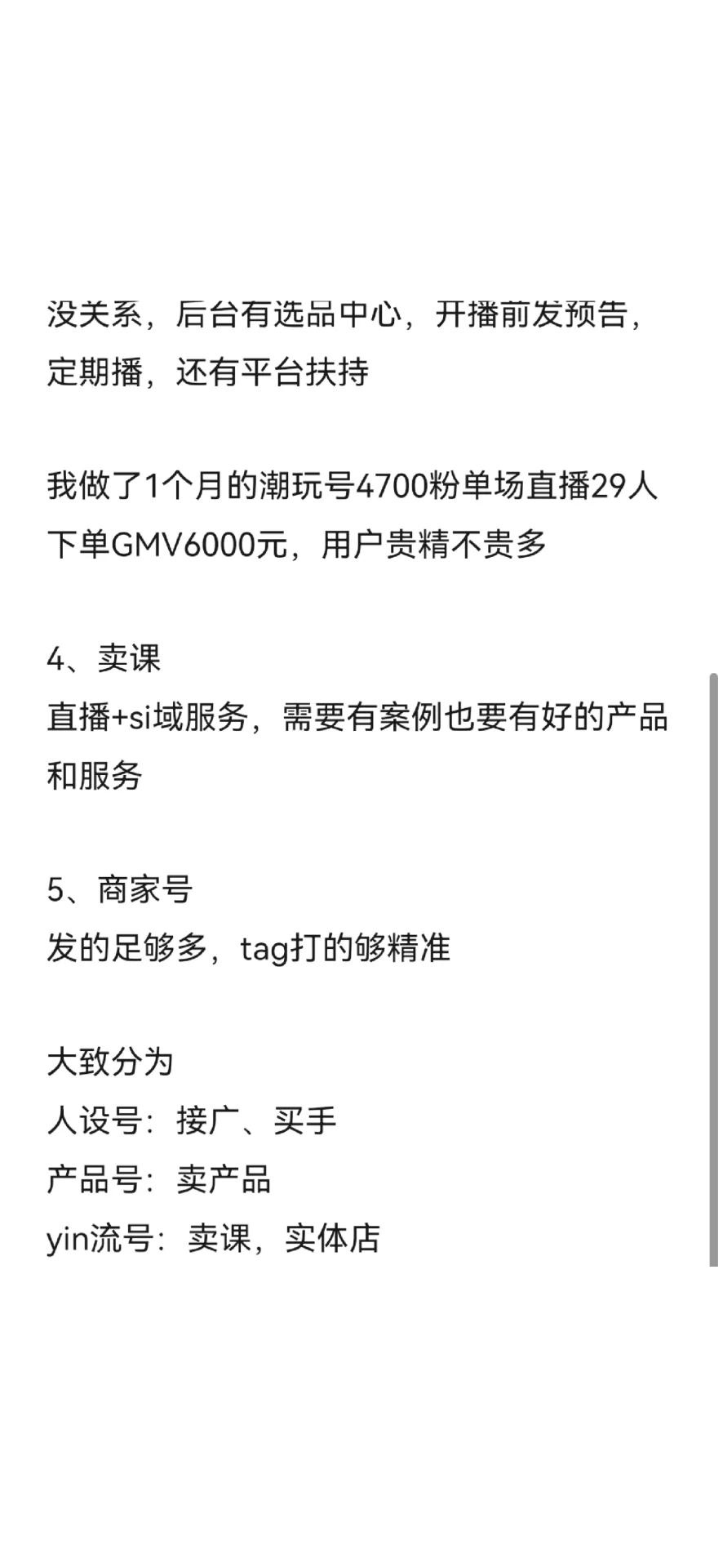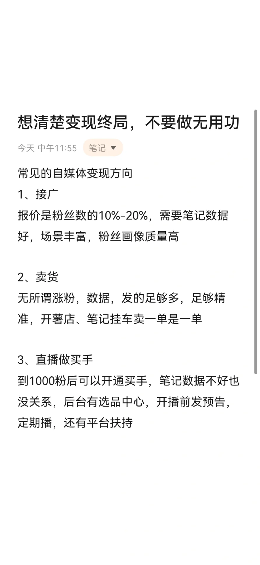 常見的自媒體貨幣化方向 1.接待 報價是粉絲數(shù)量的10%-20%,需要良好的筆記數(shù)據(jù)、豐富的場景和高質(zhì)量的粉絲畫像 - 2.銷售商品 增加你的追隨者并不重要。數(shù)據(jù)足夠充分和準(zhǔn)確。開一家土豆店并記筆記就像一次賣出一個訂單 - 3.作為買家的直播 在達(dá)到1000名追隨者后,可以打開買家。如果鈔票數(shù)據(jù)不好也沒關(guān)系。后臺有選品中心,開播前發(fā)送預(yù)覽,定時播出,平臺支持 我一直在做一個擁有4700名粉絲的潮流賬號的一個月直播,有19個人下了1000元的訂單。用戶擁有高質(zhì)量內(nèi)容的成本高嗎 - 4.課程銷售 直播+Si域服務(wù)既需要案例研究,也需要好的產(chǎn)品和服務(wù) - 5.商戶賬戶 發(fā)送足夠多,標(biāo)記足夠準(zhǔn)確 - 大致分為 人員ID:接待員、買家 產(chǎn)品編號:銷售產(chǎn)品 尹ID:賣課程、實體店 - 想清楚貨幣化的最終目標(biāo),不要只專注于追求流行產(chǎn)品和增加追隨者。增加追隨者并不意味著貨幣化。做一些接近金錢且有明確聯(lián)系的事情