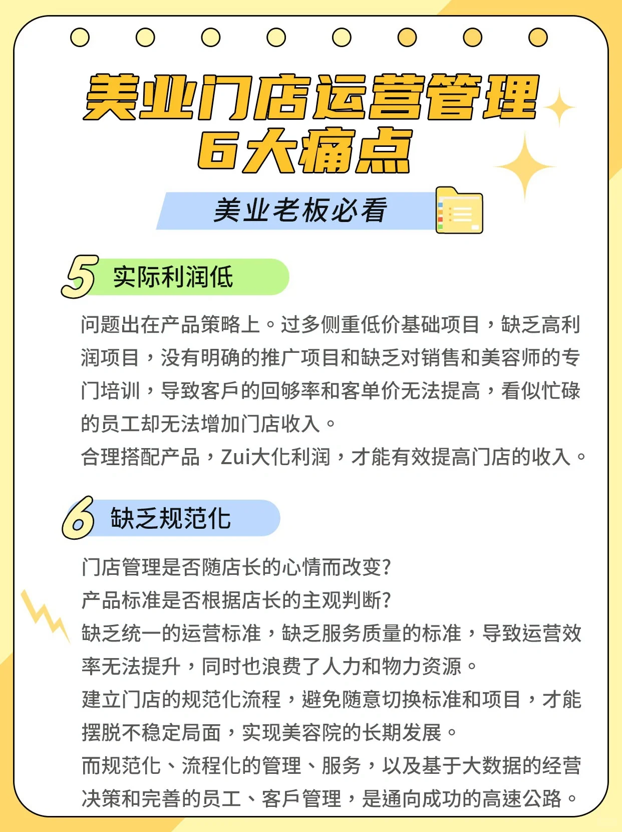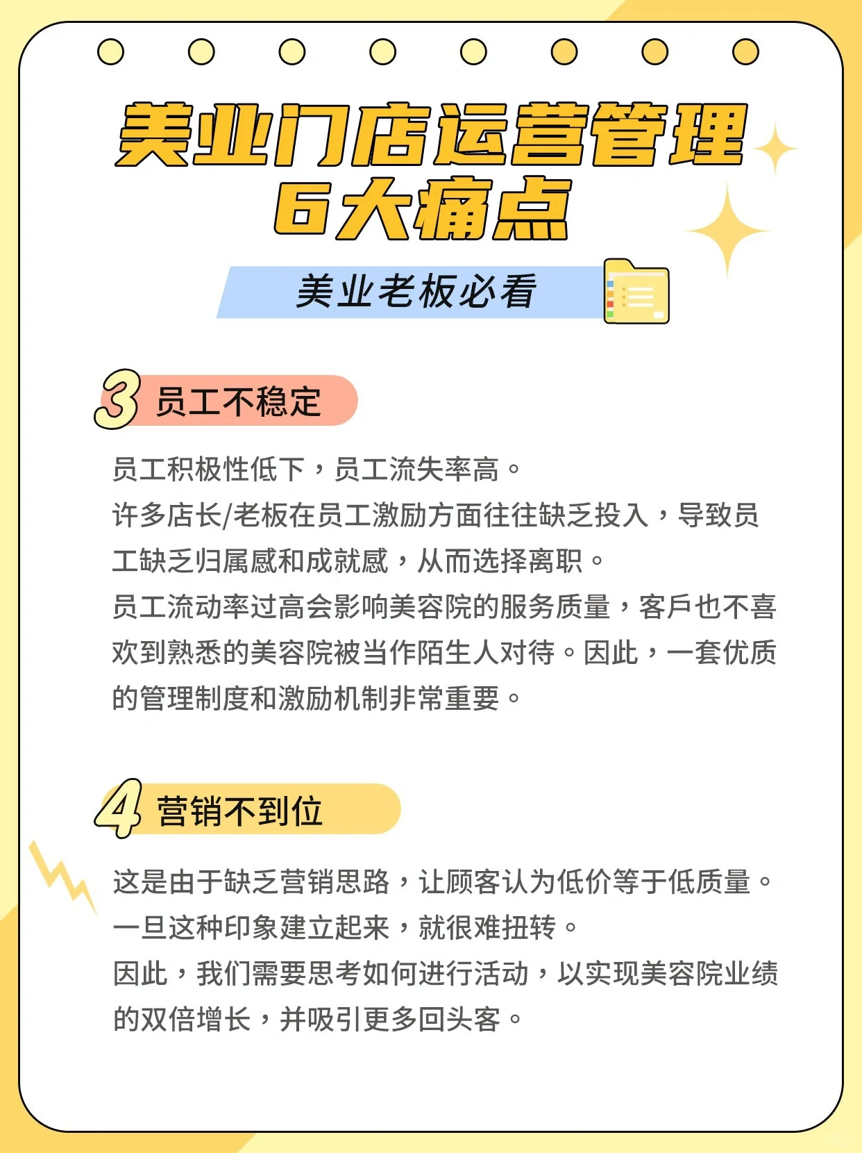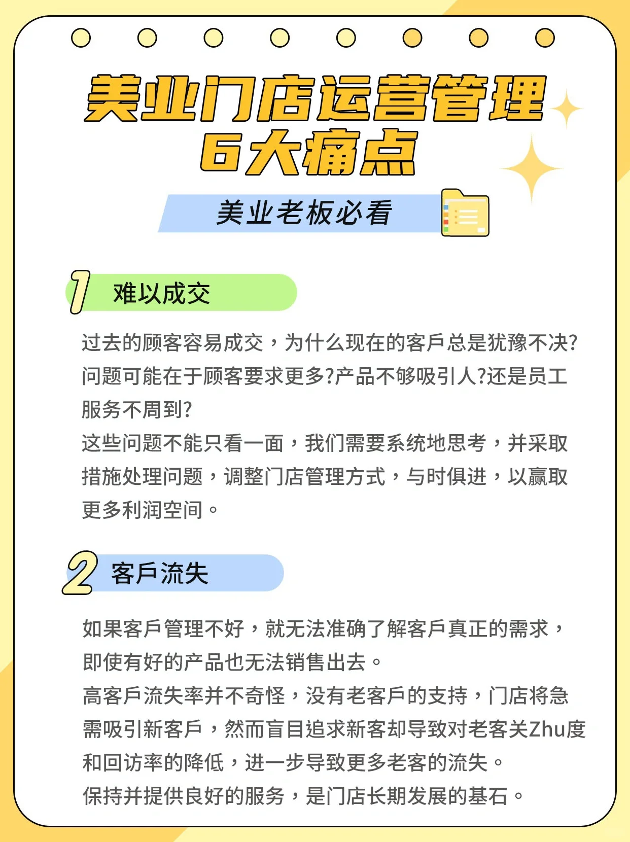 美容院和美容店在運營過程中會遇到問題 下面是商店運營中常見的6個痛點 所有美容行業(yè)的老板們,快來看看,希望對大家有所幫助 ① 客戶流失率低 ② 客戶流失率高 ③ 員工不穩(wěn)定 ④ 營銷不足 ⑤ 實際利潤低 ⑥ 店內缺乏標準化 總之,為了讓美容店經營得好,學會改進、更新、跟上時代是店主的必經之路! 無論是產品還是服務,他們都忽視了運營過程中遇到的痛點,沒有擁抱互聯網環(huán)境,導致大量客戶流失。掌握這些要點并不難!
