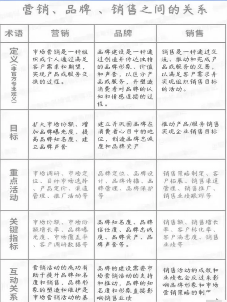 公司內(nèi)部可能有市場部、品牌部和銷售部,所有這些部門都經(jīng)常發(fā)生戰(zhàn)斗。那么,我們?nèi)绾螌崿F(xiàn)質(zhì)量與效率的融合,并將其與銷售業(yè)績緊密結(jié)合呢 首先,明確三者的關(guān)系和作用: 營銷是滿足用戶期望,實施銷售策略或活動支持,吸引客戶,提高銷售目標(biāo),搶占市場份額; 品牌是管理品牌資產(chǎn),傳播公司產(chǎn)品和形象,塑造用戶心智,提高品牌溢價,協(xié)助銷售打動客戶;銷售是利用品牌和產(chǎn)品優(yōu)勢解決用戶問題,推動產(chǎn)品或服務(wù)的收入表現(xiàn),實現(xiàn)公司目標(biāo)。最終,公司需要看到銷售業(yè)績。 建議將這三種方法結(jié)合起來: 1.常用,吸引客戶并將其交付給銷售部門 2.制定營銷和銷售策略(如新定價、渠道流量、渠道管理等),并統(tǒng)一投放市場 3.市場營銷活動,以銷售額發(fā)起市場銷售活動,設(shè)定目標(biāo),簽署任務(wù)書,高激勵。。。營造儀式感,線上線下同步 4.品牌和產(chǎn)品的營銷活動(如產(chǎn)品發(fā)布會、投資博覽會、展覽等) 5、針對營銷模式下的自媒體矩陣的構(gòu)建,突出其重要性。現(xiàn)在抖音等短視頻的流行讓目標(biāo)用戶更容易觸達(dá),這也是大多數(shù)公司必須要做、也想做好的項目。