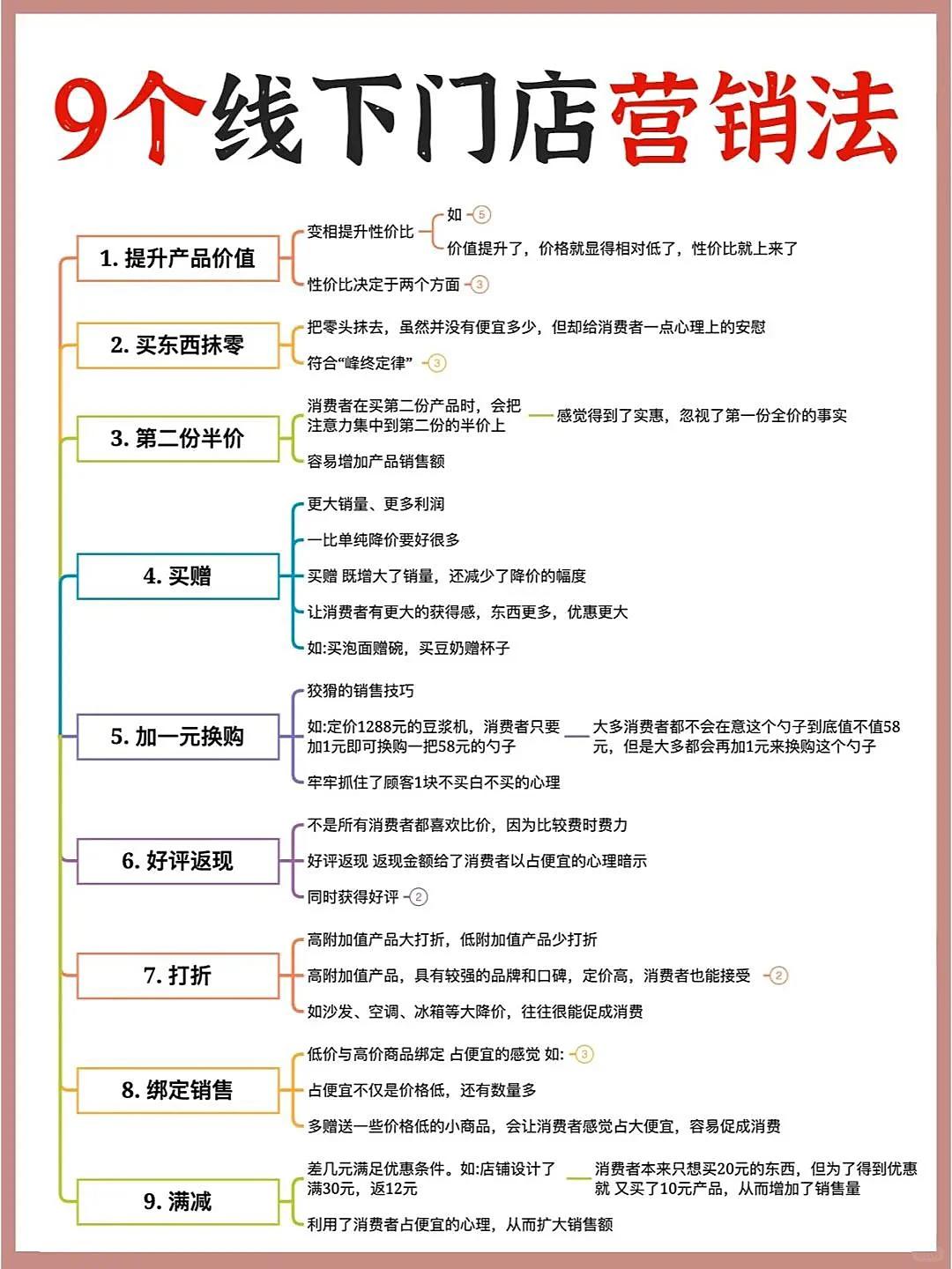 ? 9種方法,幫助你吸引流量,吸引客戶,提高口碑和重復(fù)購買率,使你的收入翻倍。 1.提升產(chǎn)品價(jià)值 2.買東西然后把它擦掉 3.下半價(jià) 4.作為禮物購買 5.購買加1元 6.正反饋返現(xiàn) 7.折扣 8.捆綁銷售 9.完全還原 如果你正在運(yùn)行一個(gè)離線商店,不要錯(cuò)過這些方法。
