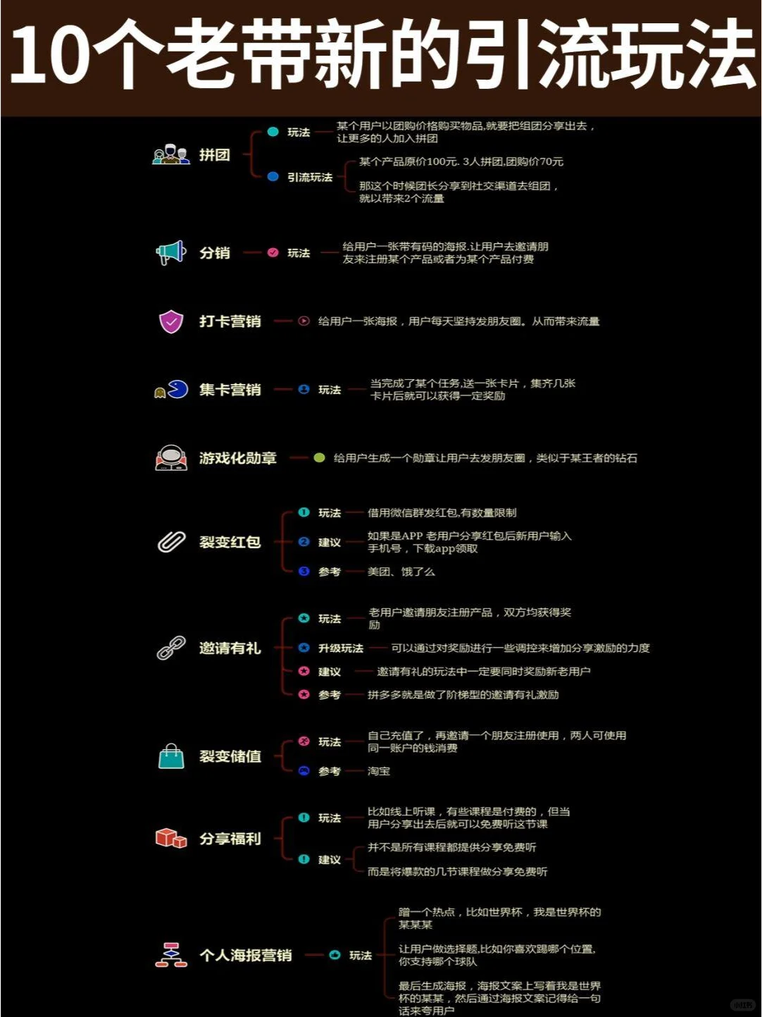 什么社交渠道的秘密武器:如何讓“老帶新”和雙產(chǎn)品流量 如何在社交渠道上運(yùn)用“以舊帶新”的策略,讓我們的產(chǎn)品或服務(wù)流量飆升! 什么首先,為什么要選擇“以舊帶新”的戰(zhàn)略因?yàn)槲覀兊闹覍?shí)用戶是最寶貴的資源!他們對產(chǎn)品有著深刻的理解,能夠更好地將產(chǎn)品準(zhǔn)確地傳達(dá)給新用戶。那么,我們?nèi)绾螌⒅覍?shí)的用戶轉(zhuǎn)化為最強(qiáng)大的推動(dòng)者呢這里有10個(gè)超級實(shí)用的游戲選項(xiàng),快來看看吧! 用戶分享計(jì)劃:鼓勵(lì)用戶分享他們的用戶體驗(yàn),并為新用戶的每一次成功推薦提供一定的獎(jiǎng)勵(lì)或折扣。 定期用戶活動(dòng):通過線上或線下的用戶聚會,老用戶可以帶來新朋友,一起參加活動(dòng)。 社交媒體挑戰(zhàn):在社交媒體平臺上發(fā)起有趣的挑戰(zhàn),鼓勵(lì)用戶參與,并邀請朋友加入。 用戶故事專欄:在社交媒體平臺上分享老用戶的成功故事或使用體驗(yàn),讓潛在客戶看到產(chǎn)品的真實(shí)效果。 會員制:為現(xiàn)有用戶提供會員服務(wù),享受特別折扣和優(yōu)先權(quán),增加他們吸引新用戶的動(dòng)力。 互動(dòng)問答:在社交媒體平臺上組織問答活動(dòng),鼓勵(lì)用戶分享他們使用產(chǎn)品的經(jīng)驗(yàn)和見解。 用戶反饋收集:讓用戶參與到產(chǎn)品改進(jìn)的過程中,增強(qiáng)他們的歸屬感和推薦熱情。 專屬定制獎(jiǎng)勵(lì):針對不同用戶群體設(shè)計(jì)專屬獎(jiǎng)勵(lì)計(jì)劃,滿足其個(gè)性化需求。 合作伙伴計(jì)劃:與其他品牌或平臺合作,通過相互推廣擴(kuò)大用戶基礎(chǔ)。 ? 內(nèi)容營銷:定期發(fā)布優(yōu)質(zhì)內(nèi)容,吸引用戶分享,自然帶來新流量。 什么通過使用這些“以舊帶新”的策略,你會發(fā)現(xiàn)產(chǎn)品流量飆升并不困難!只要策略得當(dāng),用戶就是你最好的推送!